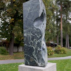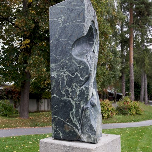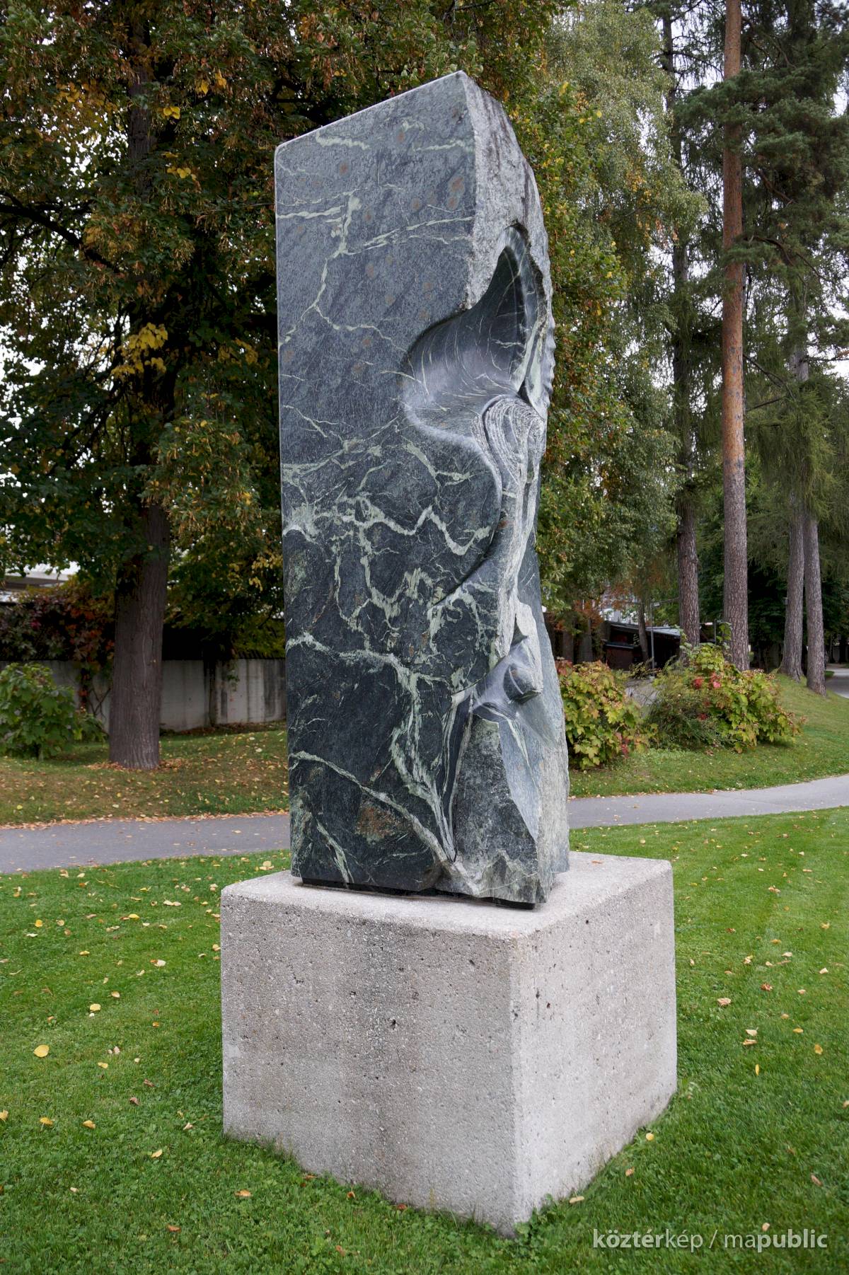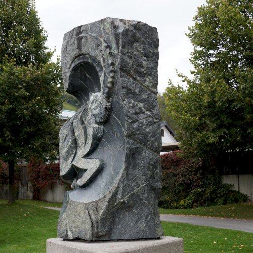 Kisebb műkő talapzaton, hatalmas körülbelül 4-5 méter magas zöld szerpentin oszlopból faragott kőszáli kecskebak ugrik éppen a magasból. Vaskos ívelt szarva félhold alakú. Fejét előre hajtva lábait ugrásra készen, nagy lógó szakállal ábrázolta a művész. A durva és finom csiszolás, kidolgozás, fényessé és mattá teszi a felületet. A kőzet világos csíkjai kiemelik a testet a háttérből. Esőben fotóztam így a felülete itt-ott nedves volt.