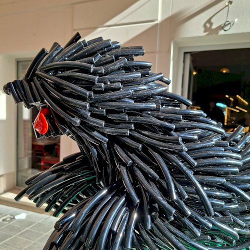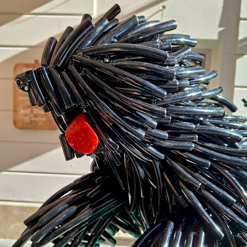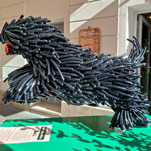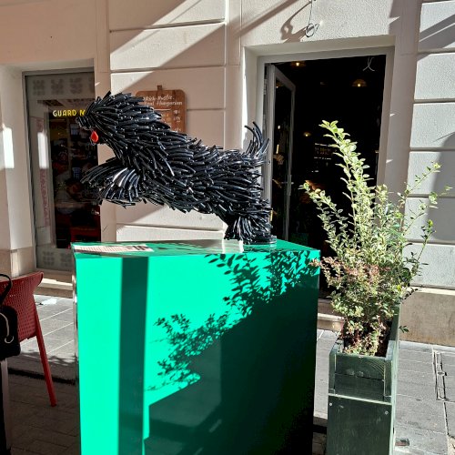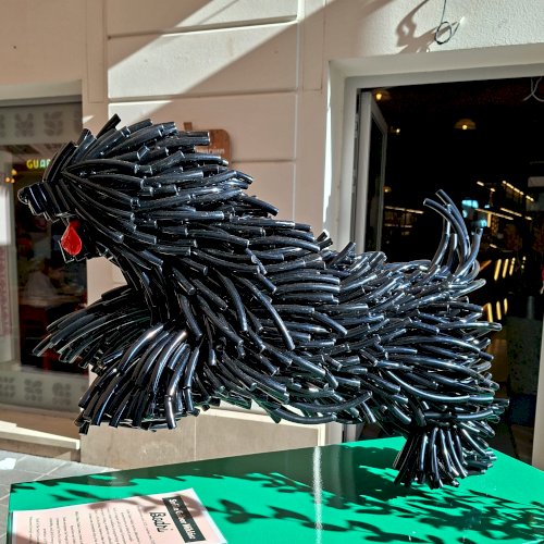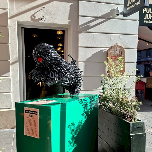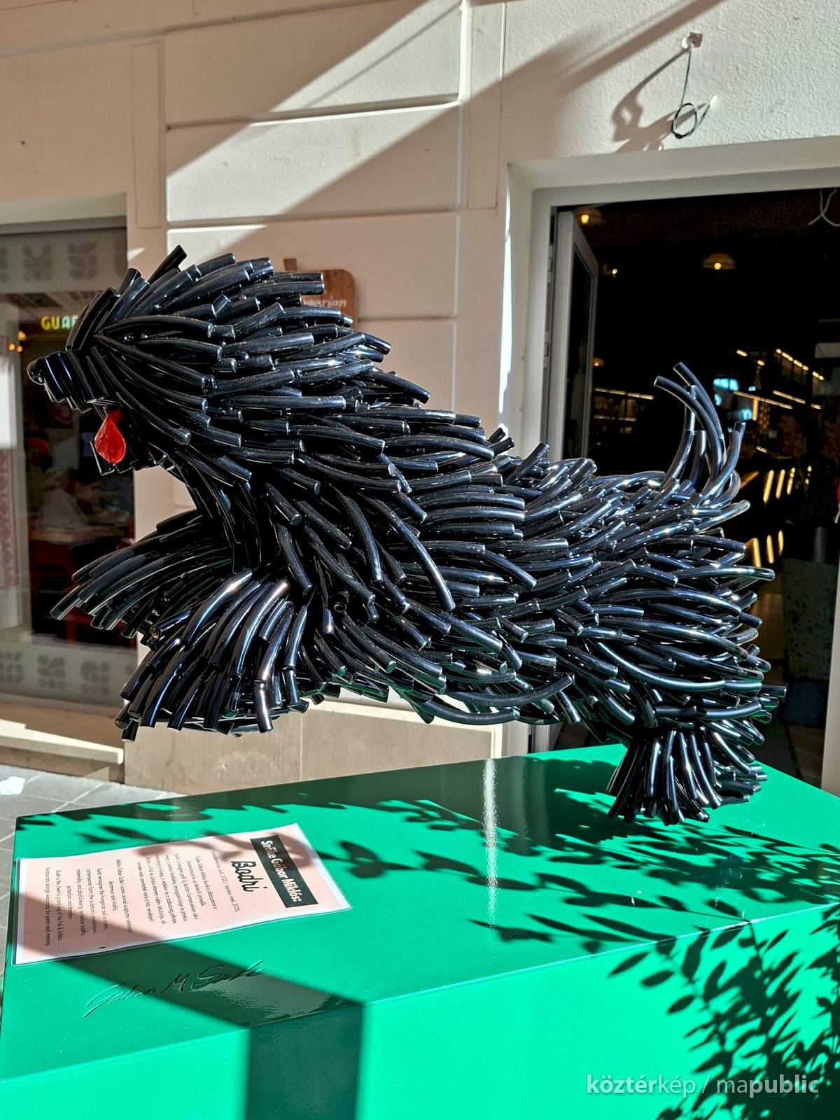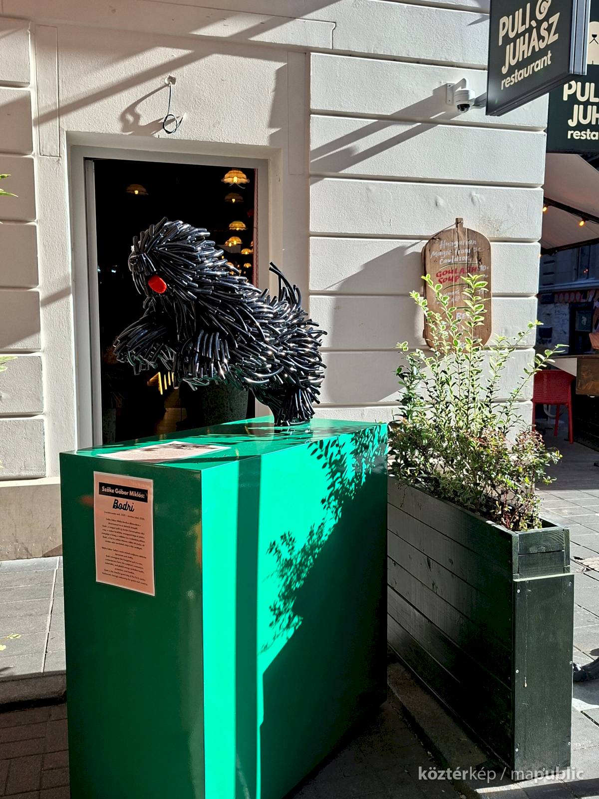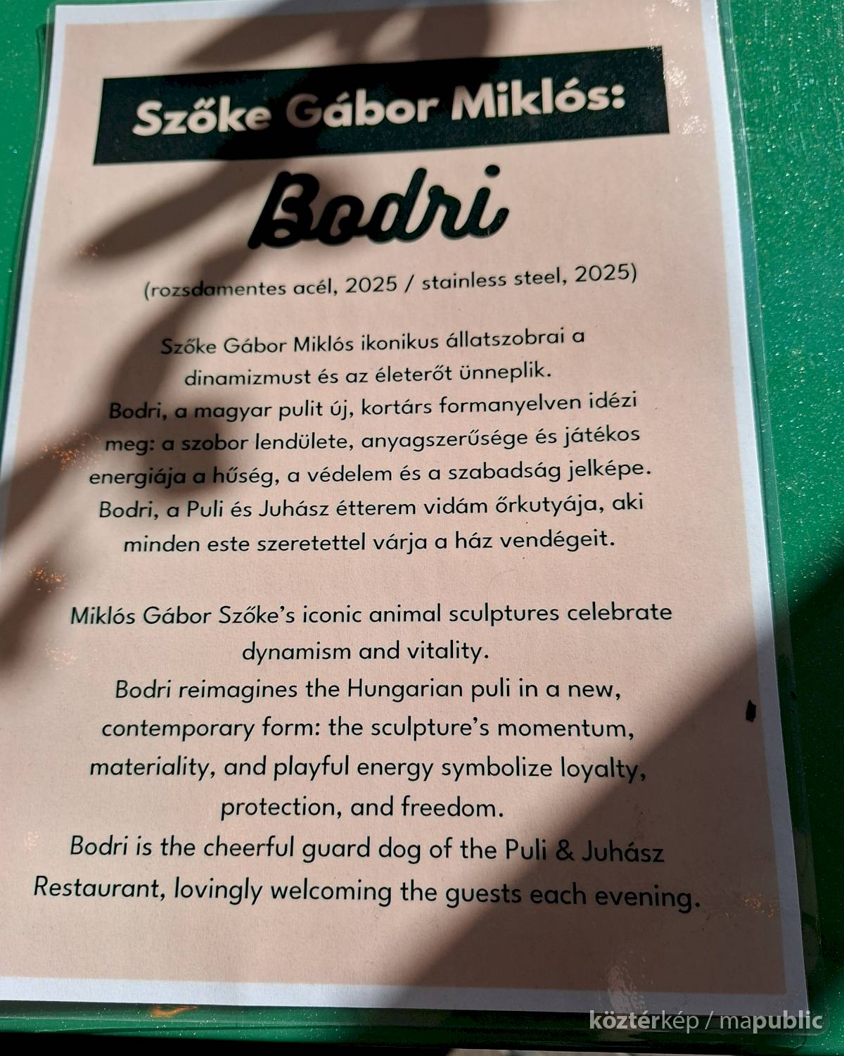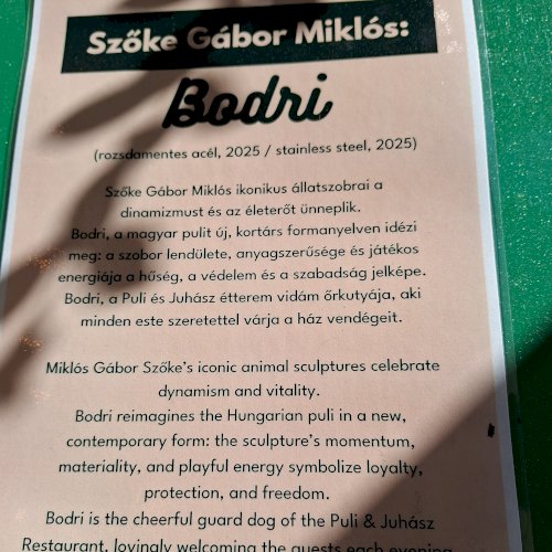 „Szőke Gábor Miklós ikonikus állatszobrai a dinamizmust és az életerőt ünneplik. Bodri, a magyar pulit új, kortárs formanyelven idézi meg: a szobor lendülete, anyagszerűsége és játékos energiája a hűség, a védelem és a szabadság jelképe.” – olvasható a szobor talapzatára kiragasztott ismertetőn.