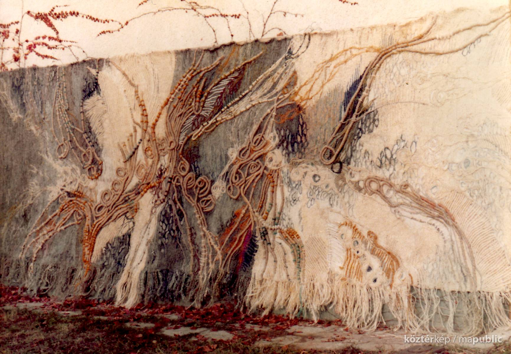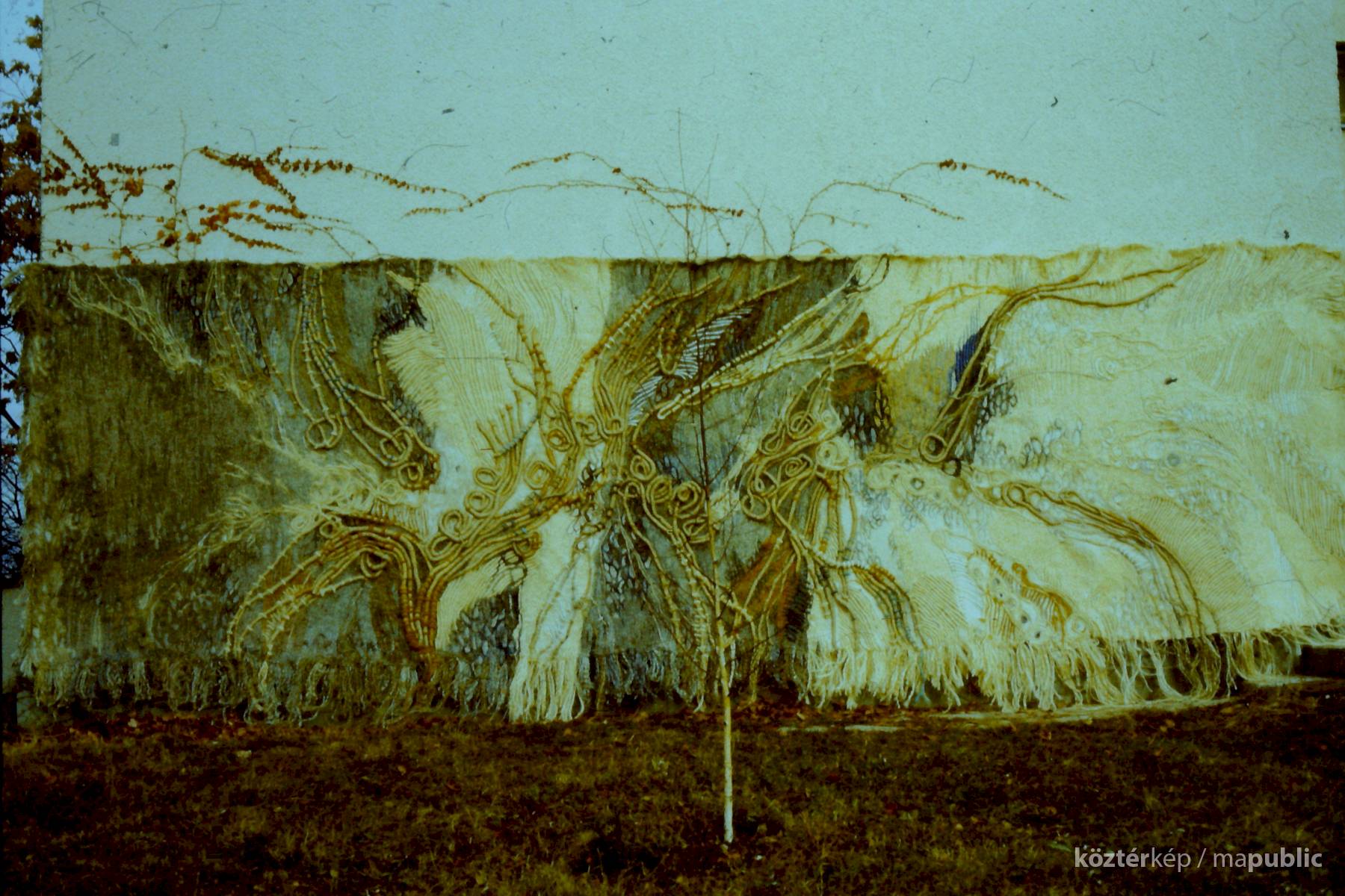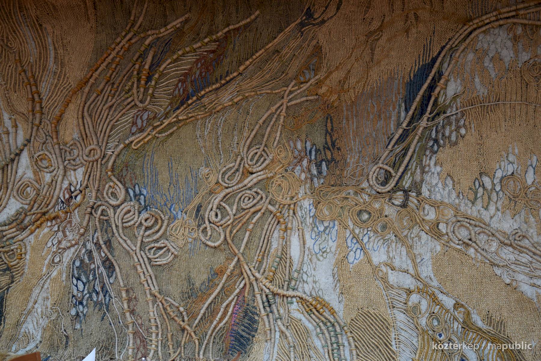 A kárpit mérete 720x260cm szabad láncon szövött és csomózott szizál és gyapjú, a készítés éve 1986.