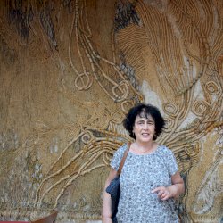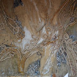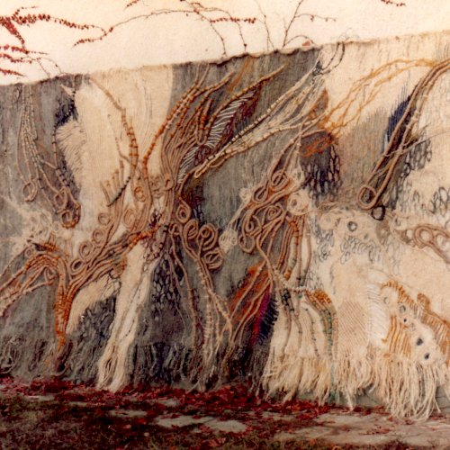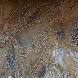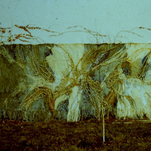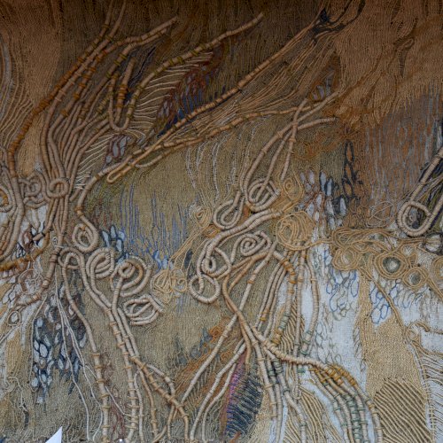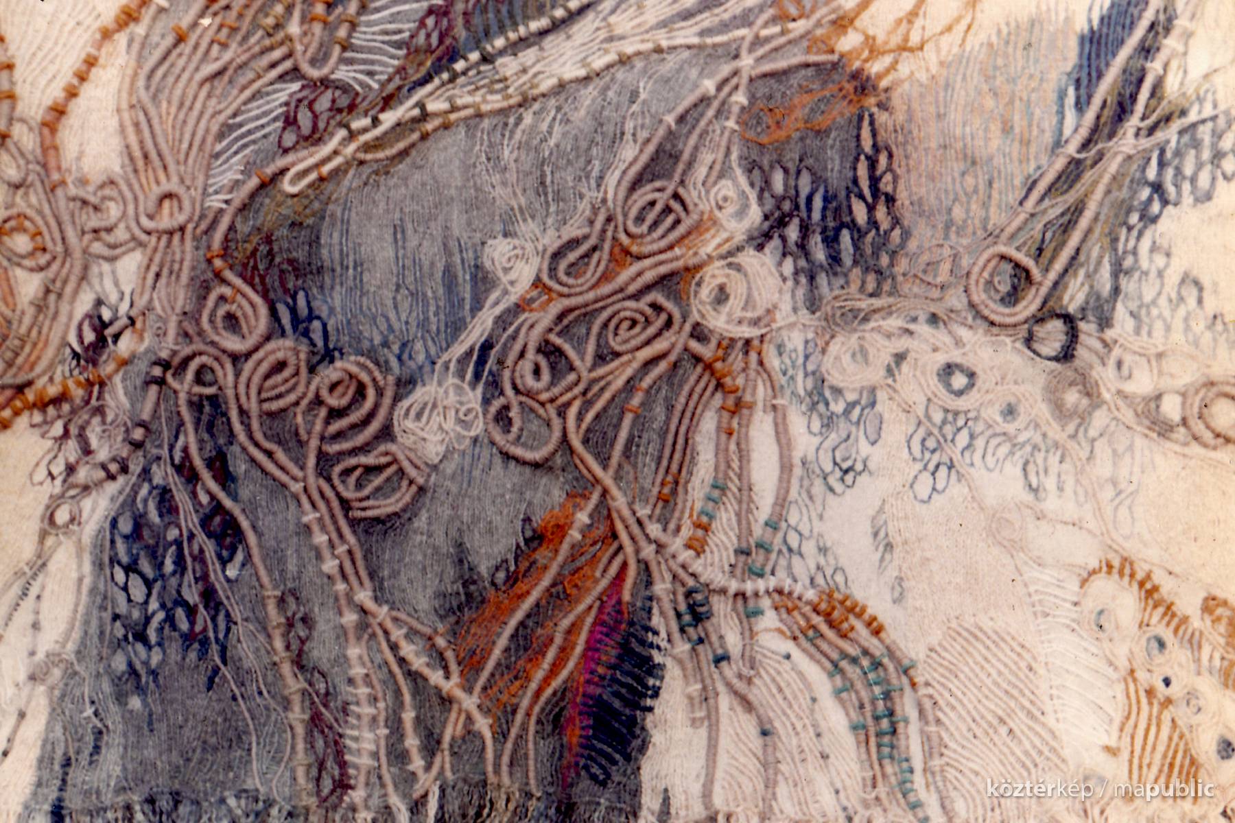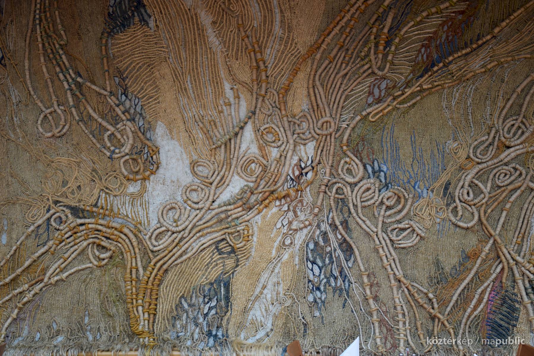 A kárpit mérete 720x260cm szabad láncon szövött és csomózott szizál és gyapjú, a készítés éve 1986.