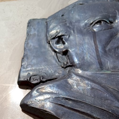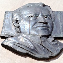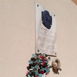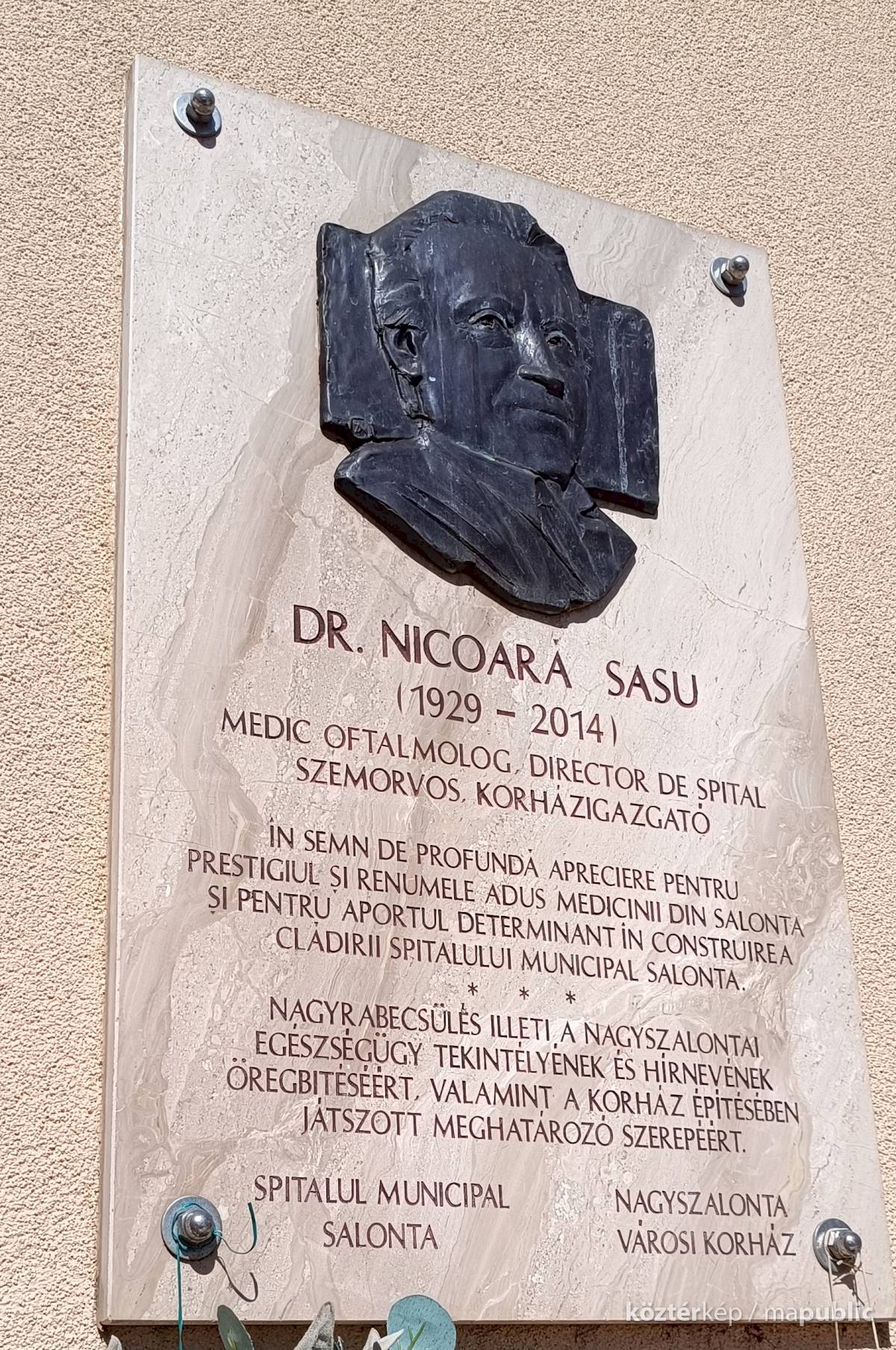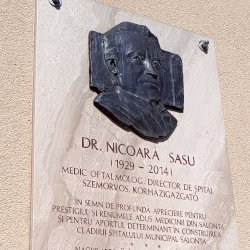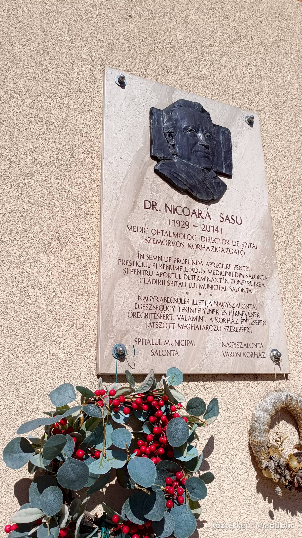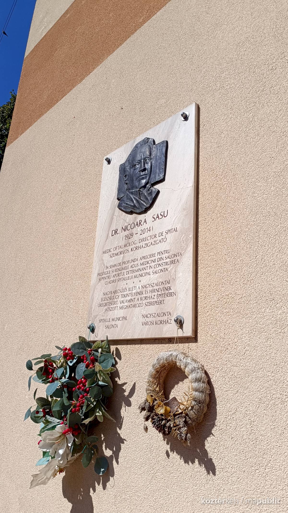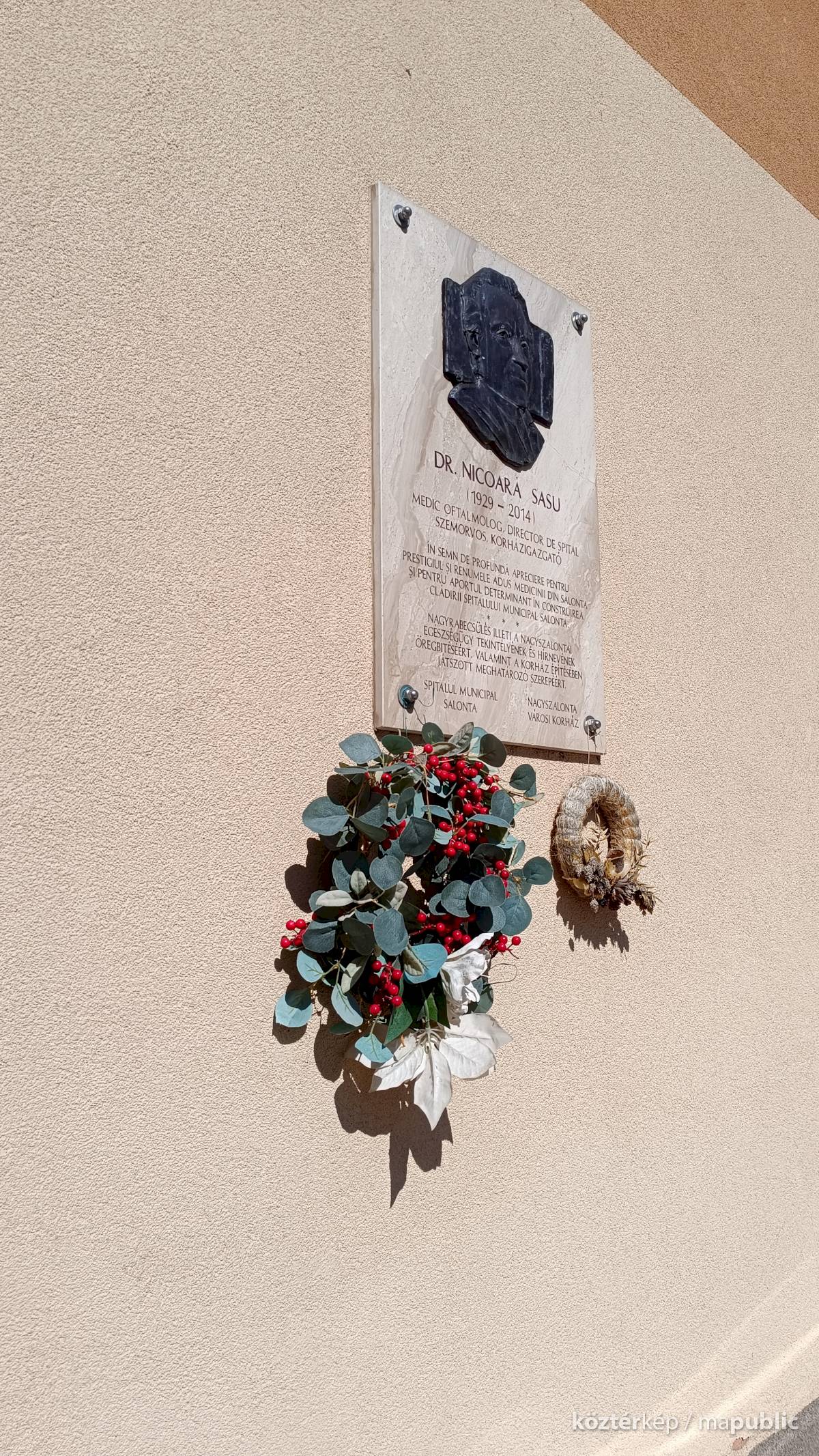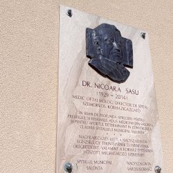 A főorvosra emlékezve, domborműves emléktáblát lepleztek le, az általa vezetett városi kórház új szárnyának külső homlokzatán. A rózsaszínű mintás gránit tábla felső harmadán látható a bronz dombormű, mely a főorvos vállig öltönyben ábrázolja oldalra néz. Érdekes megoldás, a fej mögötti tábla szerű téglalap, rajta az alkotói szignó. A portré alatt két nyelven, románul és magyarul emlékező szöveg olvasható.