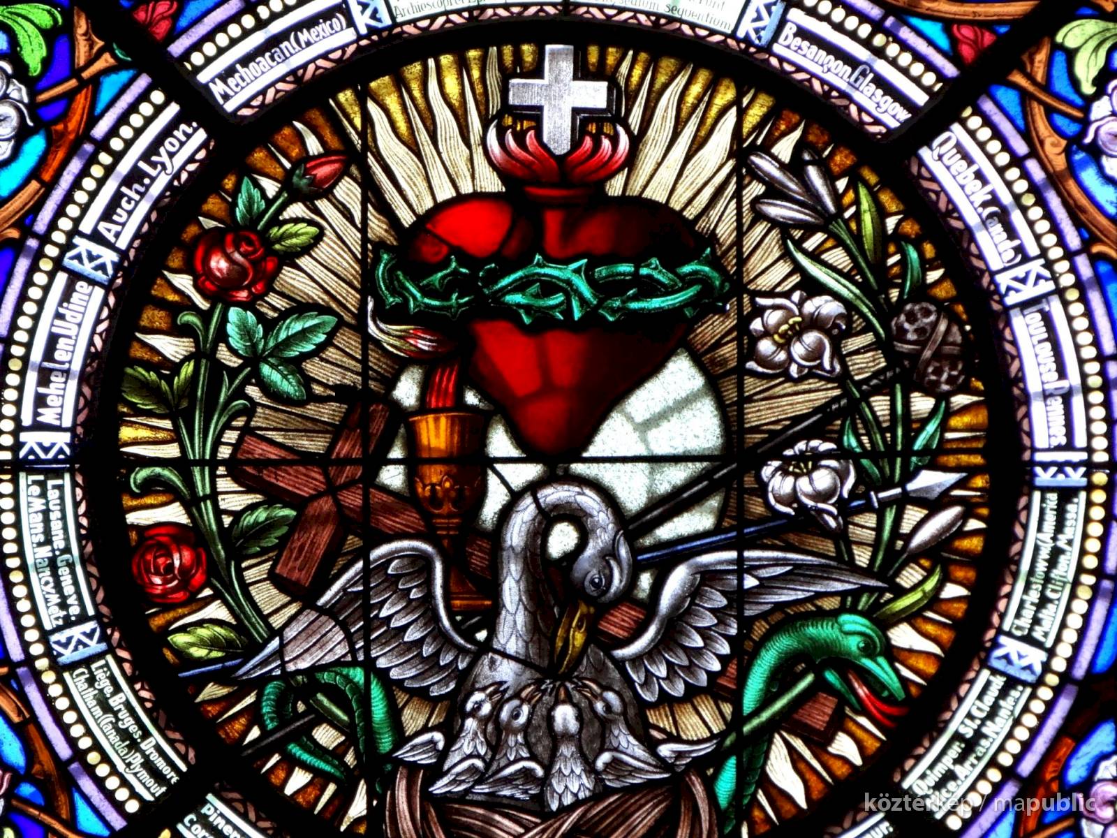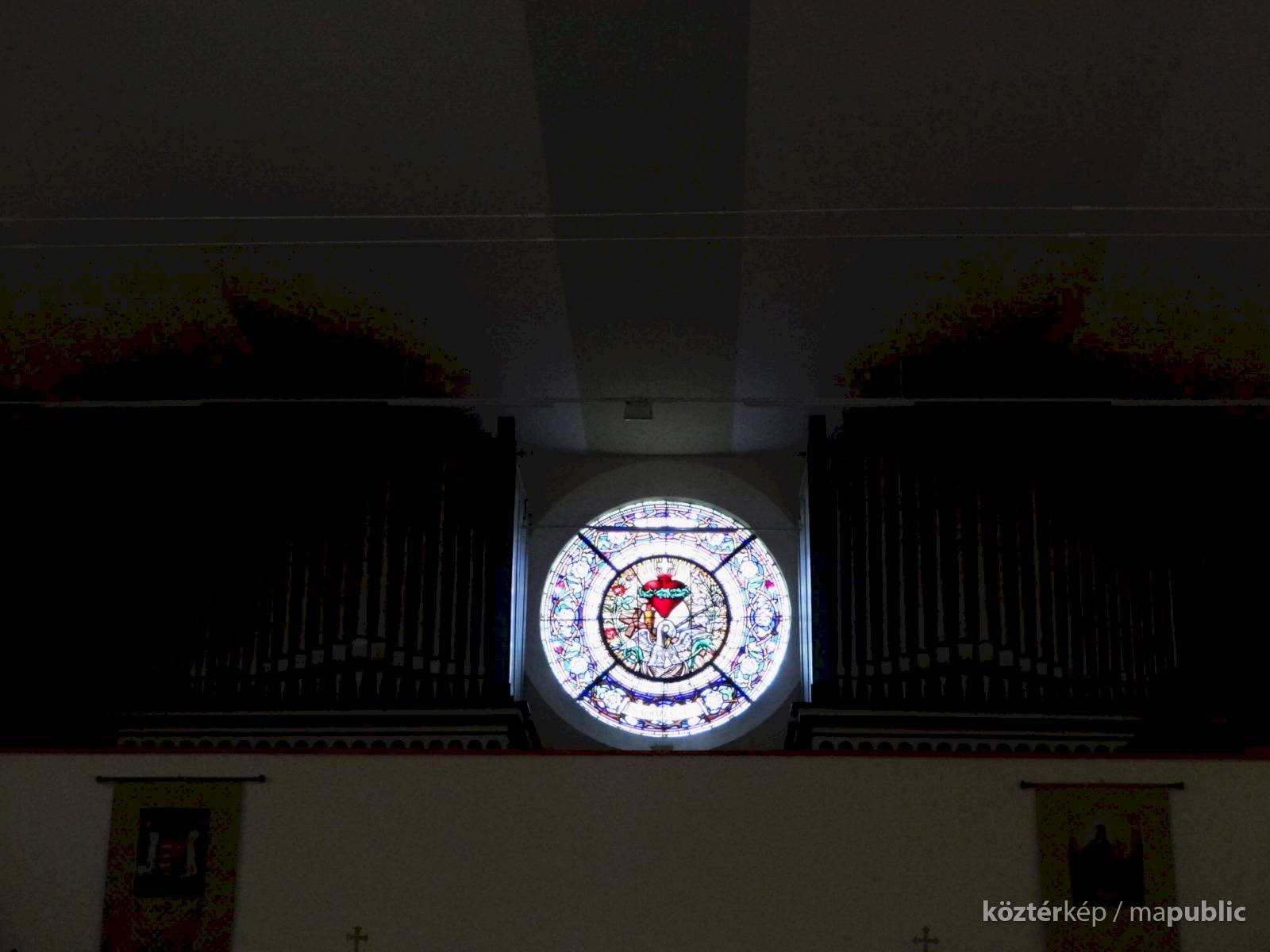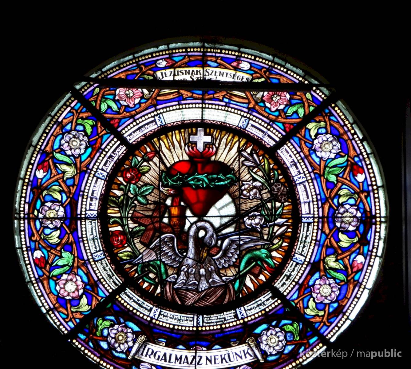 „A templom legnagyobb és legfőbb fő ablakának a 210 cm átmérőjű nagy körablaknak a templom homlokzatán, a temp-lom címerét, vagyis Jézus Szent Szívét kell, hogy magán viselje. Jézus Szent Szívét az 1765-ből származó imakönyv képe alapján ábrázoltuk. A töviskoronával övezett szív, lándzsa okozta sebéből egy csepp vér és víz folyik egy kehelybe. A szívből az isteni szeretet lángjai törnek elő, mely lángokból a megváltás jelvénye a kereszt emelkedik ki, mint az isteni szeretetből fakadt felbecsülhetetlen ajándék a bűnös ember számára. A Szent Szív alatt a kereszt, a lándzsa és az epével átitatott szivacs, valamint a fi ókáit saját véré-vel tápláló főnix madár és a kígyó látható. Ezt a képet balról egy piros rózsaág, mint a szeretet, jobbról pedig egy fehér liliomszál, mint a tiszta ártatlanság szimbóluma keretezi.”