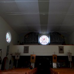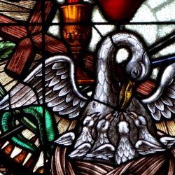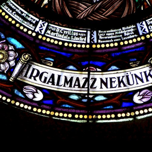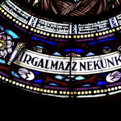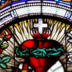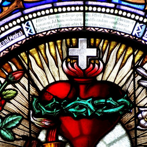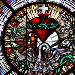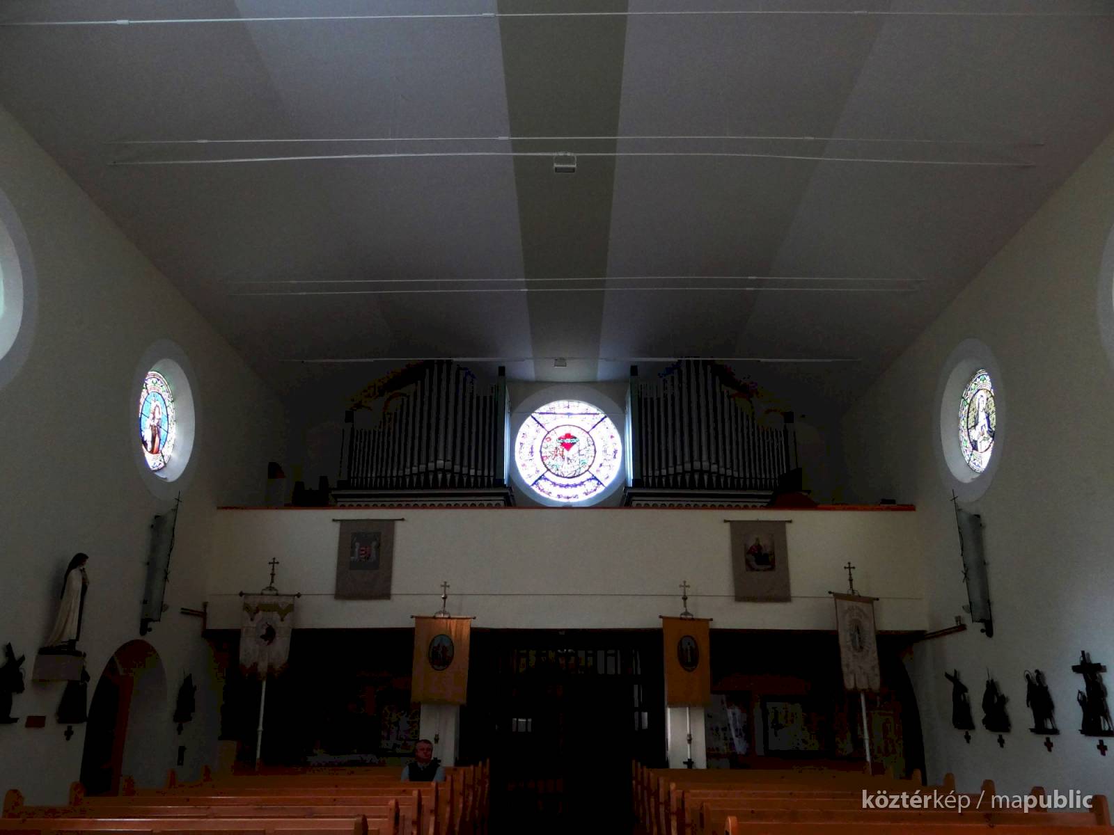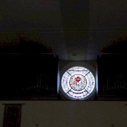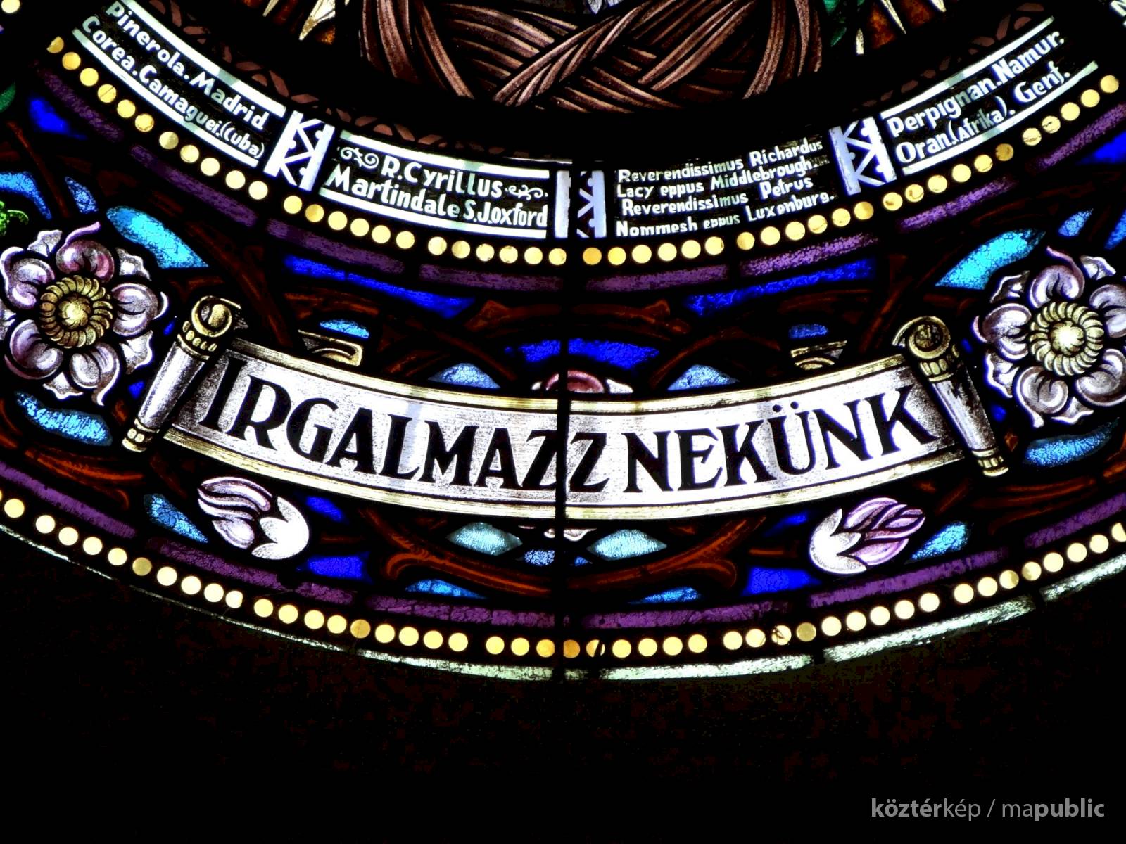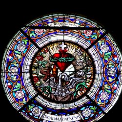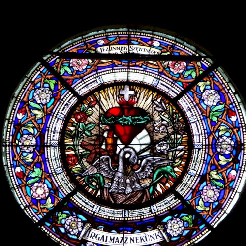„A templom legnagyobb és legfőbb fő ablakának a 210 cm átmérőjű nagy körablaknak a templom homlokzatán, a temp-lom címerét, vagyis Jézus Szent Szívét kell, hogy magán viselje. Jézus Szent Szívét az 1765-ből származó imakönyv képe alapján ábrázoltuk. A töviskoronával övezett szív, lándzsa okozta sebéből egy csepp vér és víz folyik egy kehelybe. A szívből az isteni szeretet lángjai törnek elő, mely lángokból a megváltás jelvénye a kereszt emelkedik ki, mint az isteni szeretetből fakadt felbecsülhetetlen ajándék a bűnös ember számára. A Szent Szív alatt a kereszt, a lándzsa és az epével átitatott szivacs, valamint a fi ókáit saját véré-vel tápláló főnix madár és a kígyó látható. Ezt a képet balról egy piros rózsaág, mint a szeretet, jobbról pedig egy fehér liliomszál, mint a tiszta ártatlanság szimbóluma keretezi.”