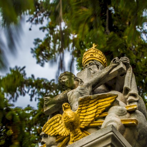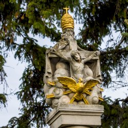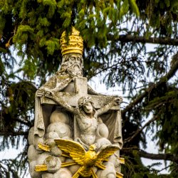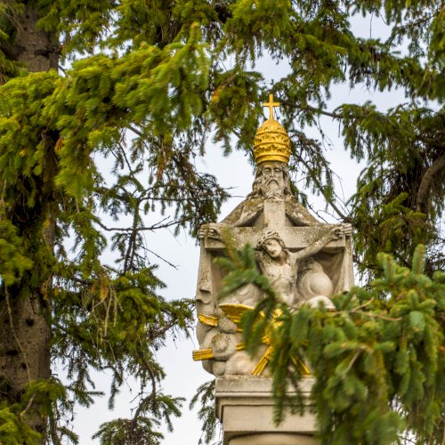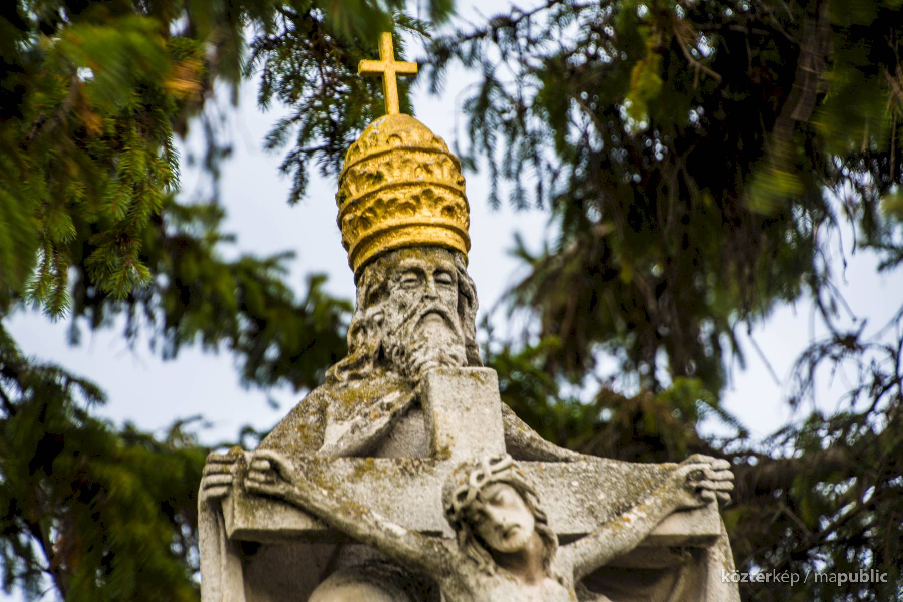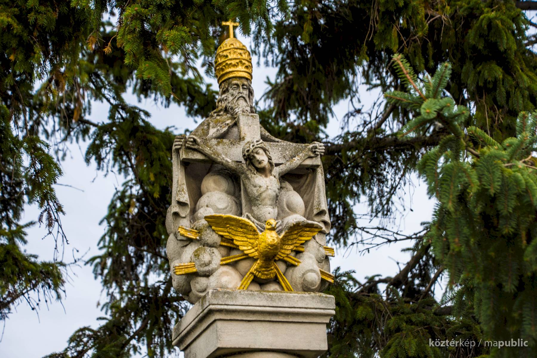 Az Atya kereszttel díszített hármas koronával (tiara) ábrázolt, kezében tartja a kereszten függő egyszülött fiát, a világot megváltó megfeszített Krisztust. Az égből alászálló Szentlelket kiterjesztett szárnyú galamb képében látjuk.
