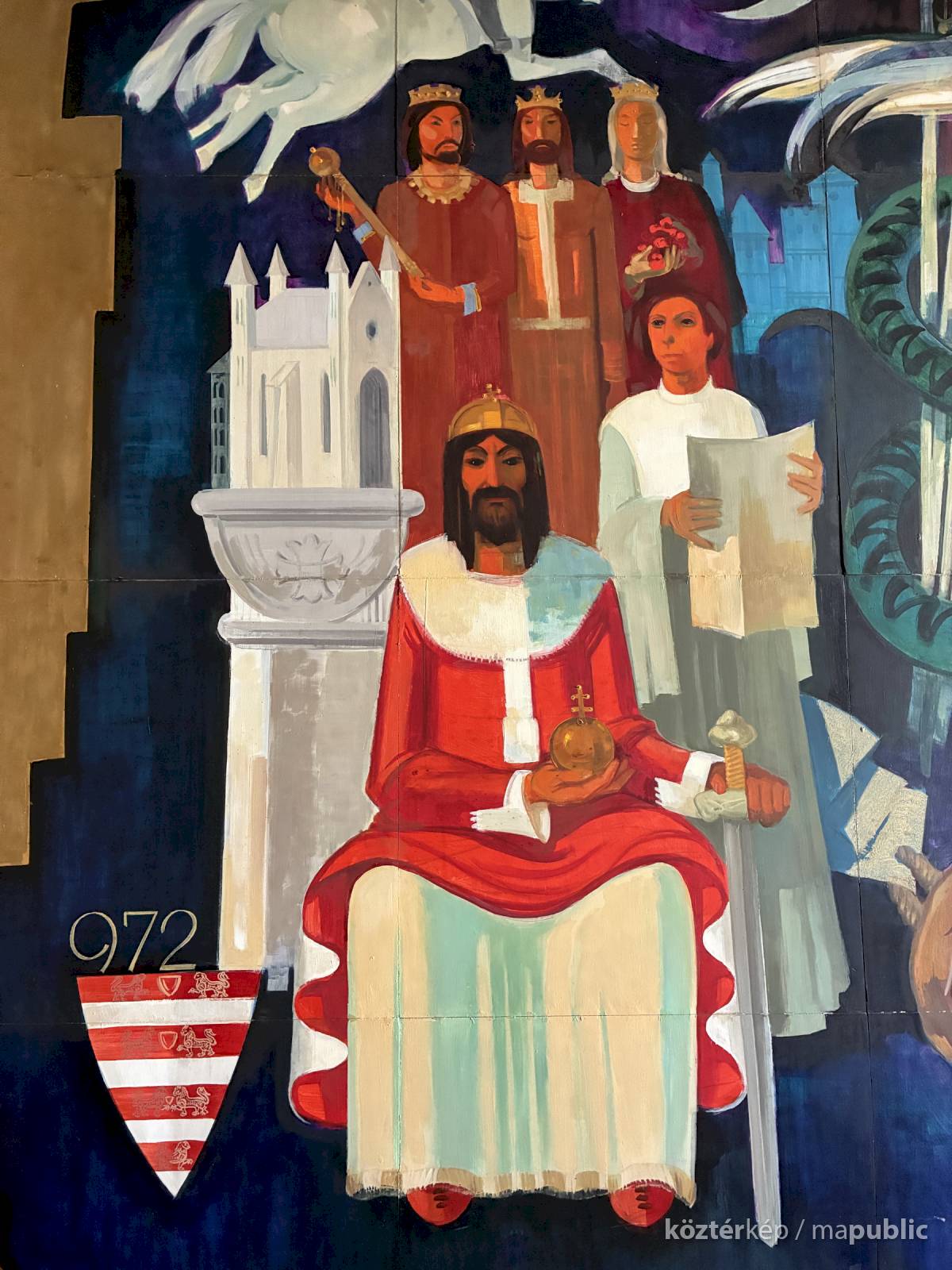 A pannó bal oldala a magyar államiság és a kereszténység megszületését jeleníti meg. A bal alsó sarokból indulva az Árpád-sávos pajzs és a „972” évszám látható, mely a Géza fejedelem általi városalapításra utal. Ezt követően a trónon ülő Szent István látható, kezében az országalmával és egy karddal, az államalapítás jelképeként. Mögötte további királyalakok tűnnek fel, akik a királyi hatalom folytonosságát és a koronázóváros központi szerepét jelképezik, egyikük kezében a jogar is látható. Az uralkodókat és történetírót a koronázó bazilika és a háttérben lévő vár öleli körbe. A krónikás mögött a pannó középső részén alul egy fontos királyi okirat, melynek nagyméretű függőpecsétjén: „1222” évszám olvasható, utalva a székesfehérvári országgyűlésen II. András által kiadott Aranybullára.