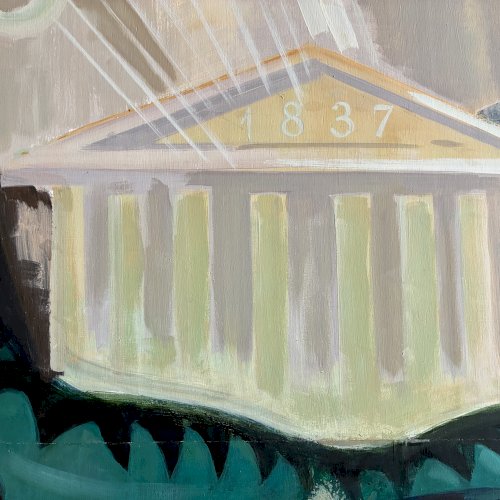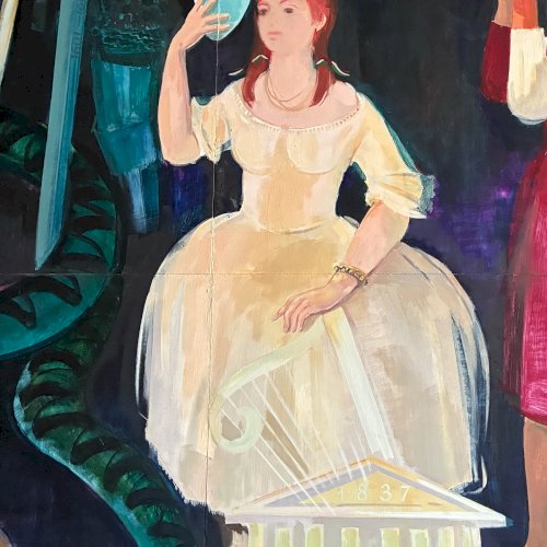 Jobbra haladva egy fehérruhás ülő nőalak, aki a kultúra és művészet megszemélyesítője. Egyik kezében színházi maszkot tart, másikat egy hárfán pihenteti. Előtte klasszicista, oszlopos épület látható az „1837” évszámmal – mely a magyar színháztörténetben a folyamatos magyar nyelvű színjátszás kezdete. A nőalak így a város szellemi újjászületésének ikonja.