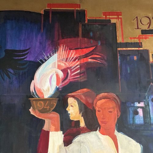 A pannó jobb oldala a 20. század tragédiáit és újjászületését foglalja össze. Az alul látható rohamsisak, töltények, szögesdrót és romok a világháborúk elszomorító pusztítását idézik, az „1945” évszám pedig a felszabadulás évére utal. A romok fölött fiatal férfi és nőalak áll: a munka, tudás és jövő emberei. Tőlük jobbra kettő fémhenger, a mű felső részén pedig panelházak és toronyépületek tűnnek fel – a modern Székesfehérvár ipari és lakótelepi fejlődésének jelképei. A kompozíciót a jobb felső sarokban az „1972” évszám zárja, jobbra alul a művész szignója és a készítés évszáma: ÁRON 72.