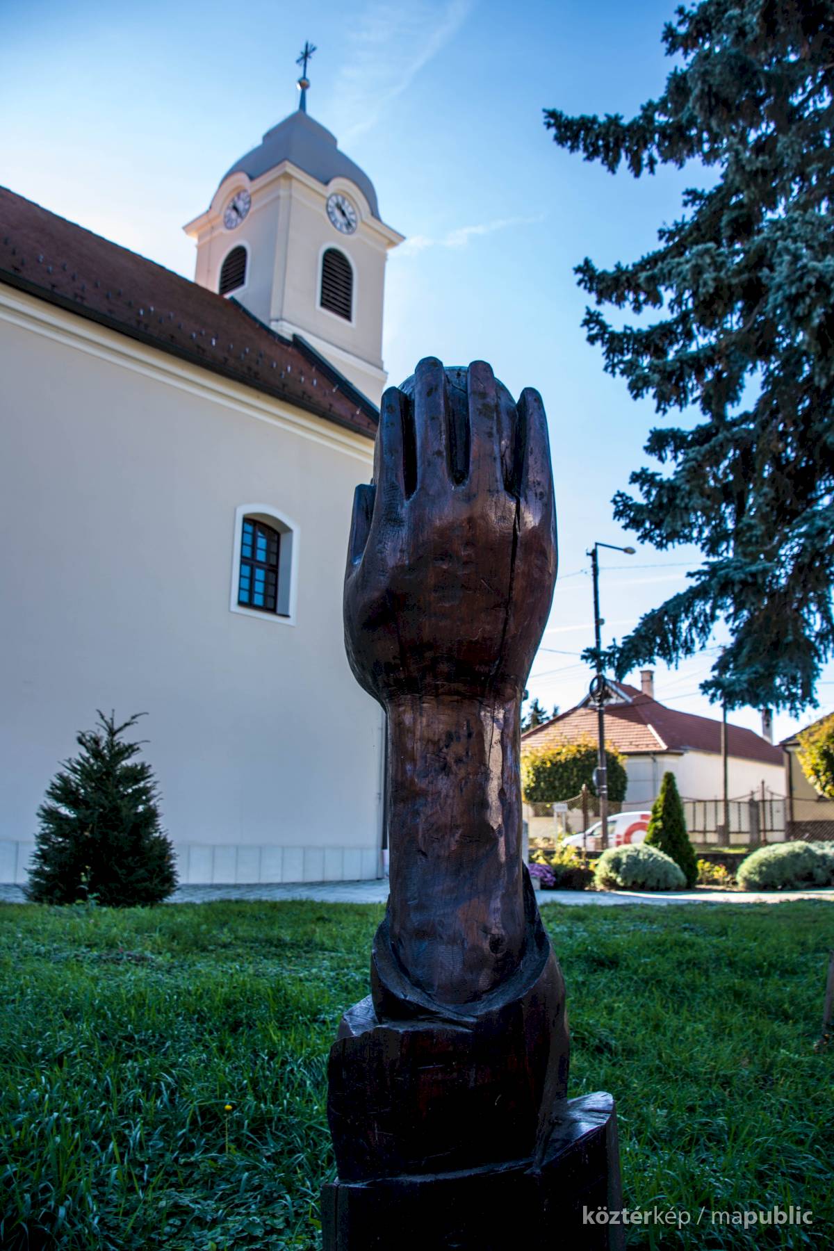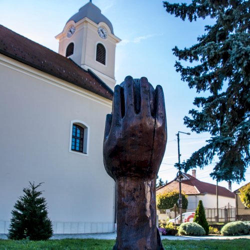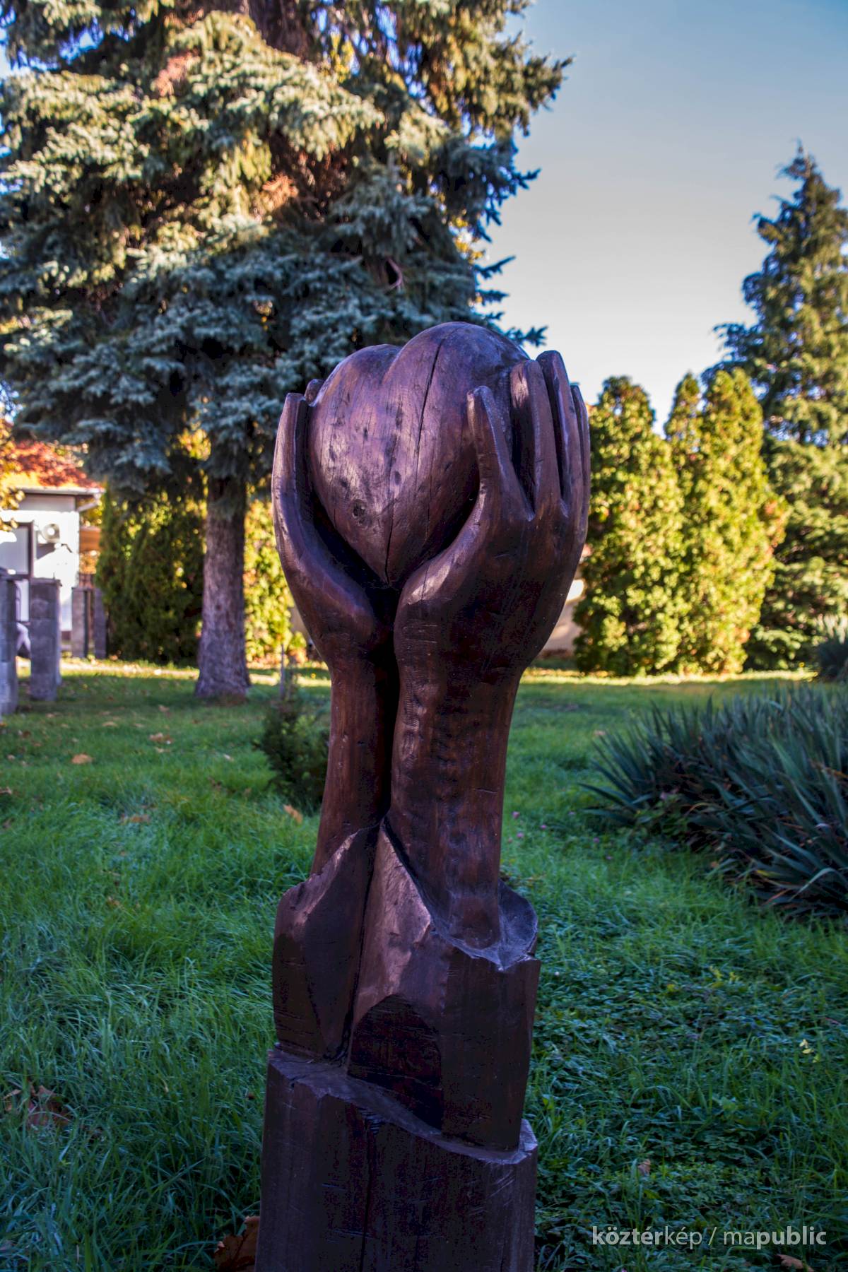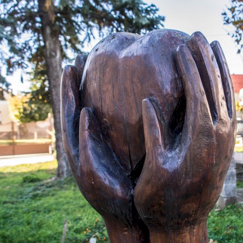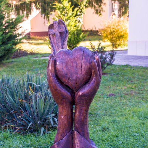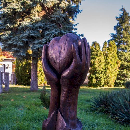 Ilyen a templom mellett látható szobor: a szívet kezek emelik a magasba.