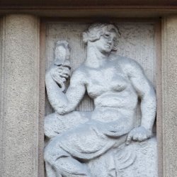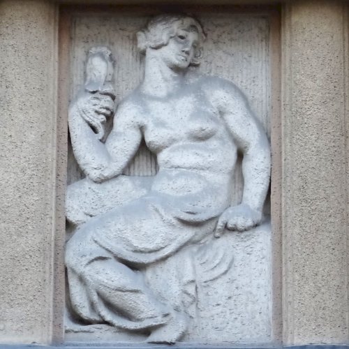 Az épület érdekes, szemből nézve teljes asszimetria, jobbra domborművek. Ezek pedig részben egybevágó figurákat mutatnak, vagy inkább nem értem az elhelyezés logikáját. Az igazság, nem azonosak a figurák, mert a kidolgozásba gondos kezek eltéréseket formáltak. Tk. így három-három alakot látunk, férfiak és nők, de akkor is furcsának érzem a sorrendet. Pedig a korabeli fotó igazolja, ebben nincs változás.