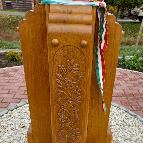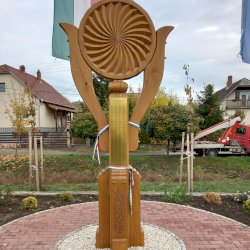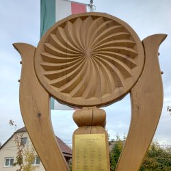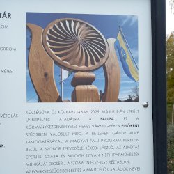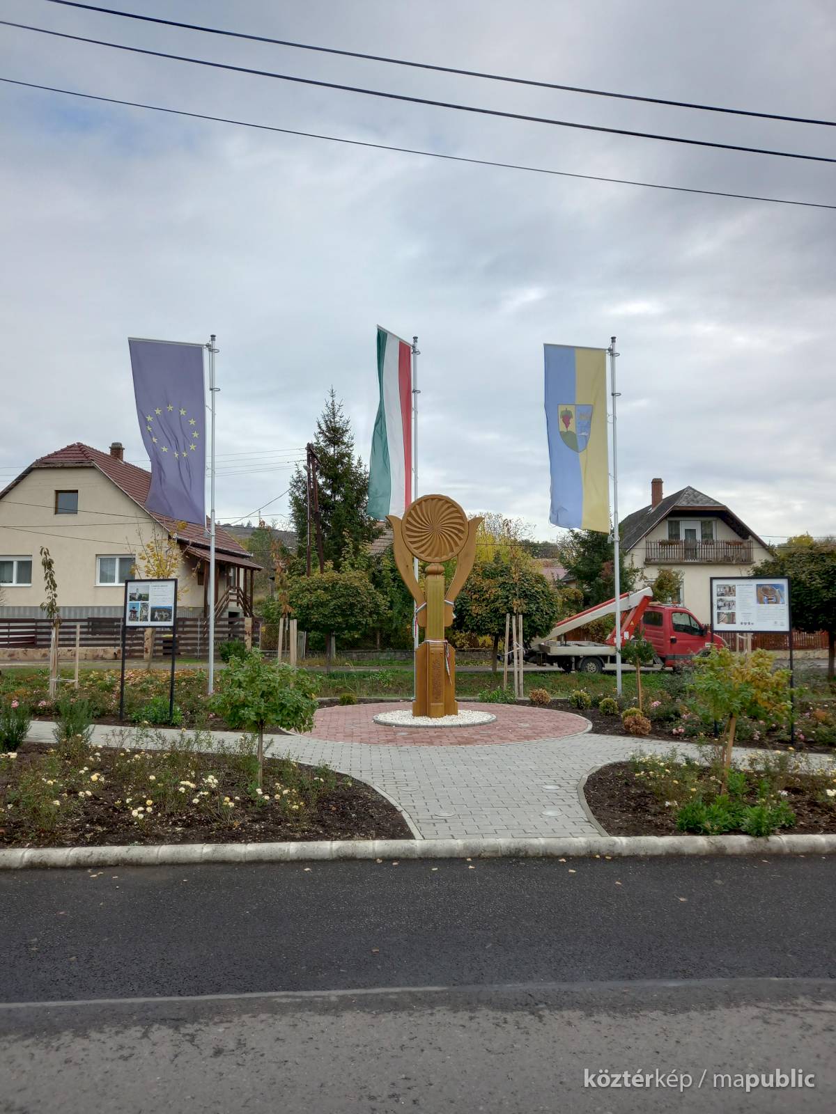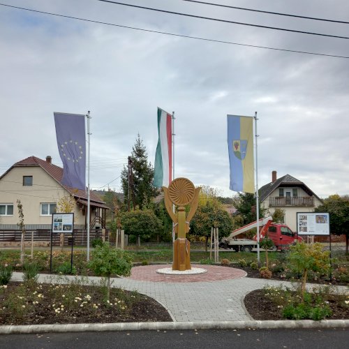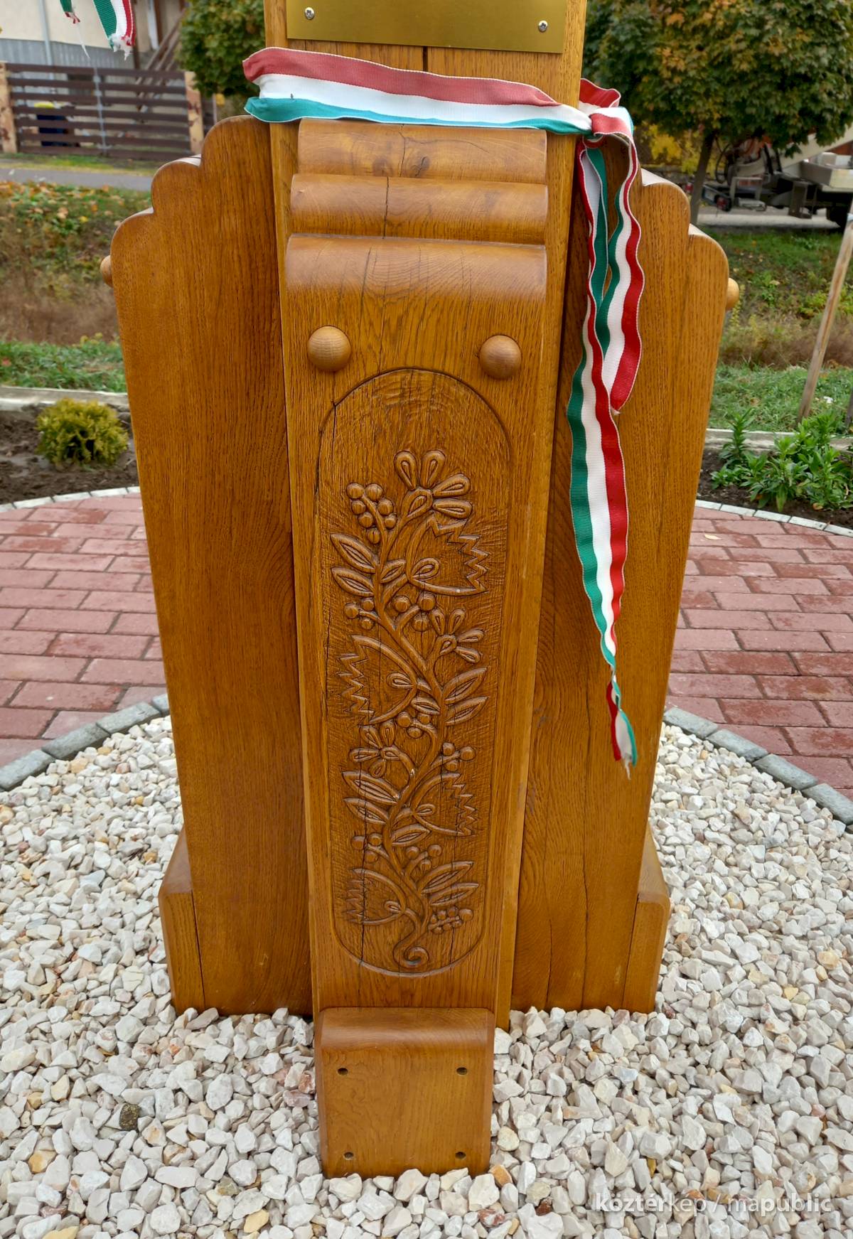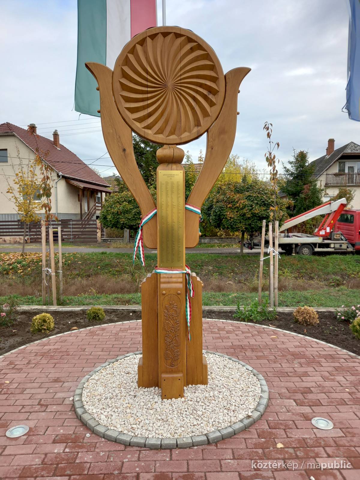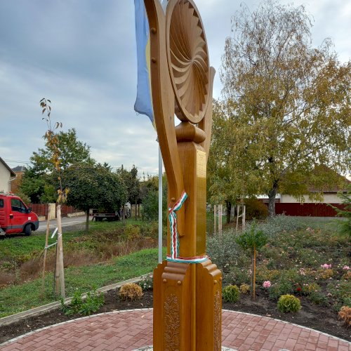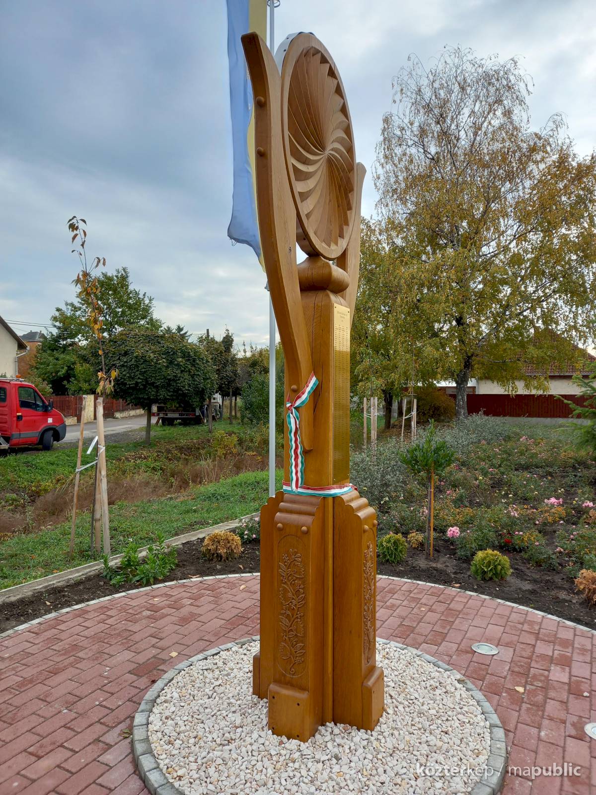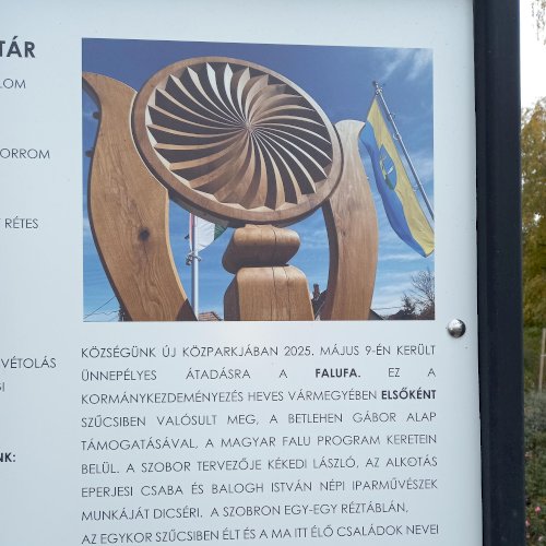 A több méter magas, mutatós alkotáson, már messziről feltűnik a forgó naprozetta. Közelebb érve olvasható két oldalán a ma élő és a múltban itt élt családok nevei. Az alkotás talapzatán szép virágfüzér fut fel a fából kifaragva. Mind a négy oldalon megismétlődve. A falufa melletti tablón (fotója a fényképek között) olvashatunk a 2025. május 9-i avatási dátumról és az alkotókról. „A szobor tervezője Kékedi László, az alkotás Eperjesi Csaba és Balogh István népi iparművészek munkáját dícséri.”