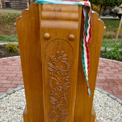 Sejtettem, hogy a talapzaton faragott virágfüzér, helyi hímzési motívumra utalhat, de a bizonyosság kedvéért megkérdeztem a falufa tervezőjét, Kékedi Lászlót, akitől megtudtam, hogy sejtésemnek megfelelően régi Szücsi községi táj hímzésmintáját faragták a talapzatra, mely mintát ő a gyűjtötte a Néprajzi Múzeumban.