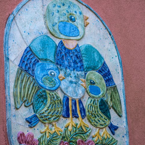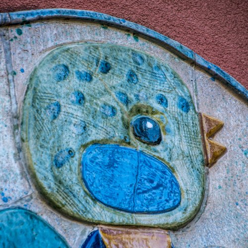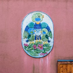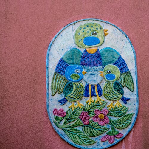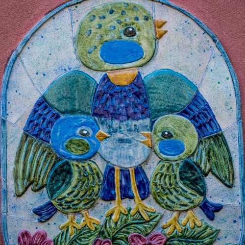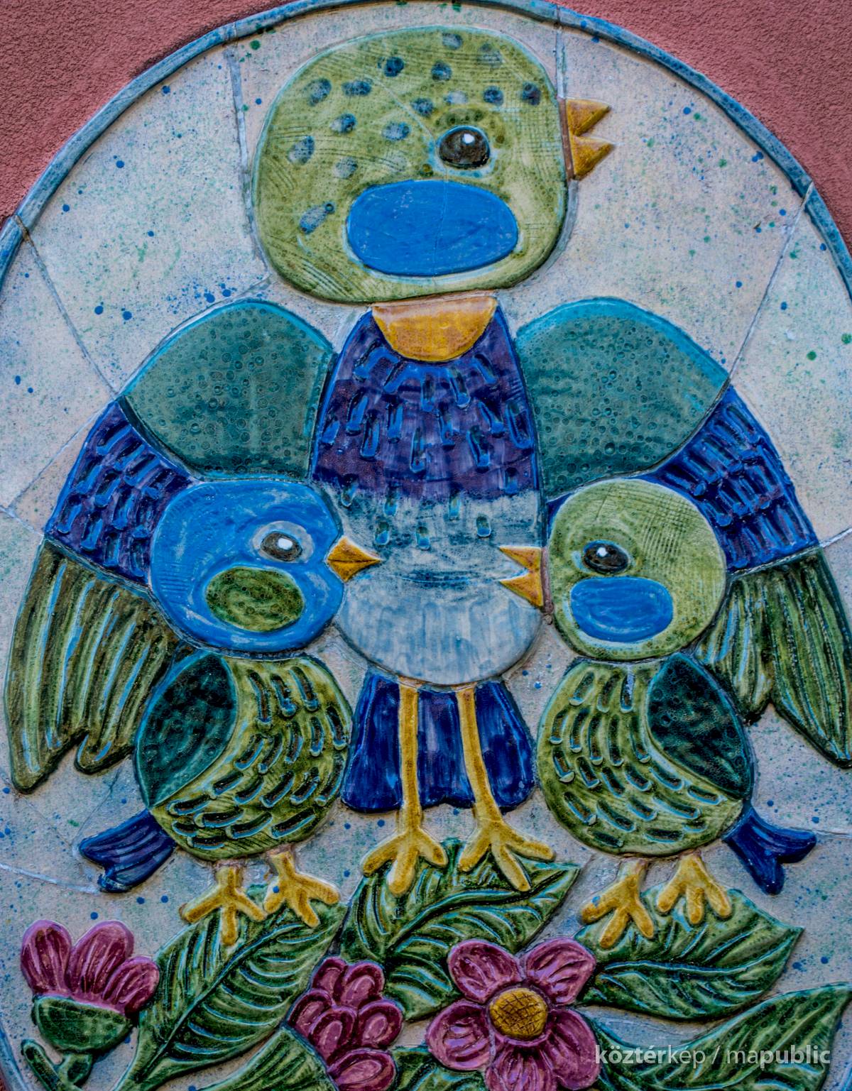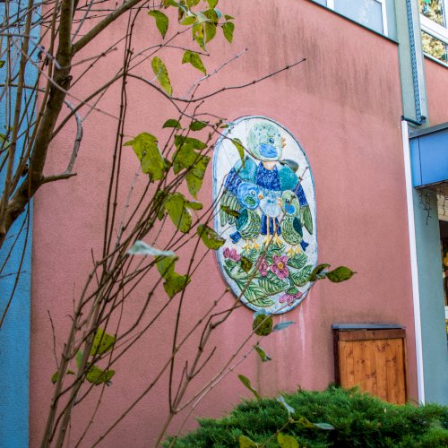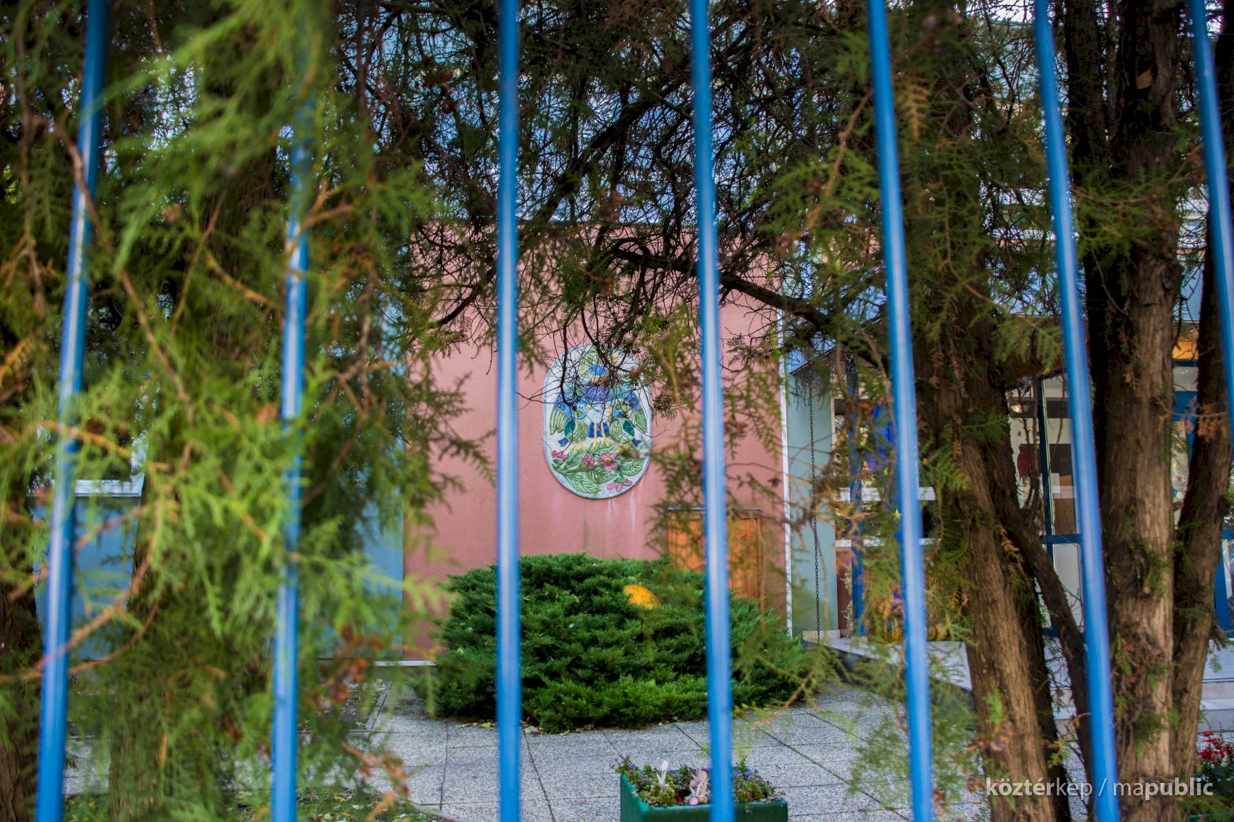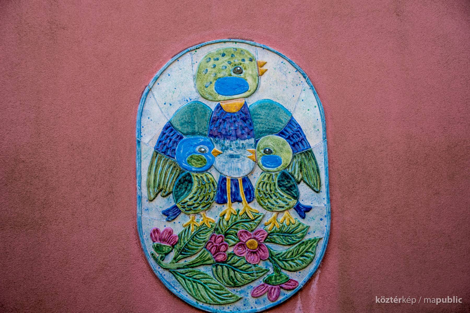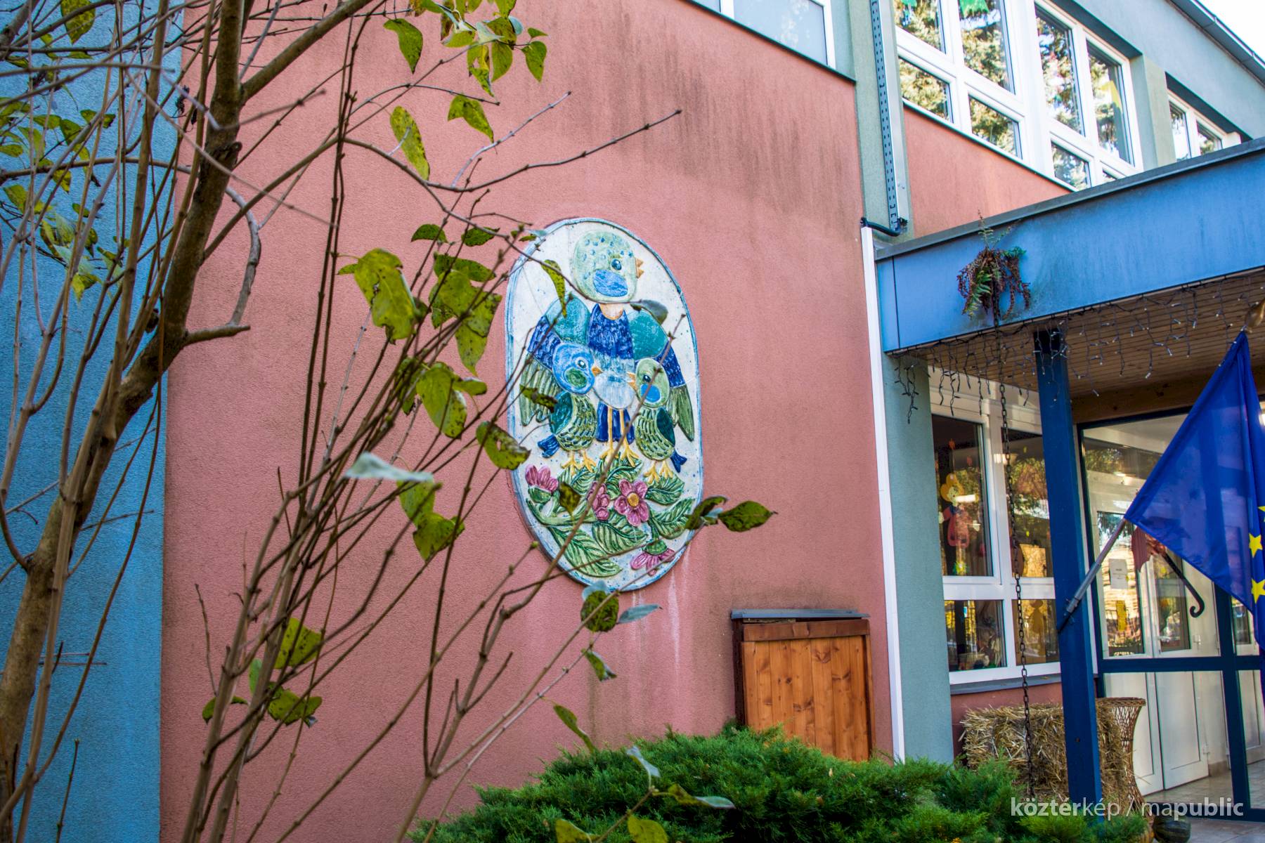 A kékcinkéről elnevezett napköziotthonos óvoda cégére a bejárat mellett látható, az épület homlokzatán.