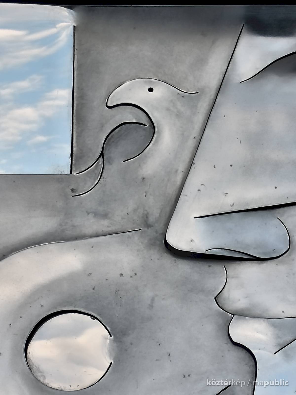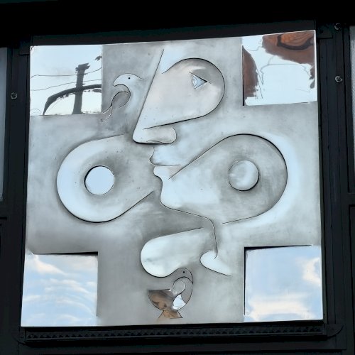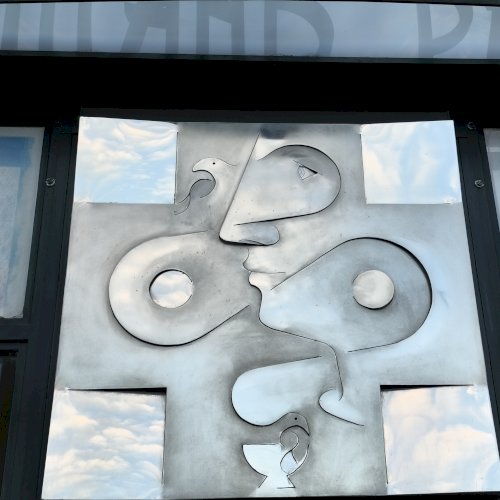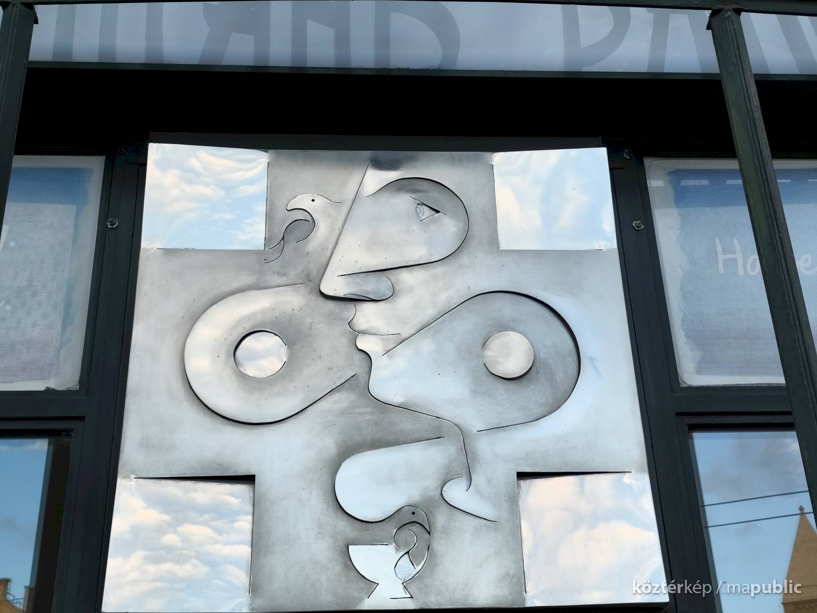 A dombormű, egy fiatal női arcot ábrázol profilból, finoman kidolgozott vonásokkal apró szemmel. Feje mellett és a nyakánál, stilizált galamb alak és egy tálka látható. Az egész alkotás hátterében egy kereszt rajzolódik ki. A fényes felületről a fények visszatükröződnek, oldalról nézve egészen más formát mutat. Olyan mintha éles eszközzel vágták, és feszítették volna ki az idomokat. Alkotói szignót nem találtam rajta.