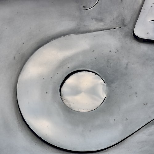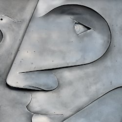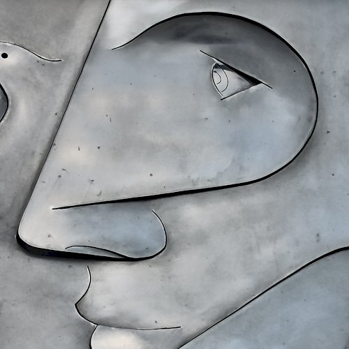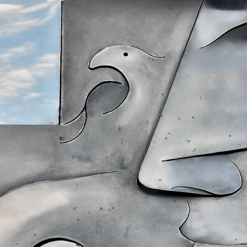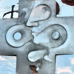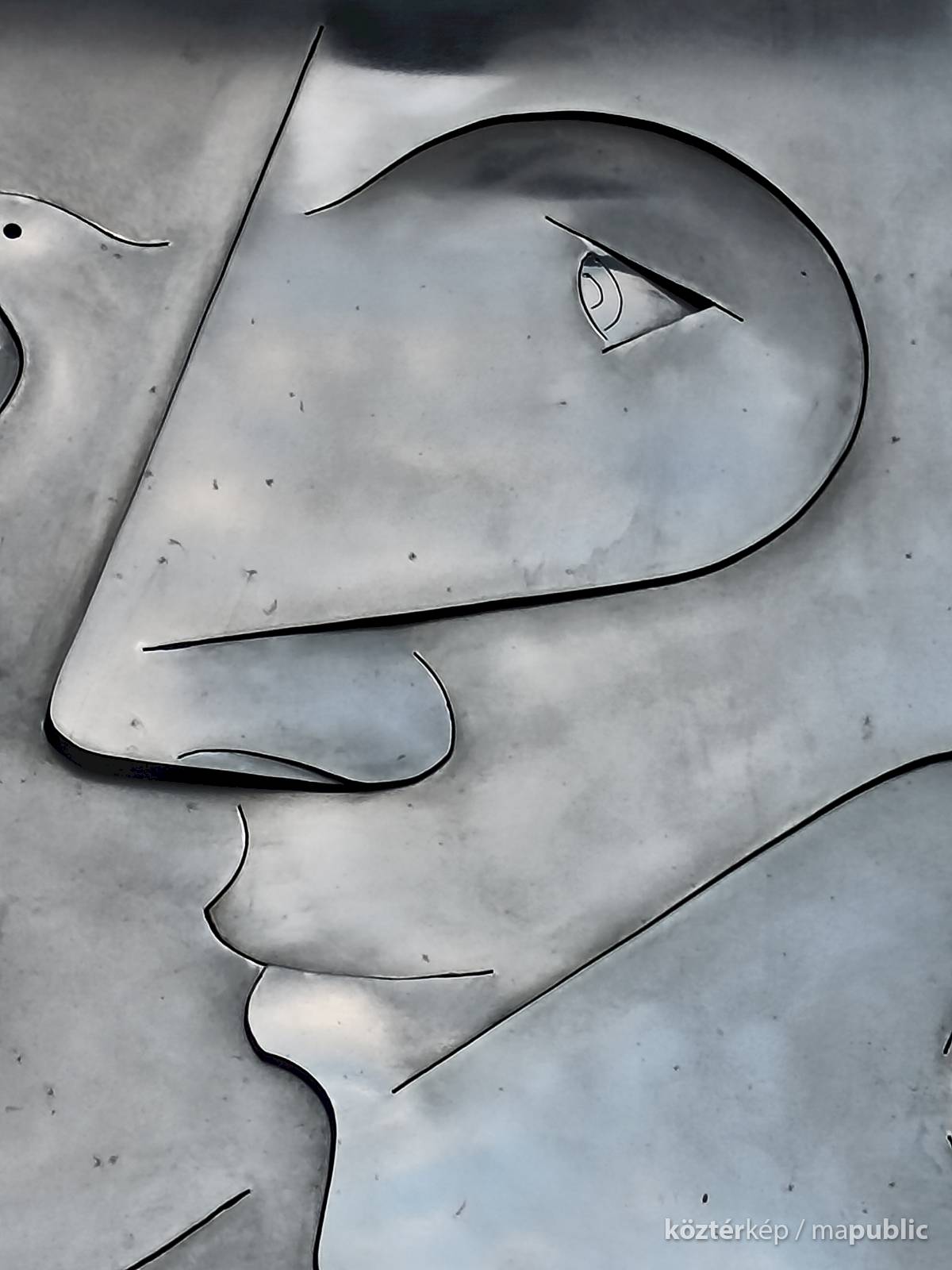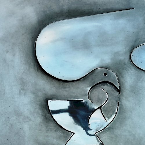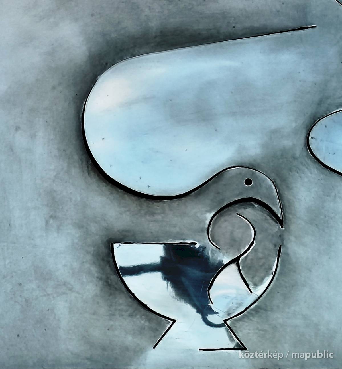 A dombormű, egy fiatal női arcot ábrázol profilból, finoman kidolgozott vonásokkal apró szemmel. Feje mellett és a nyakánál, stilizált galamb alak és egy tálka látható. Az egész alkotás hátterében egy kereszt rajzolódik ki. A fényes felületről a fények visszatükröződnek, oldalról nézve egészen más formát mutat. Olyan mintha éles eszközzel vágták, és feszítették volna ki az idomokat. Alkotói szignót nem találtam rajta.