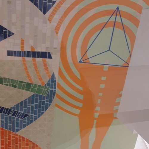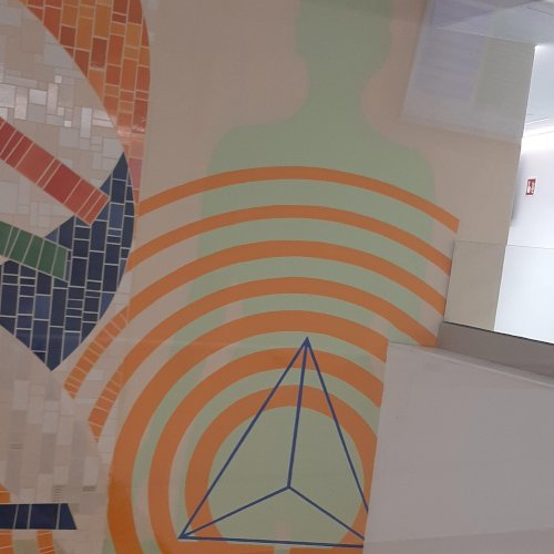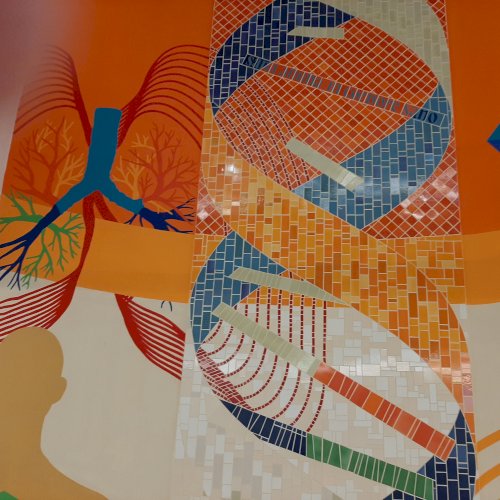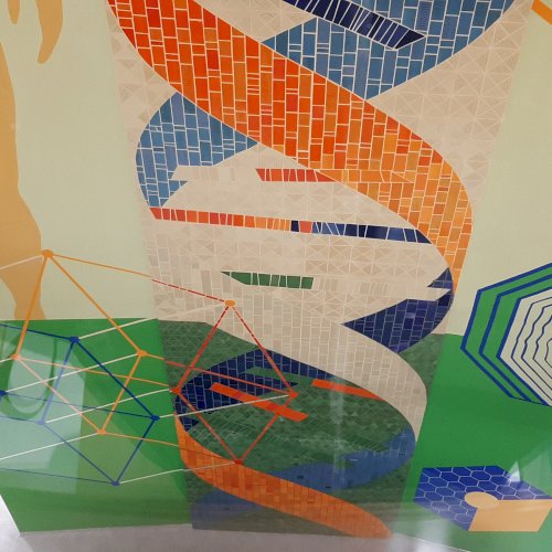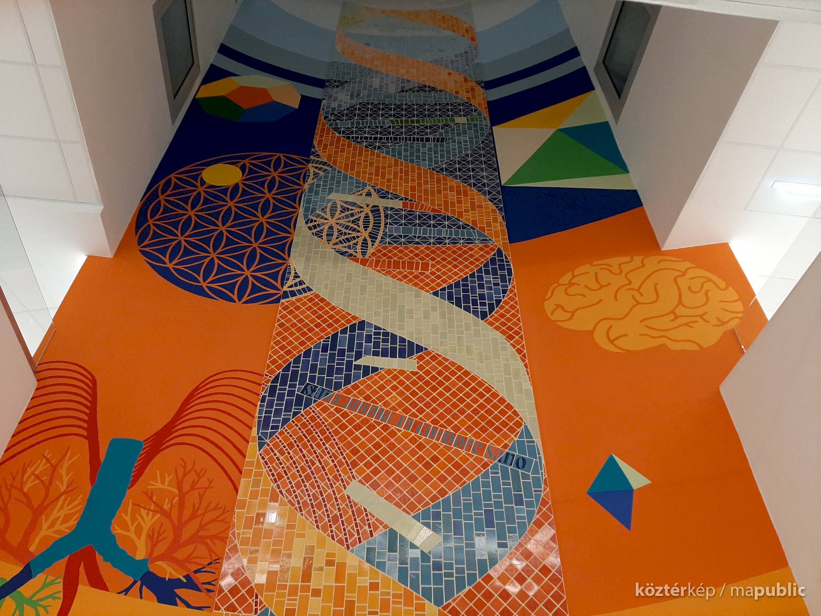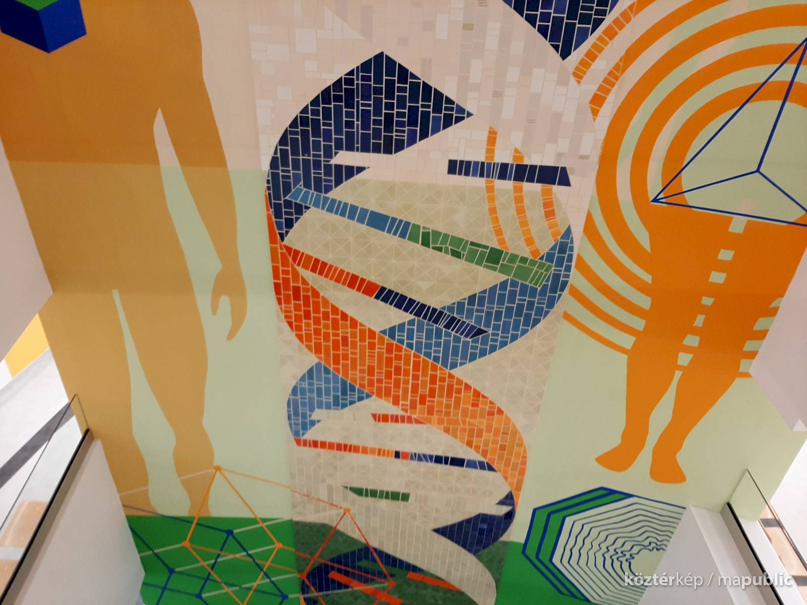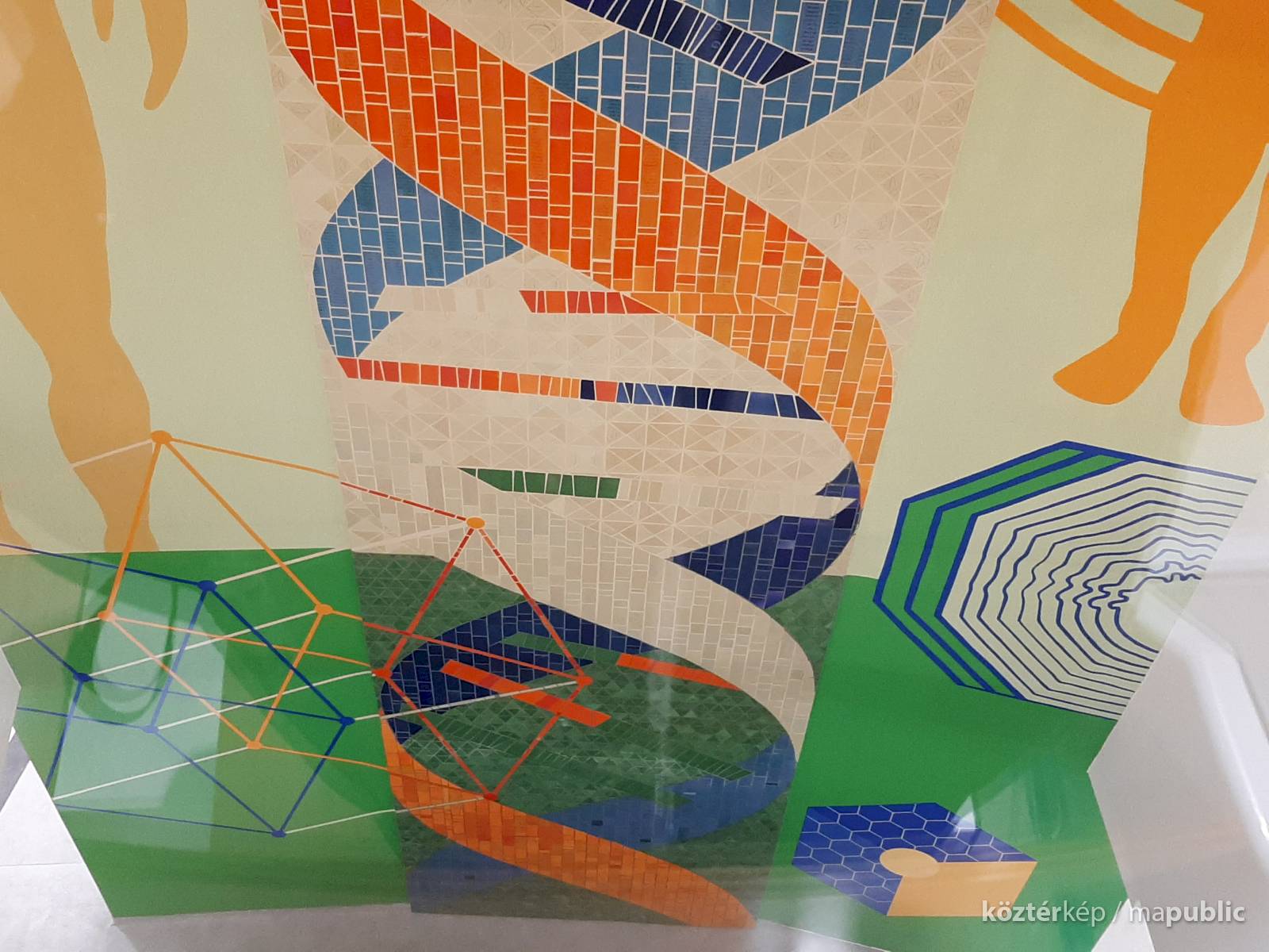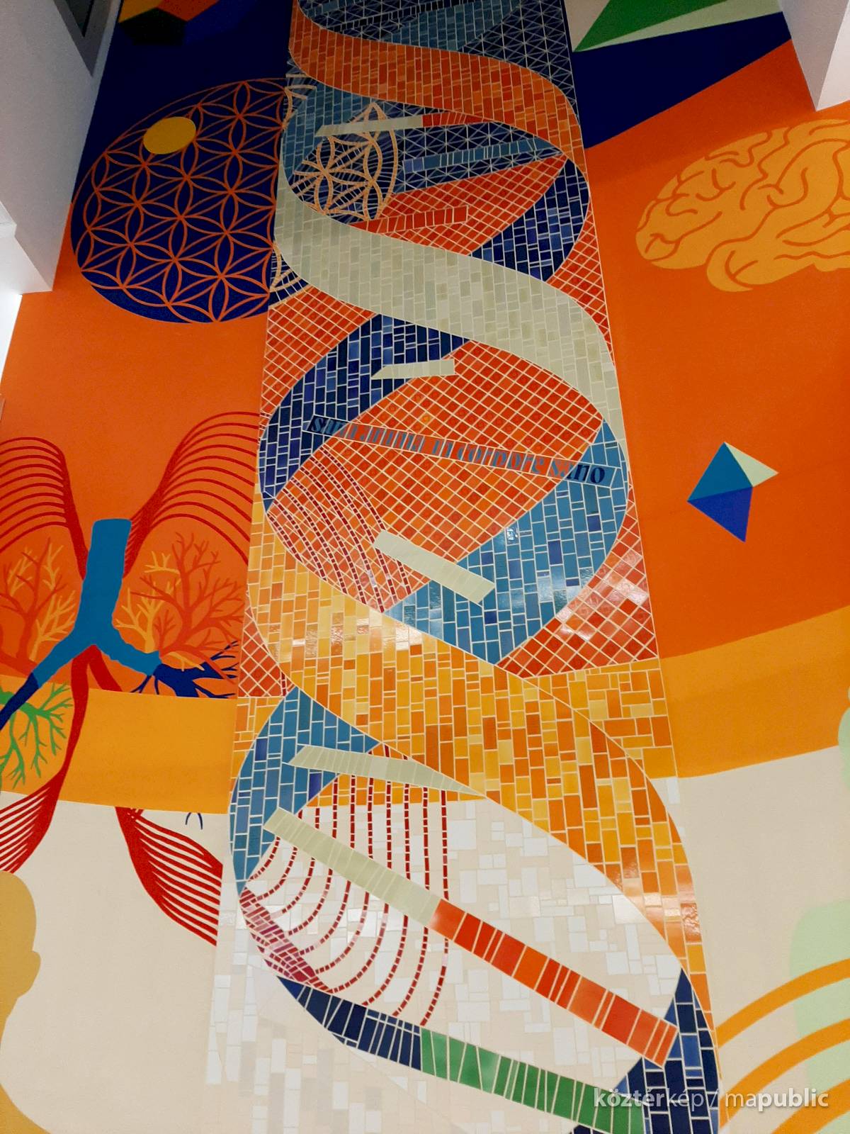 A mű a hetvenes–nyolcvanas évek SZTK-mozaikjait idézi meg, de kortárs formában: a hagyományos figurák helyett a központi elem egy óriás DNS-spirál.