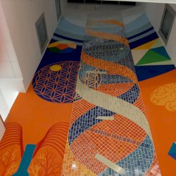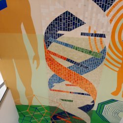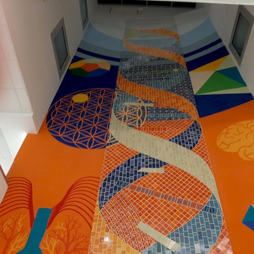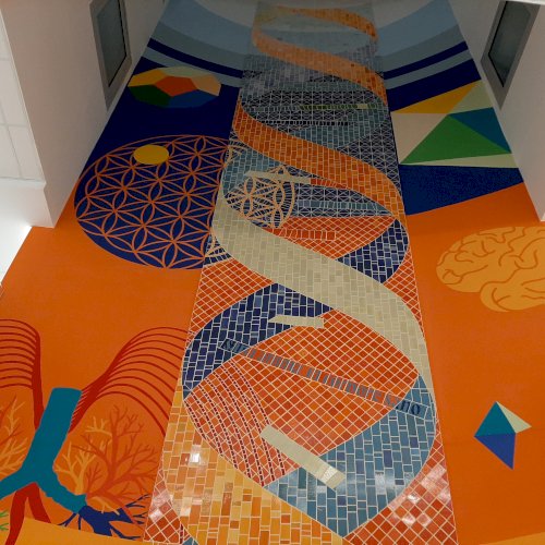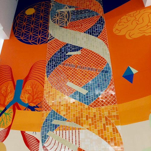 Az alkotás különlegessége hatalmas méretén túl, hogy a mozaikokat egyenként, kézzel gyártották és festették, hogy aztán hat emelet magasba nyúlva kiadják az emberi DNS spirál mintáját.
