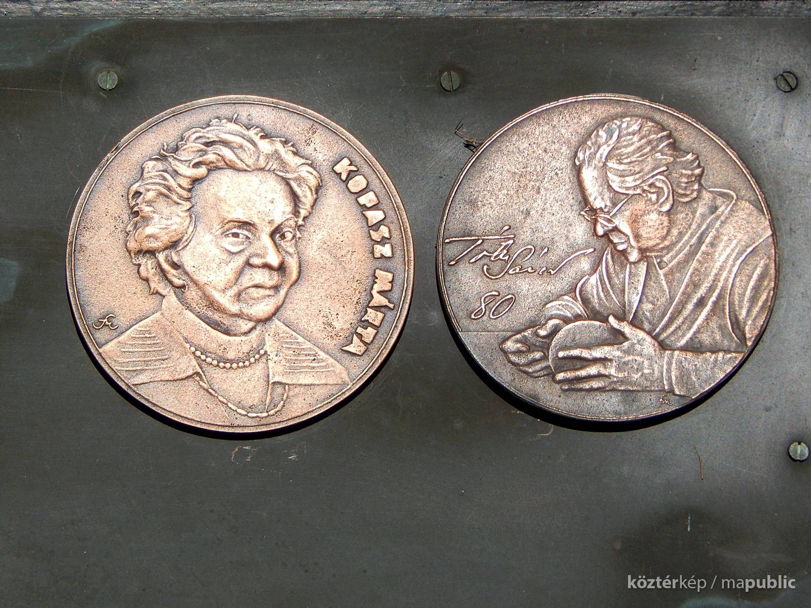 "Kopasz Márta Szegeden született 1911-ben. Középiskolai tanulmányait a Szent Erzsébet Leánygimnáziumban végezte, majd kitüntetéssel diplomázott a Magyar Királyi Iparművészeti Főiskolán." Szegeden a Hámán Kató Általános Iskolában, majd a Tömörkény István Gimnáziumban tanított. Ő volt az első nő, akit Szeged díszpolgári címével tüntettek ki. Márta nénit sokan ismerték. Emlékplakettje Tóth Sándor plakettjét követi.