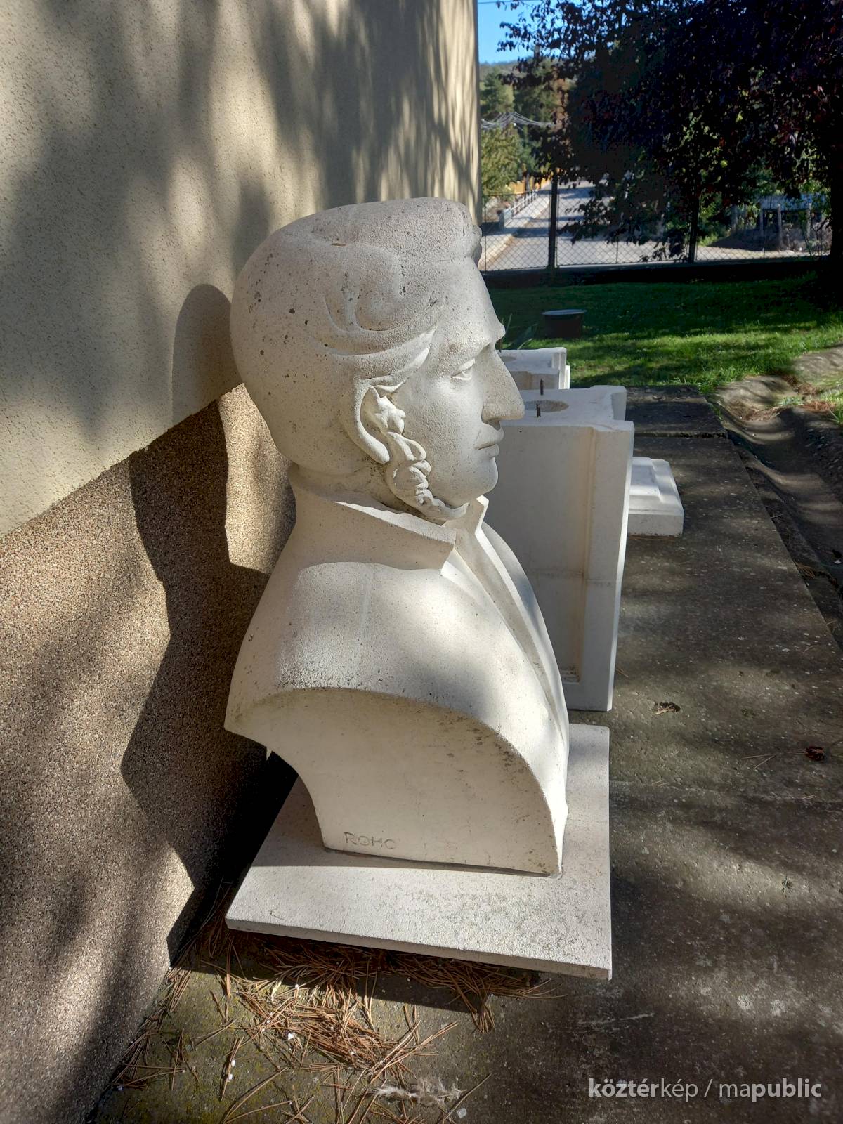 Bajza József (1804 – 1858) költő, irodalmár, a Nemzeti Színház első igazgatója, Szücsi szülöttje. Mellszobrát eredetileg, 2004-ben avatták fel Szücsi község Petőfi Sándor utcájában. Erről kapcsolt műlapomban írtam korábban. Akkori látogatásunkkor már elbontották a mellszobrot első helyéről, s a helybeliek mesélése alapján, meg is találtuk az általános iskola mellett, felállításra várva a szobrot és talapzatának elemeit.