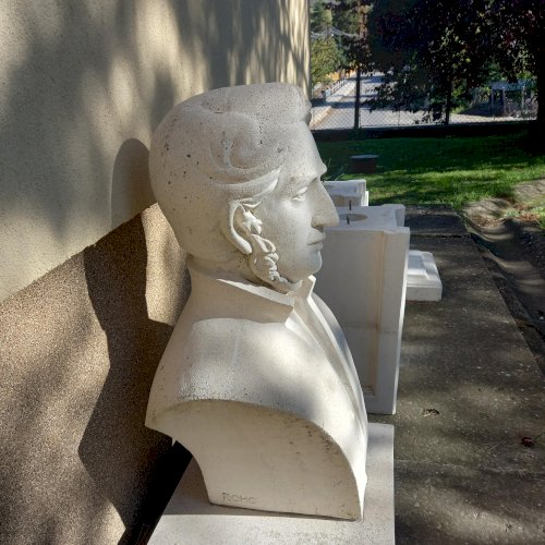 Bajza József mellszobrát nemrégen meglátogattam új helyén, a nevét viselő általános iskola előkertjében. Ide helyezték át. Nagyon szépen mutat, mondhatni méltó, új helyén. A mellszobron látható az alkotó „ROHO” szignója, mely Rohonczi István szobrászművészt jelenti. A szobrászművészre vonatkozóan kapcsolt műlapomban írtam forrásról is.
