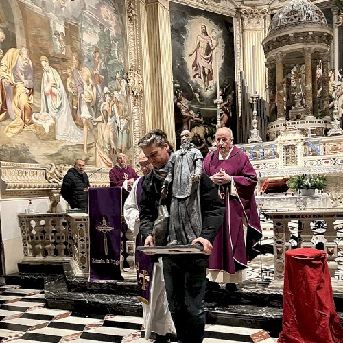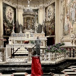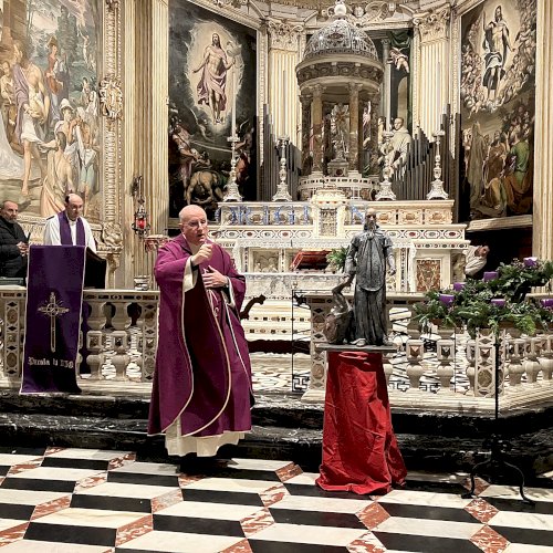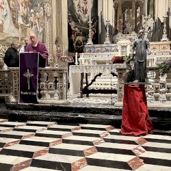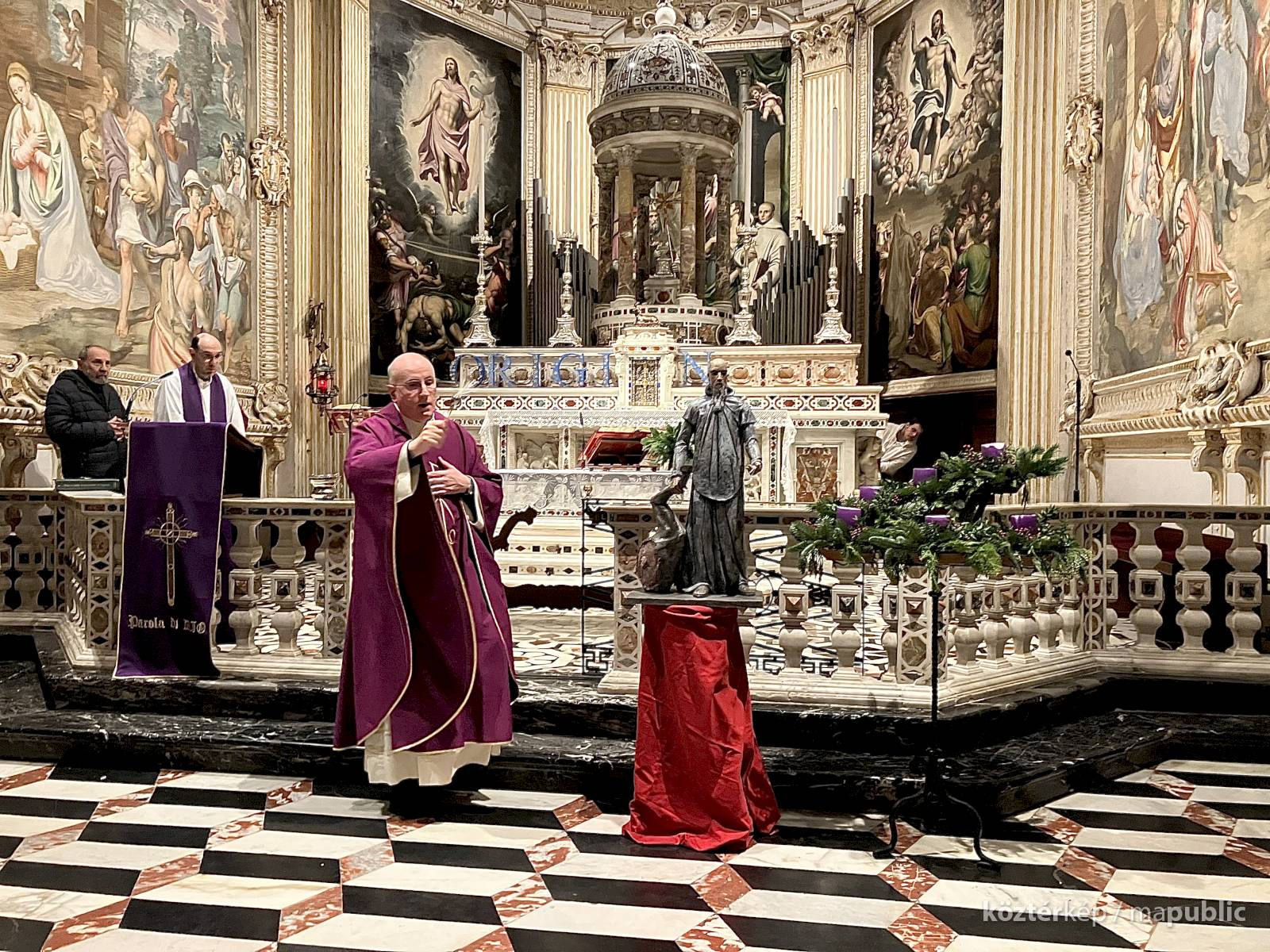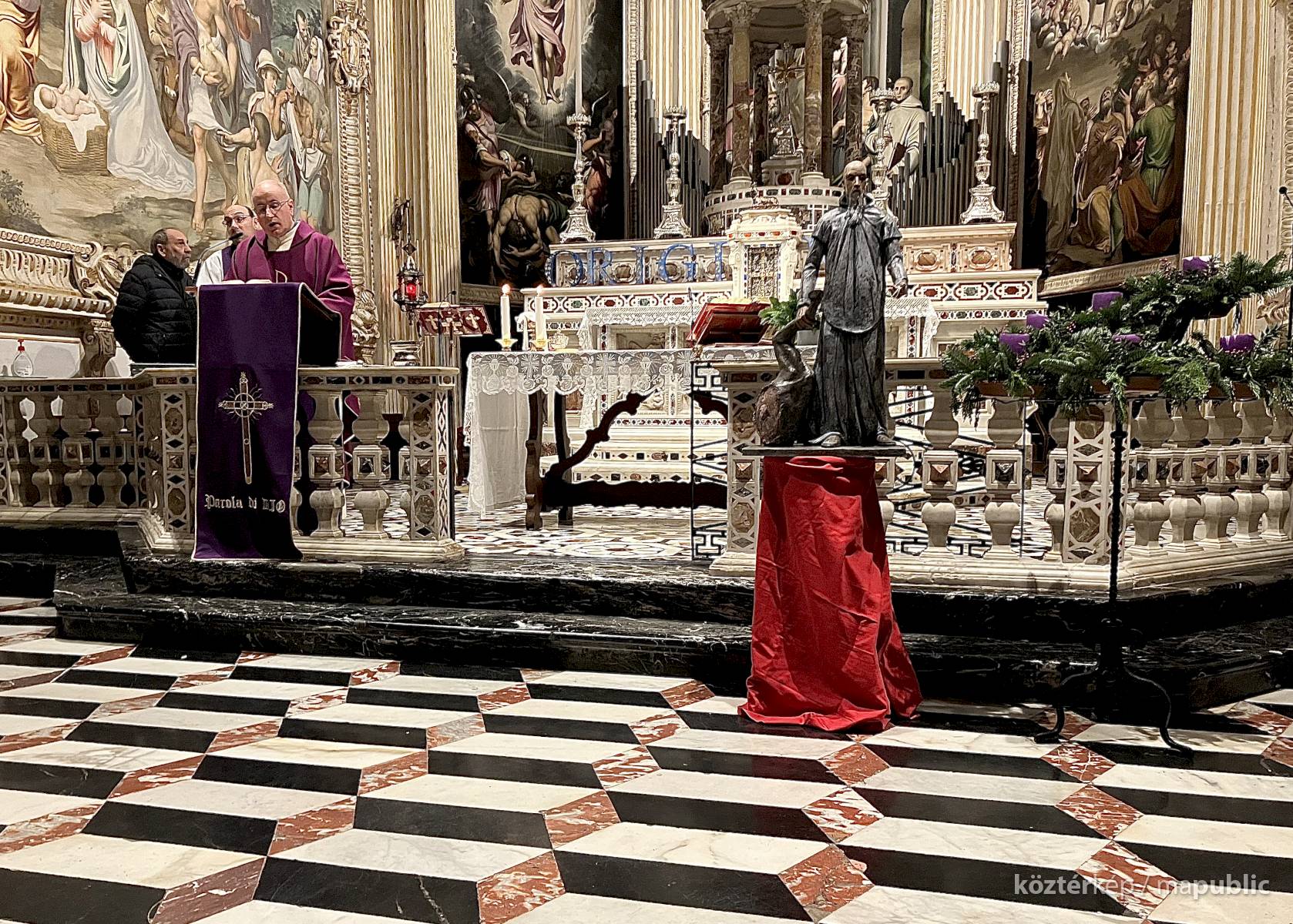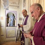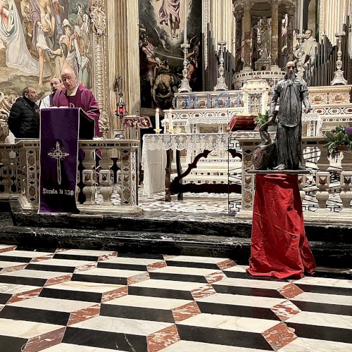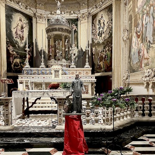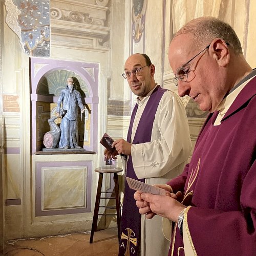 A világos polikróm mázakkal átszelt szürkés terrakotta szobrot 2025 őszén a garegnanói karthausi kolostor Nagyboldogasszony-templomában, a Szent Antal-kápolna egyik fülkéjében helyezték el. [1] [2] Avatták 2025. december 19-én. (További linkek [2])