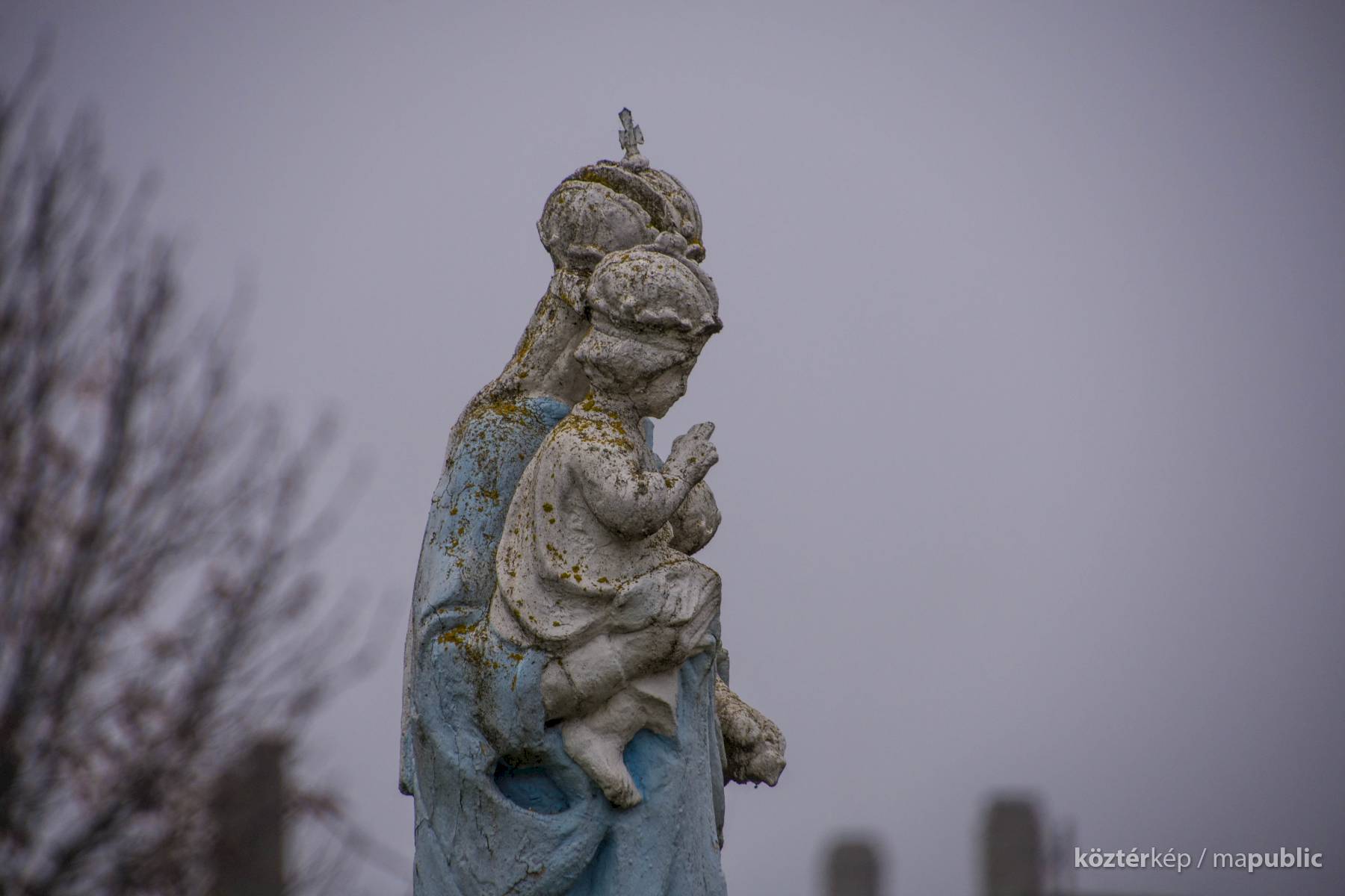 Szűz Mária kék palástban ábrázolt.