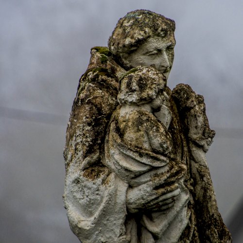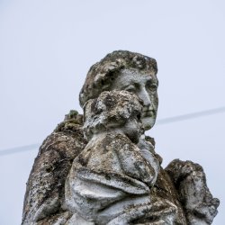 Jobb karján a gyermek Jézus tartja, bal kezében pedig másik attribútuma, a tisztaságot szimbolizáló liliom látható.