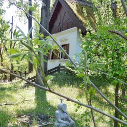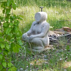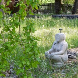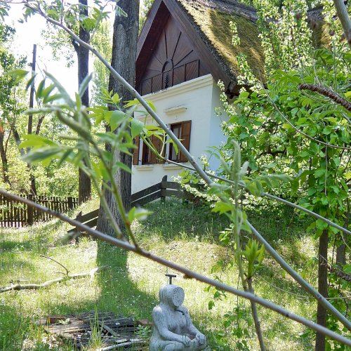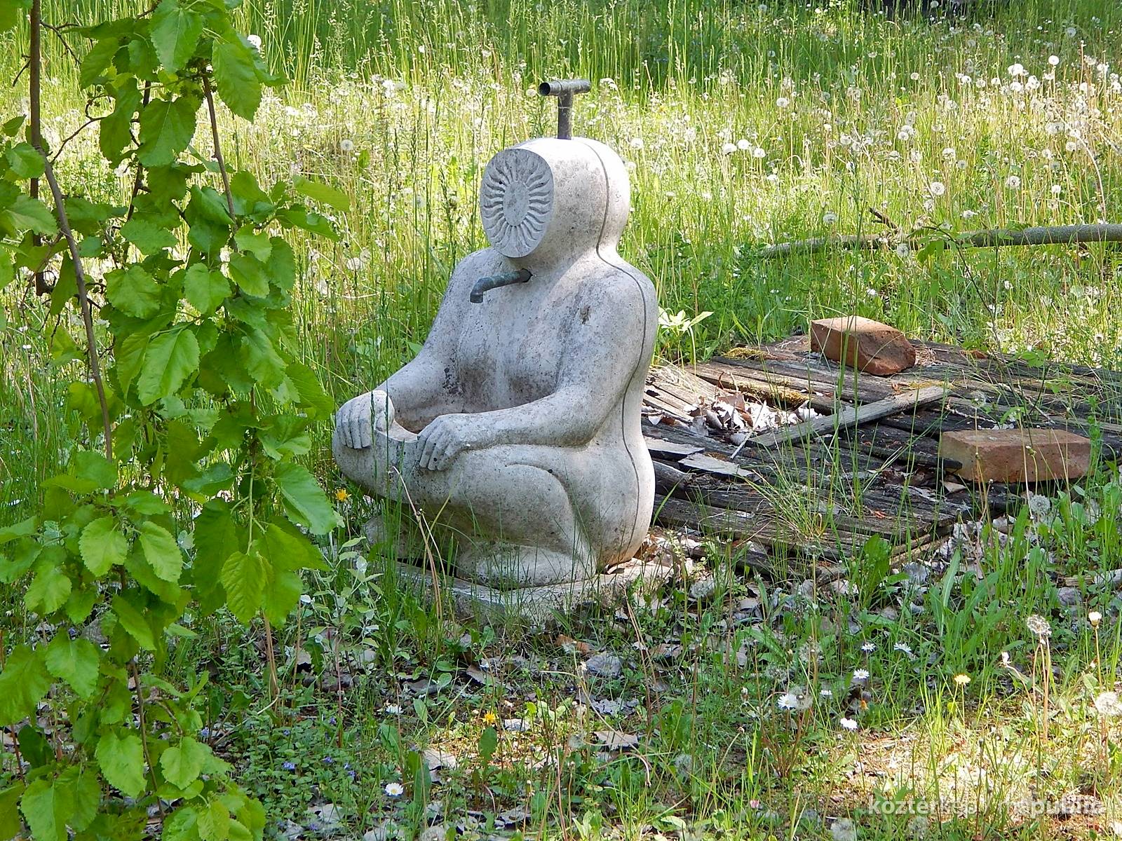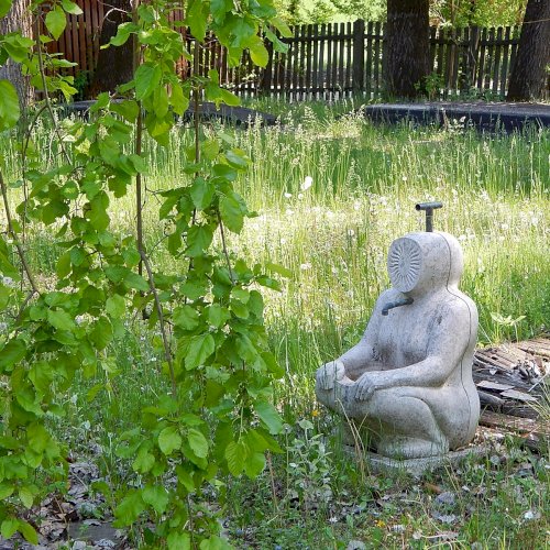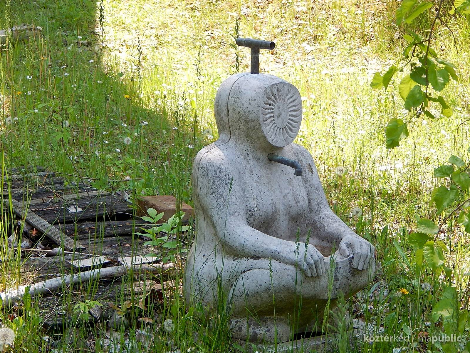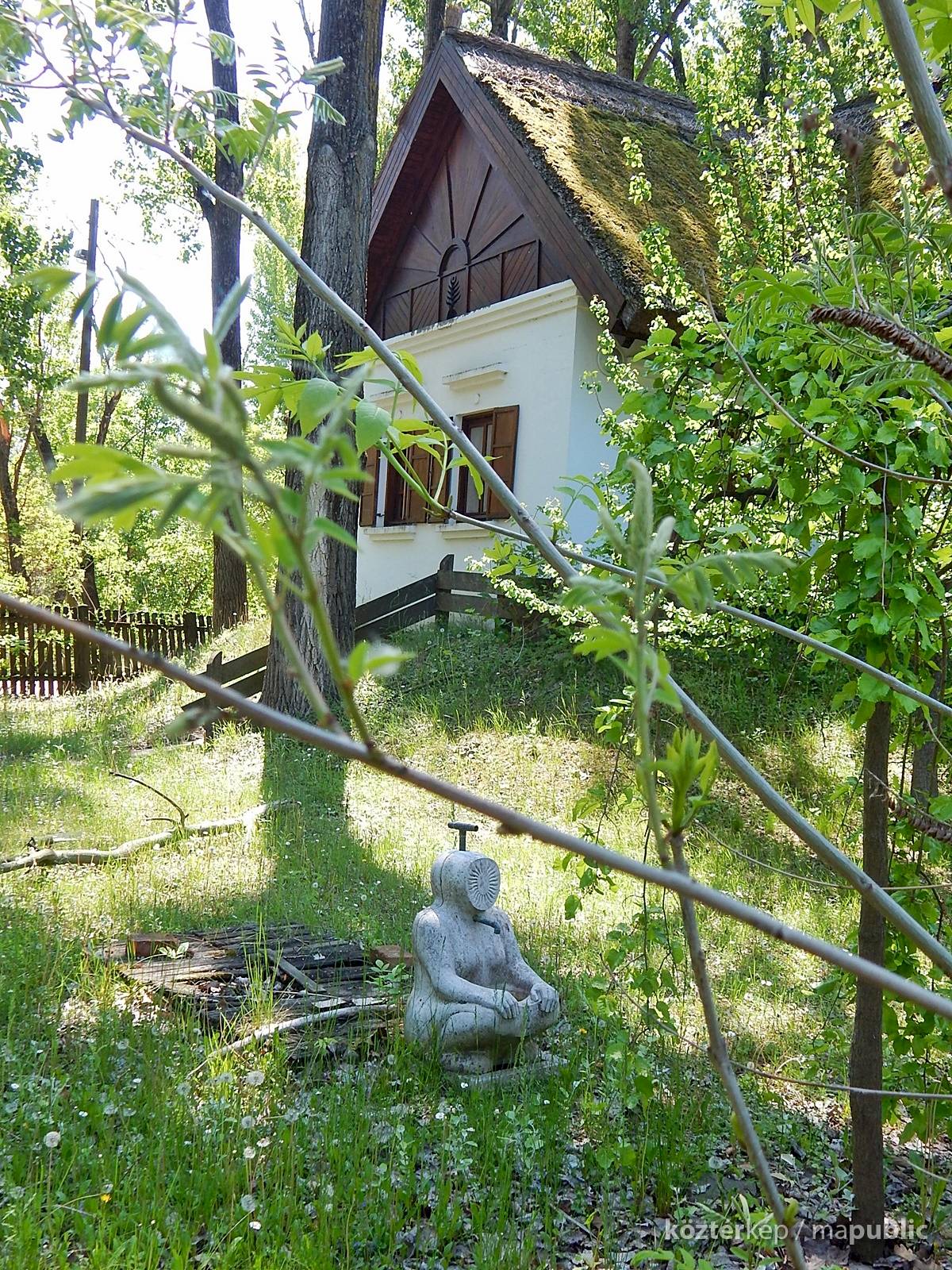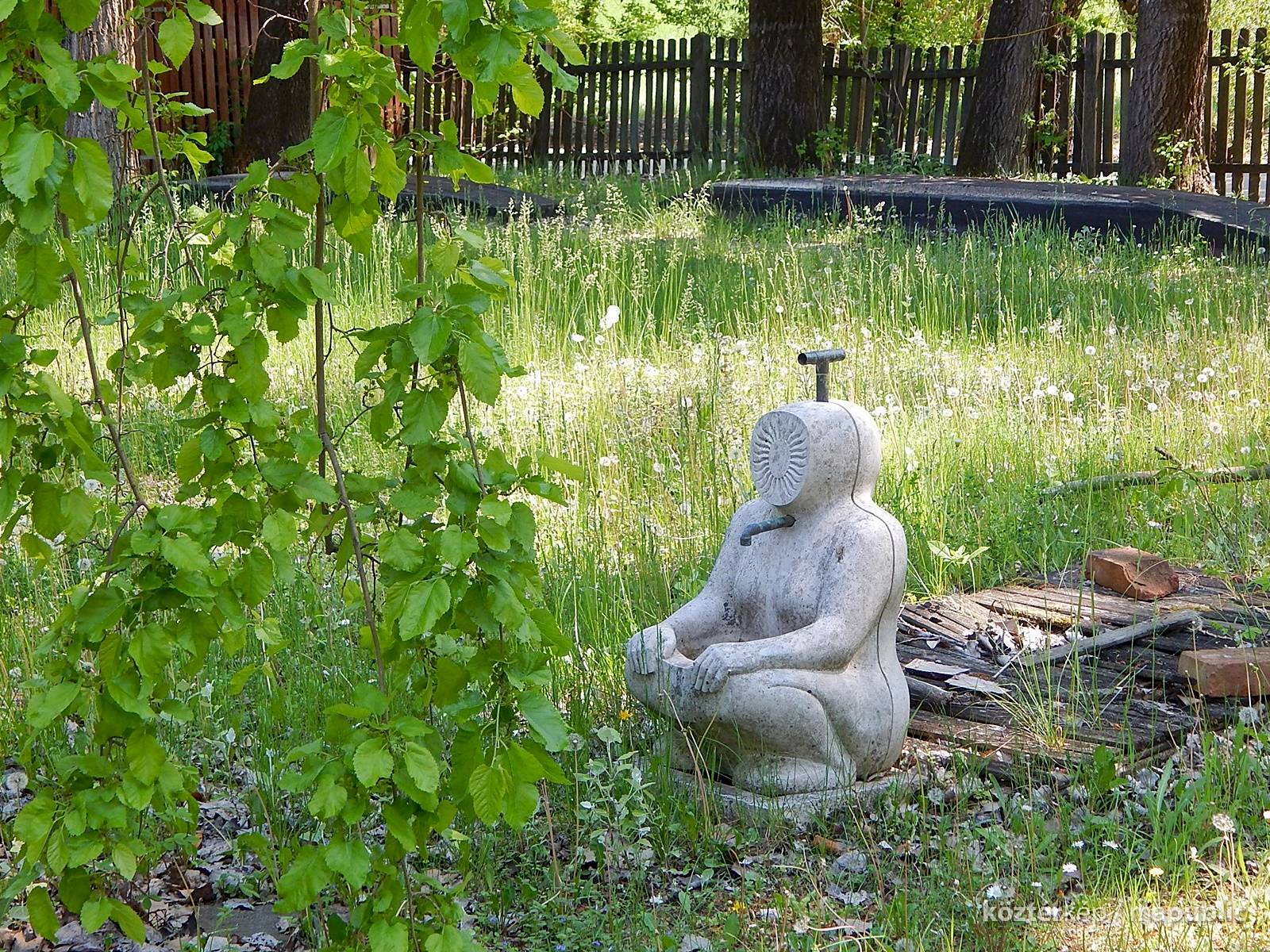 A mártélyi üdülőterületen lévő Makovecz nyaraló kertjében különös kútszobor látható. Az ülő emberalak arca napsugár formájában van ábrázolva. Azt nem tudom mikor került felállításra, fotóim 2019-ben készültek. A Makovecz Imre által tervezett szobrot kőfaragó készítette el.