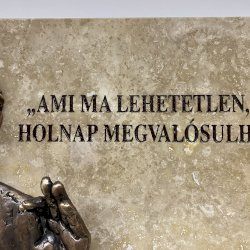 A tábla feliratai: "AMI MA LEHETETLEN, HOLNAP MEGVALÓSULHAT"