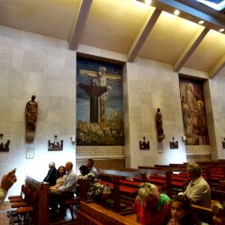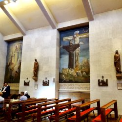 A templomtörténet a legrövidebben: a templomépítés gondolata 1948-ban merült fel, sőt az építkezés már szeptemberben meg is indult, 1949. július 10-én került sor felszentelésére. A templombelső díszítésére csak később, a 1950-es évektől kerülhetett sor. A templom belső díszítésének alapvető részét a „Római Iskola” művészei készítették.[1] Akkoriban készült az a hat, fából készült alkotás, ami különböző szenteket ábrázol, a falakra erősített konzolokon helyezték el őket.