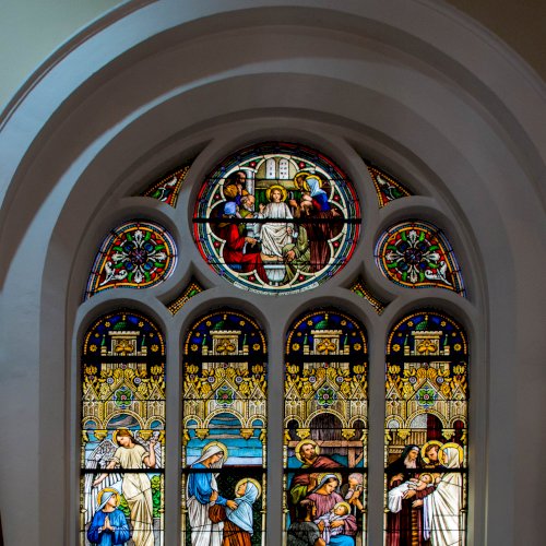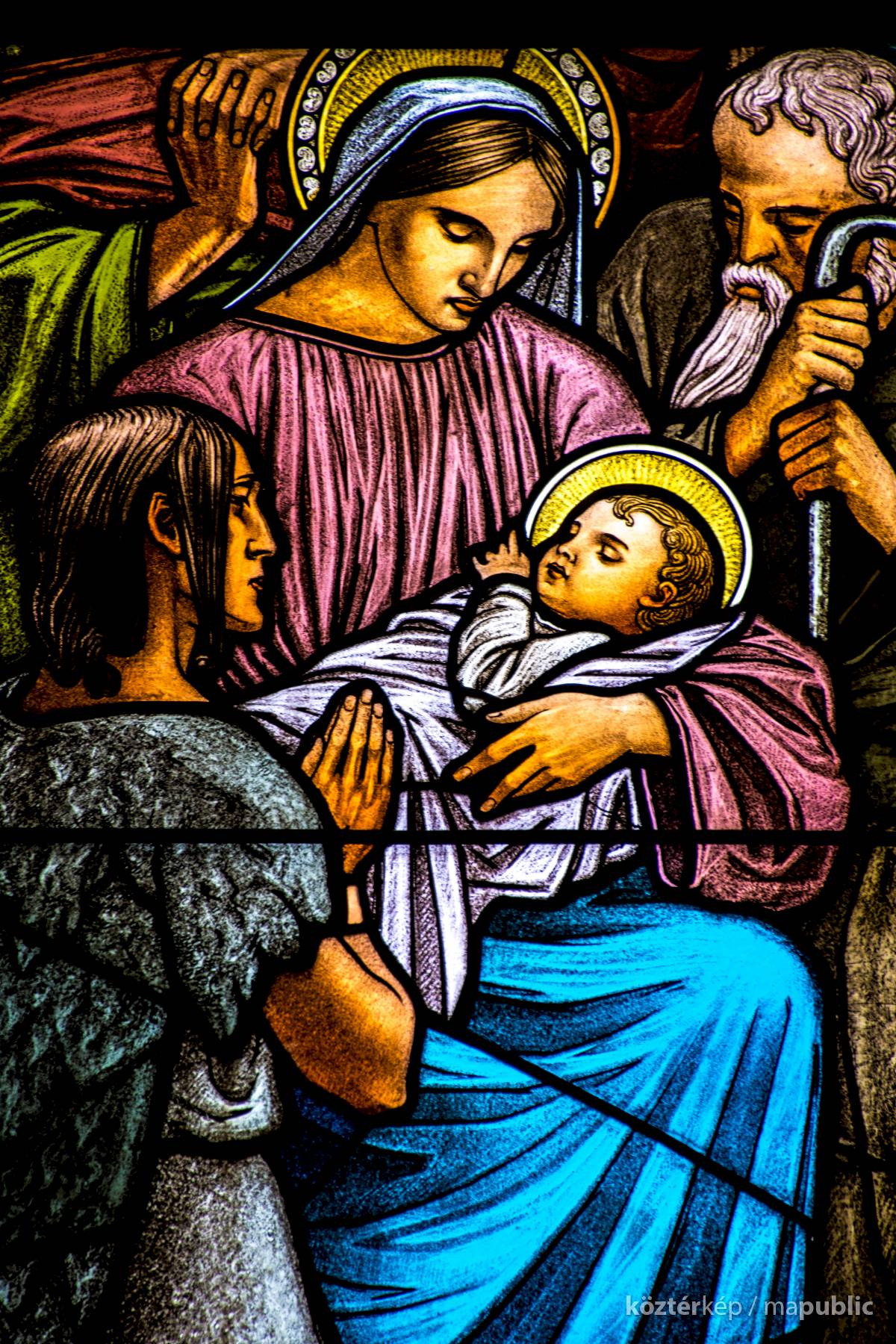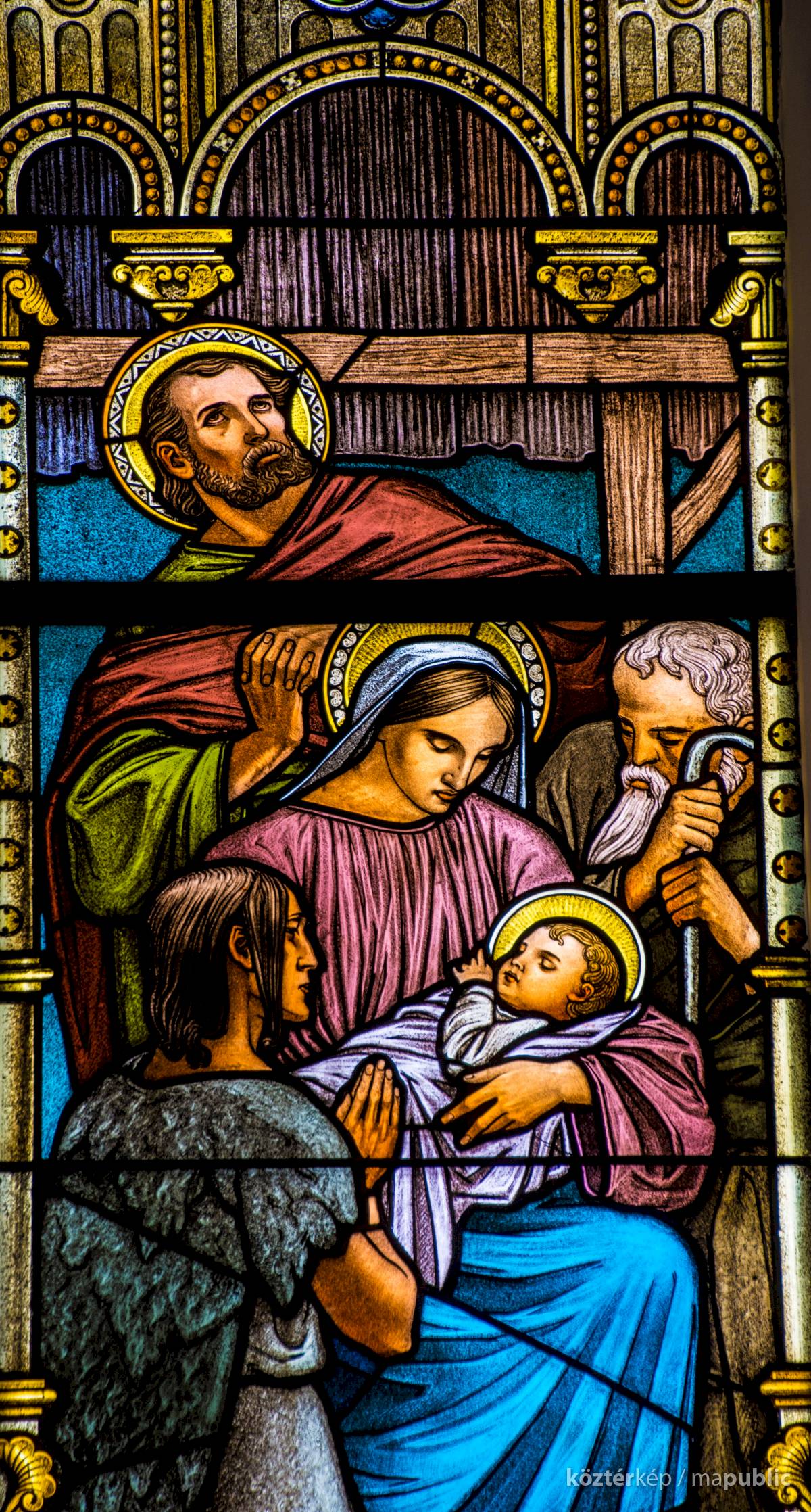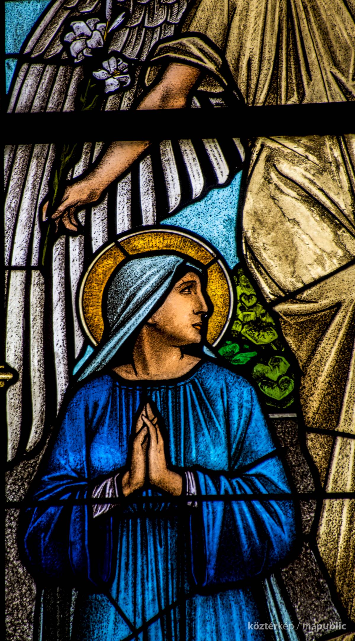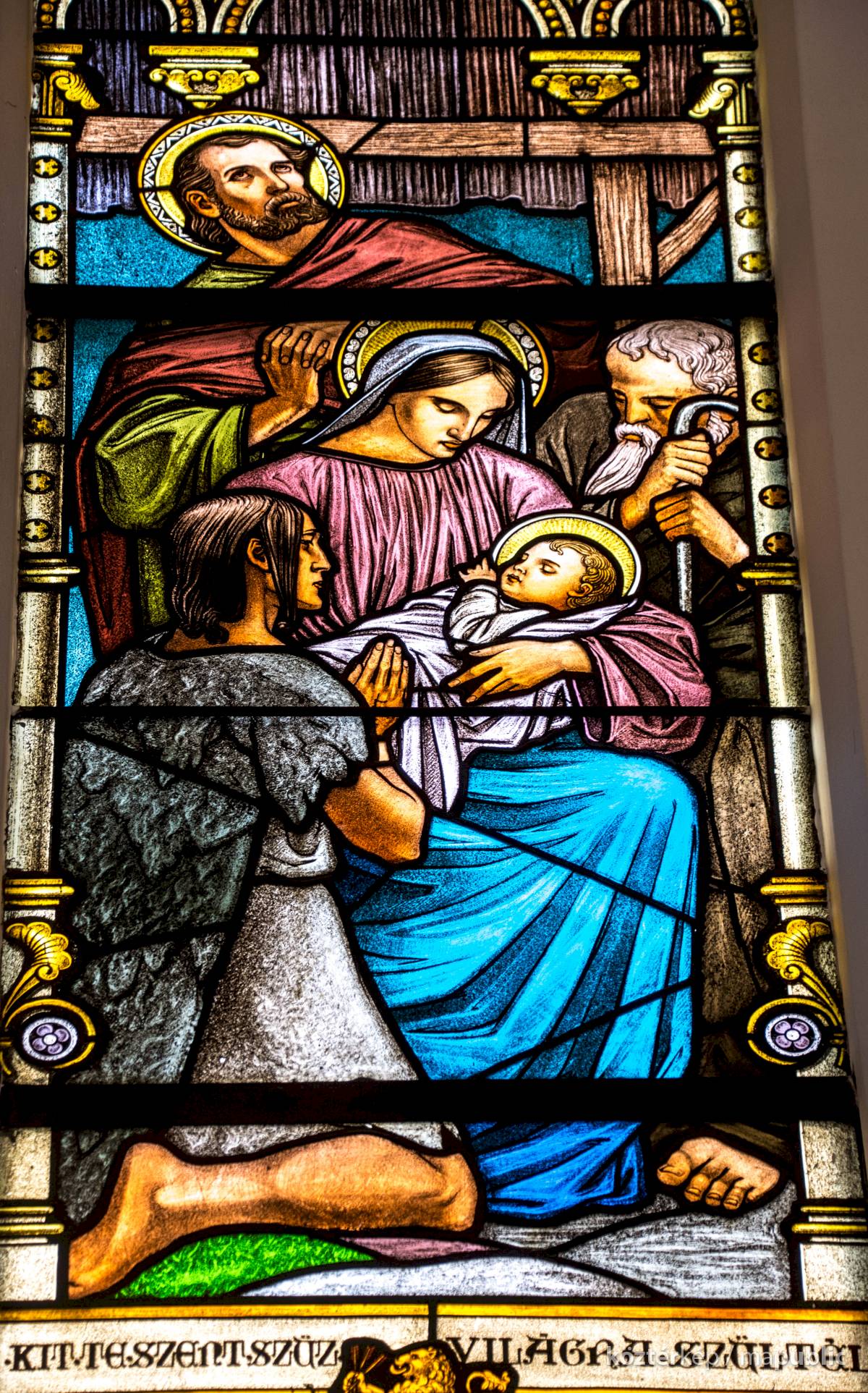 A szentély előtti bal oldali óriás üvegablakon az Örvendetes szent olvasó titkainak eseményeit örökítette meg a művész:
