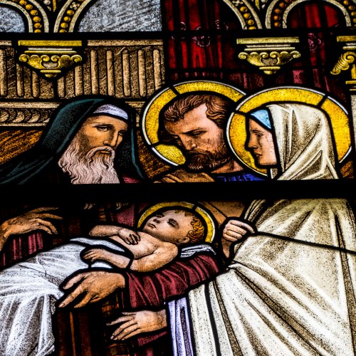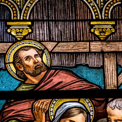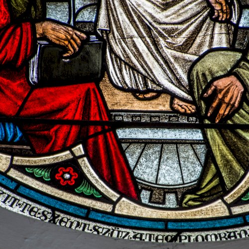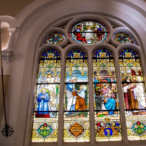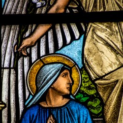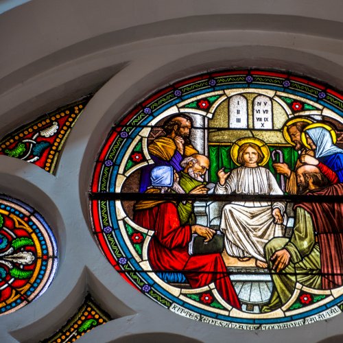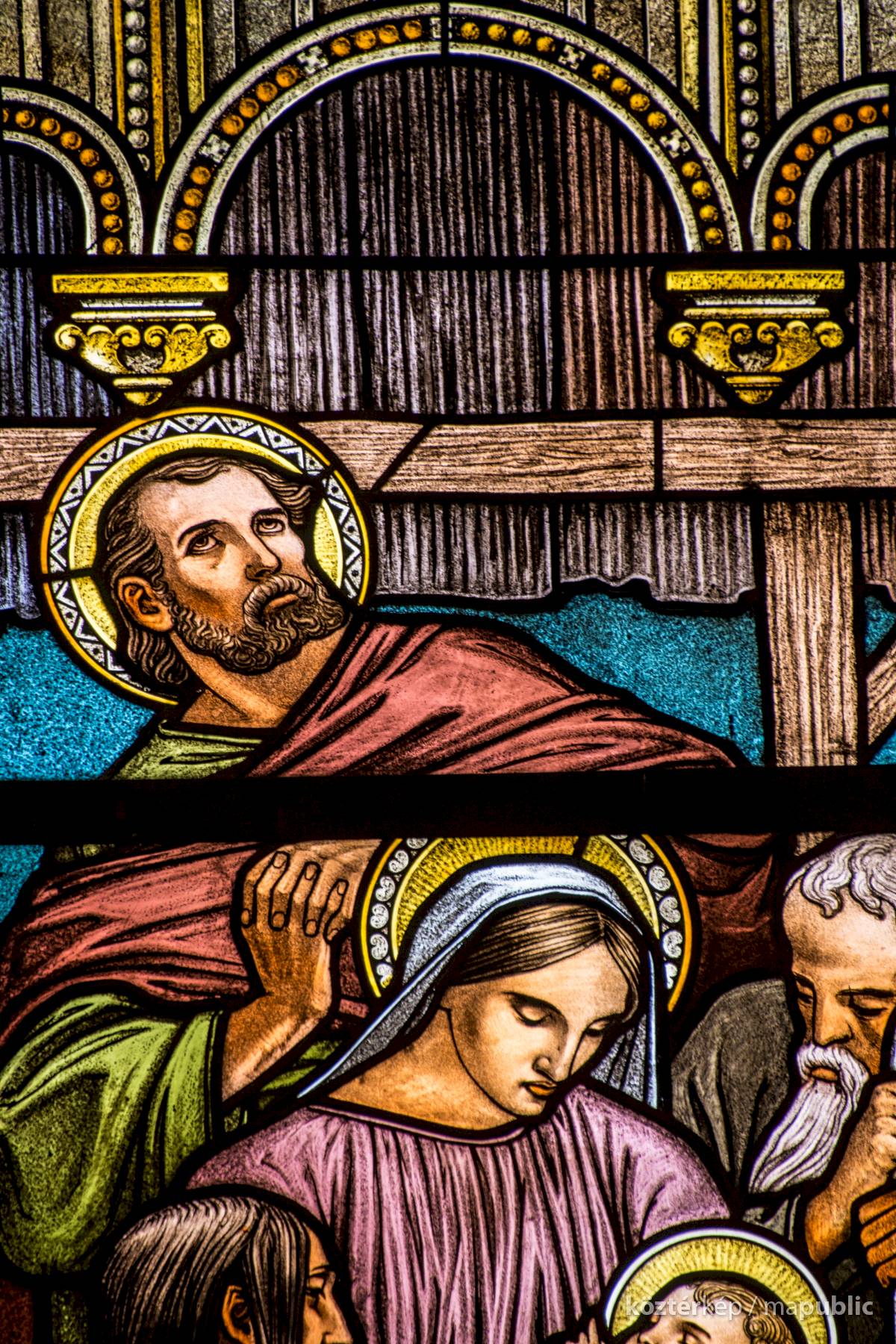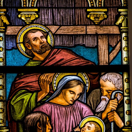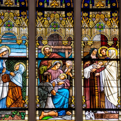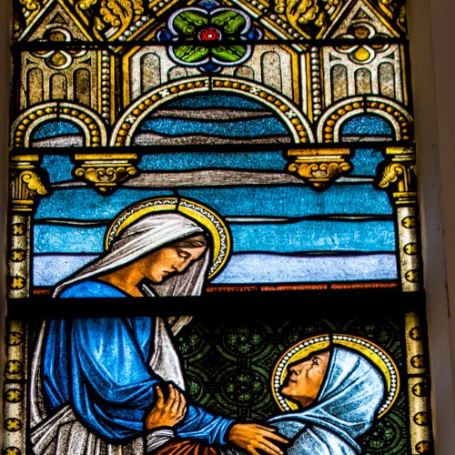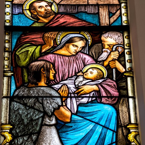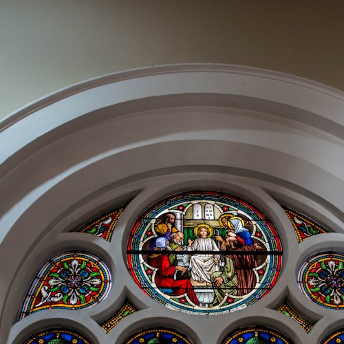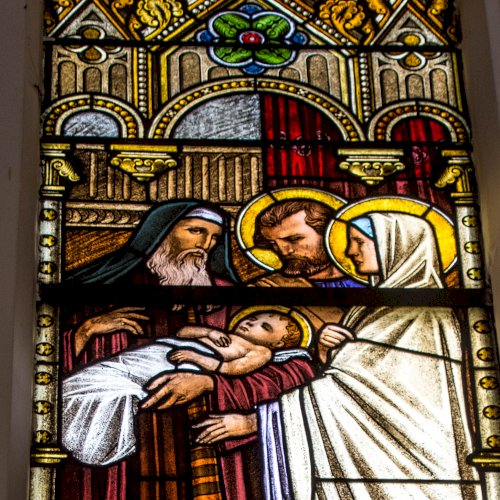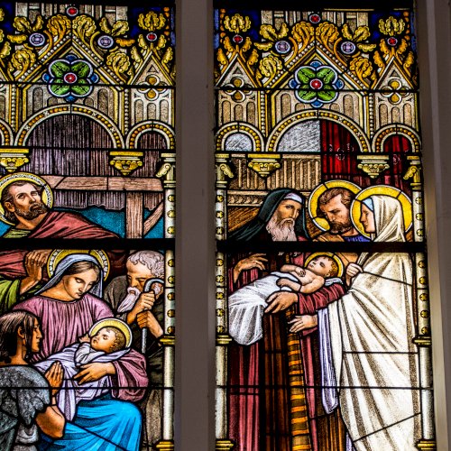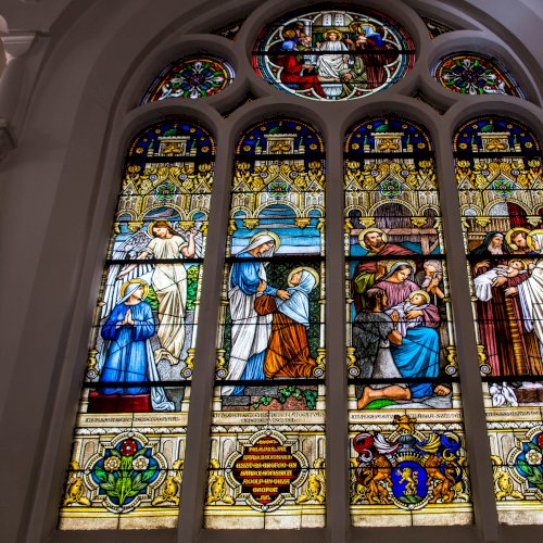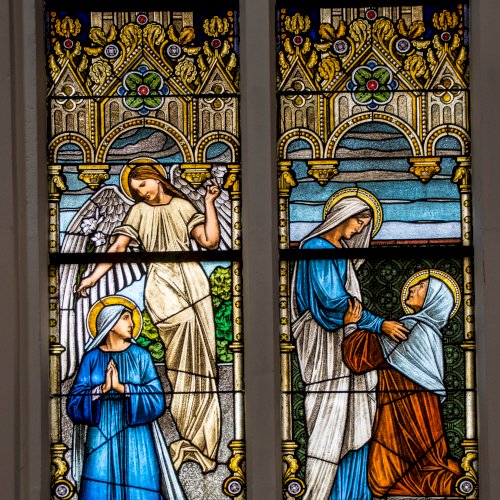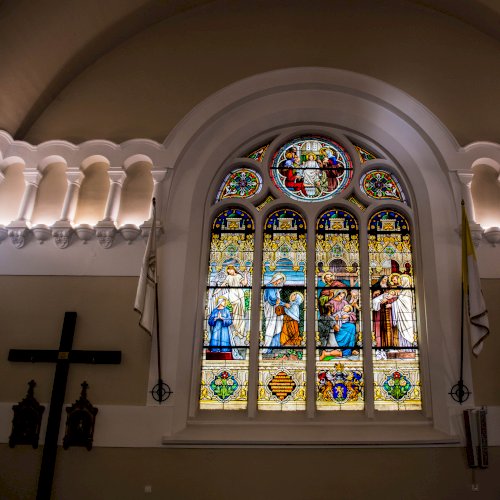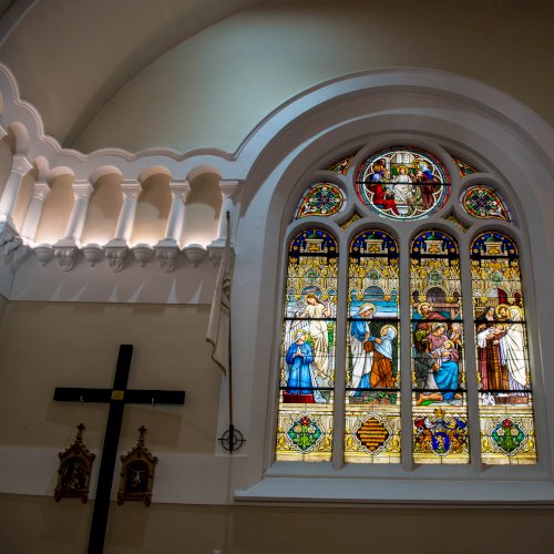 A szentély előtti bal oldali óriás üvegablakon az Örvendetes szent olvasó titkainak eseményeit örökítette meg a művész: