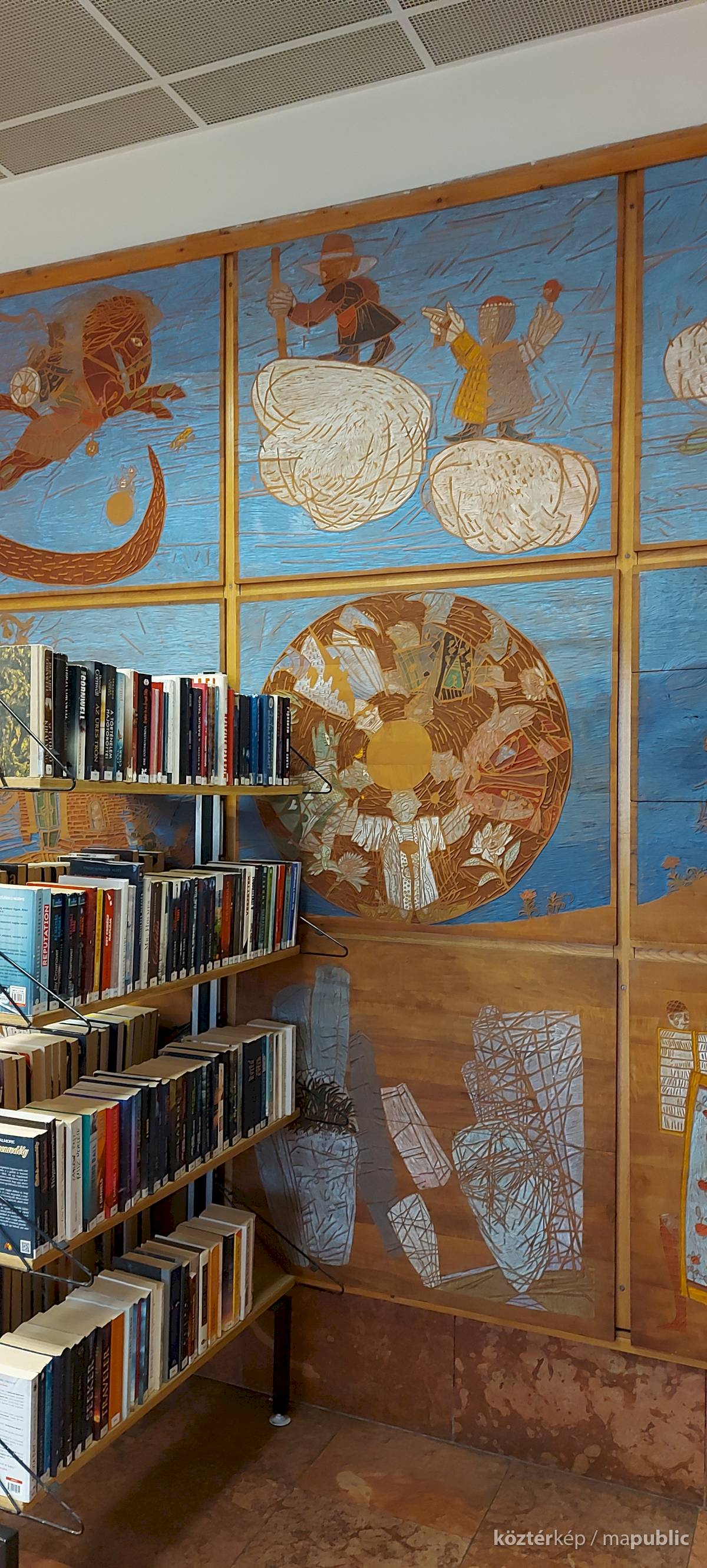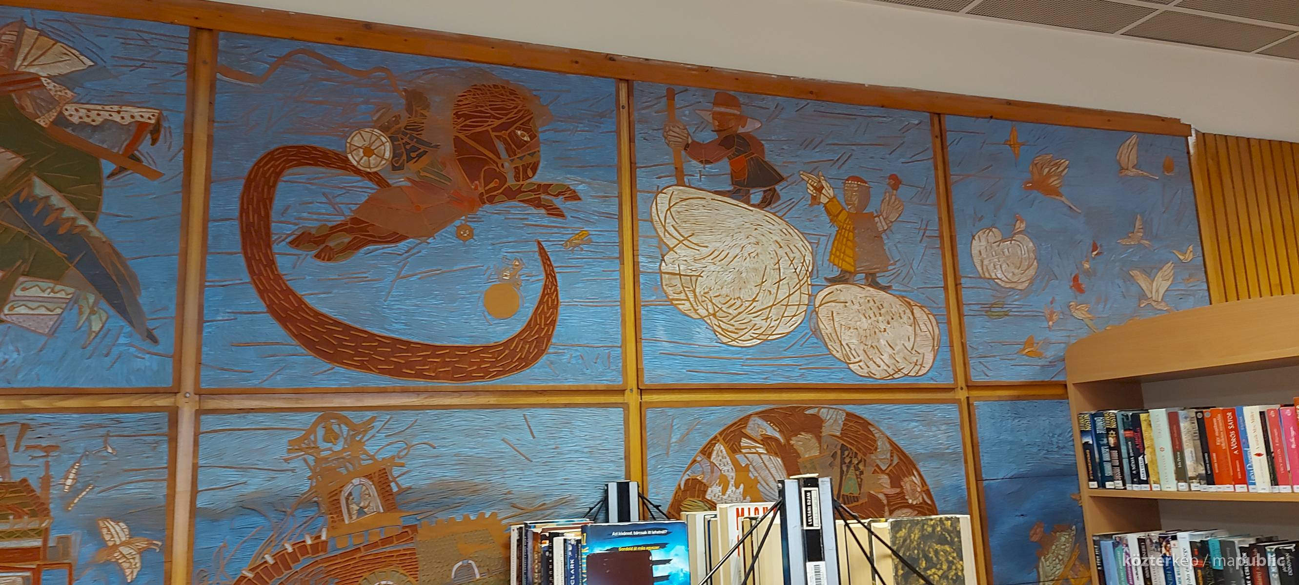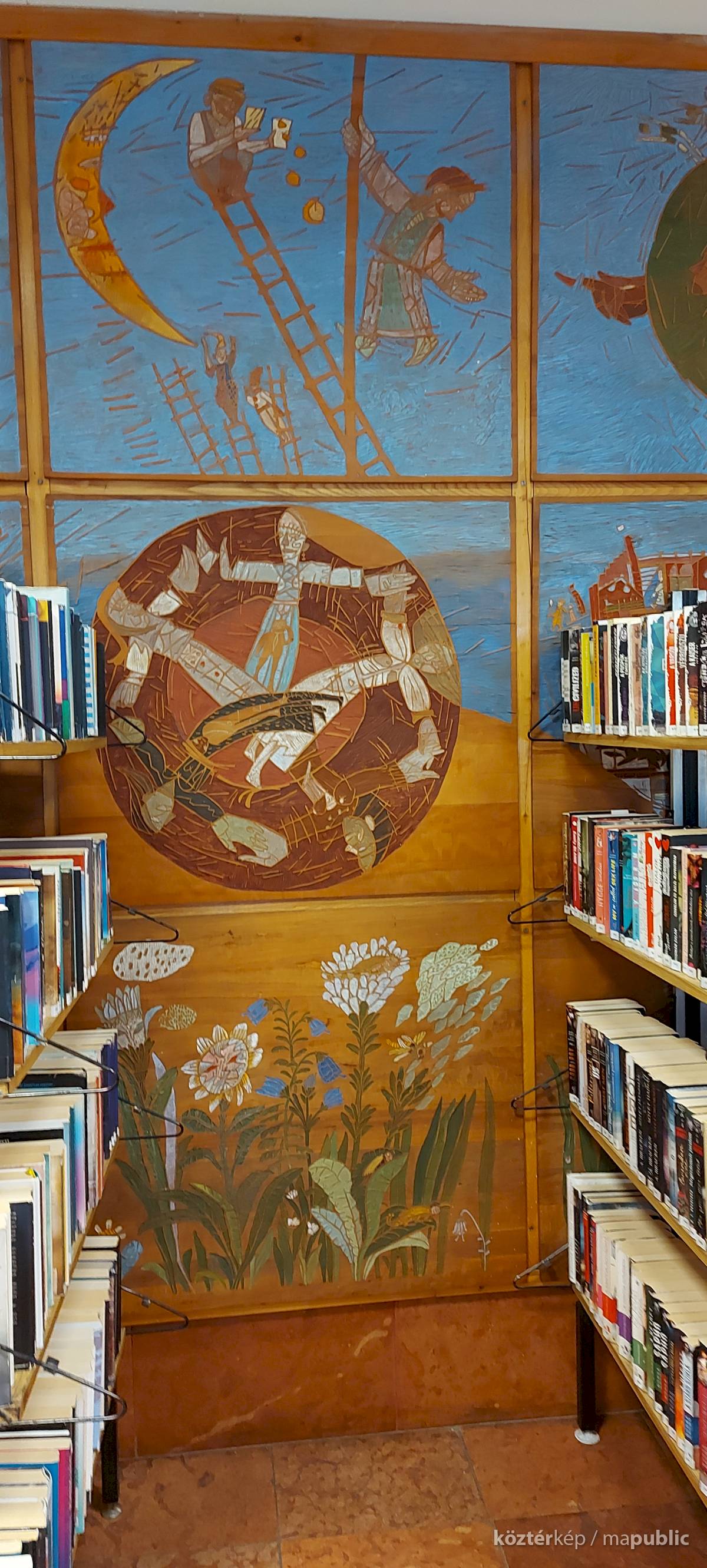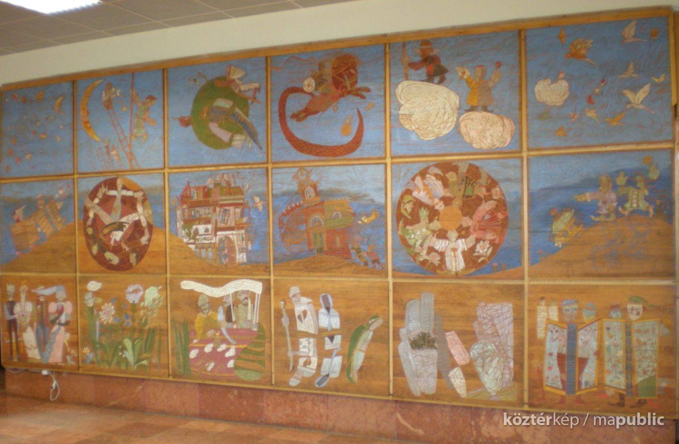 A Mesefal 1984-ben került a könyvtár földszintjén lévő Hírlapolvasó (ma Tájoló a neve) ablakokkal szemközti falára. Jelenleg az alkotás előtt könyvespolcok húzódnak, így teljes egészében csak régi fényképeken látható a 18 kazettából álló falikép. A fakazettákon különböző meseelemek jelennek meg. A művész „a lányának mondott történetekből merített, valamint népmesei és az irodalomból kölcsönzött elemeket használt fel, szabadon formálva őket az egyes táblákon. Van, ahol konkrétan felismerhető egy népmese, van, ahol egy-egy mesére utaló motívum figyelhető meg. Az is előfordul, hogy alig fedezhető fel konkrét kapcsolat a forrás és a megjelenő kép között, mégis a művész valamilyen irodalmi élményén alapul.” [1] A táblaképek önállóan is értelmezhetők, de a teljes mesebirodalom a18 elemből áll össze. Az alkotó szándéka az volt „hogy a műve technikáját tekintve is illeszkedjék a könyvtárhoz. Ezért olyan nyomóformákat készített, melyek a nyomtatott könyv elődjére, a táblanyomatokra emlékeztetnek.” [2]