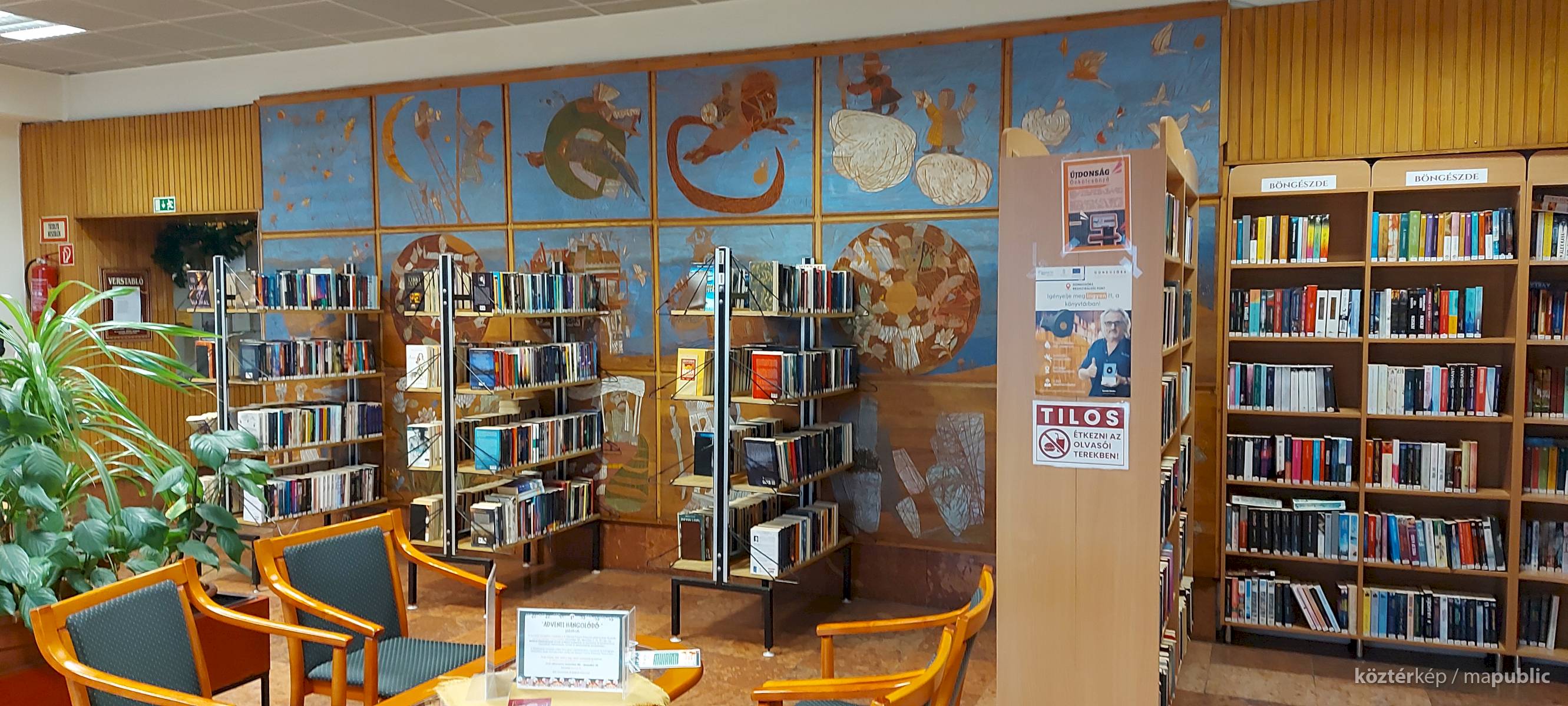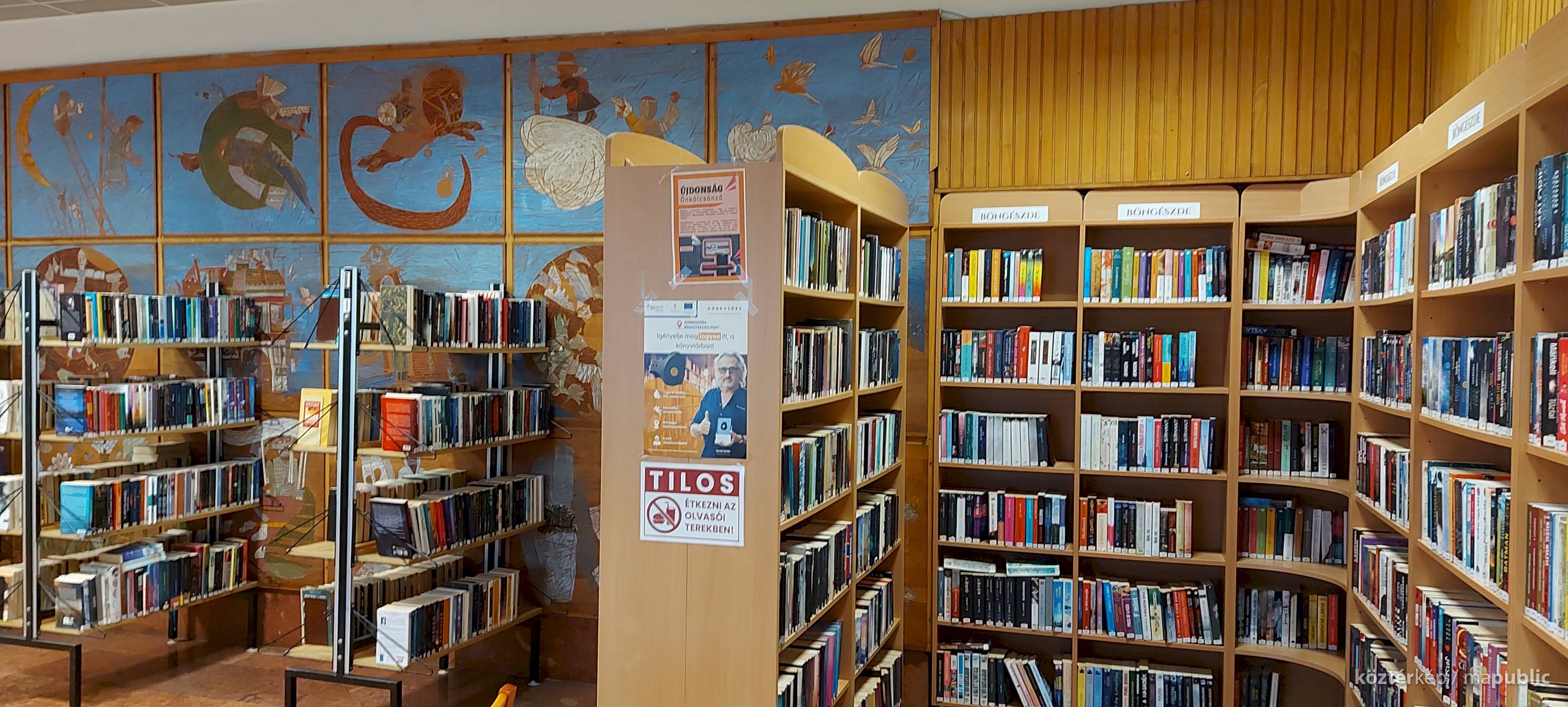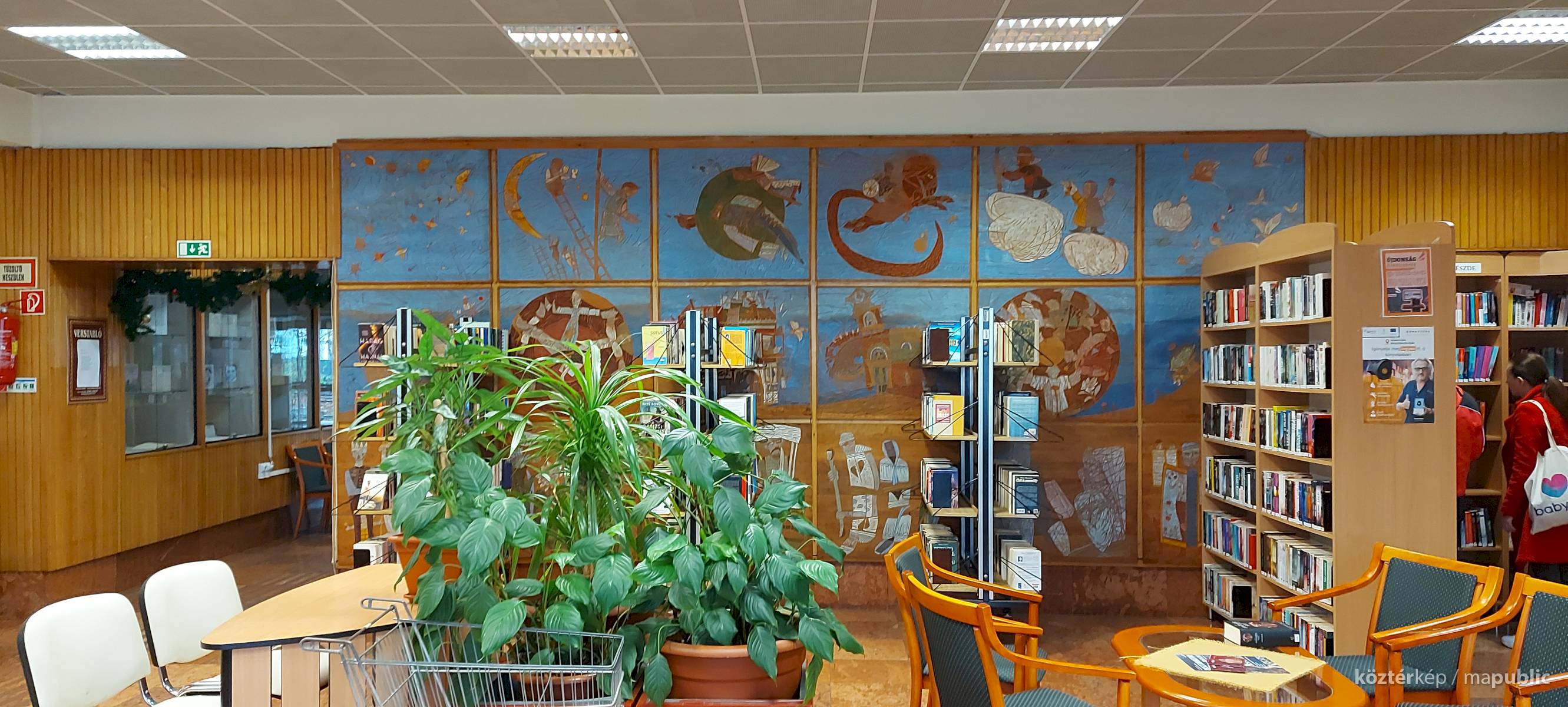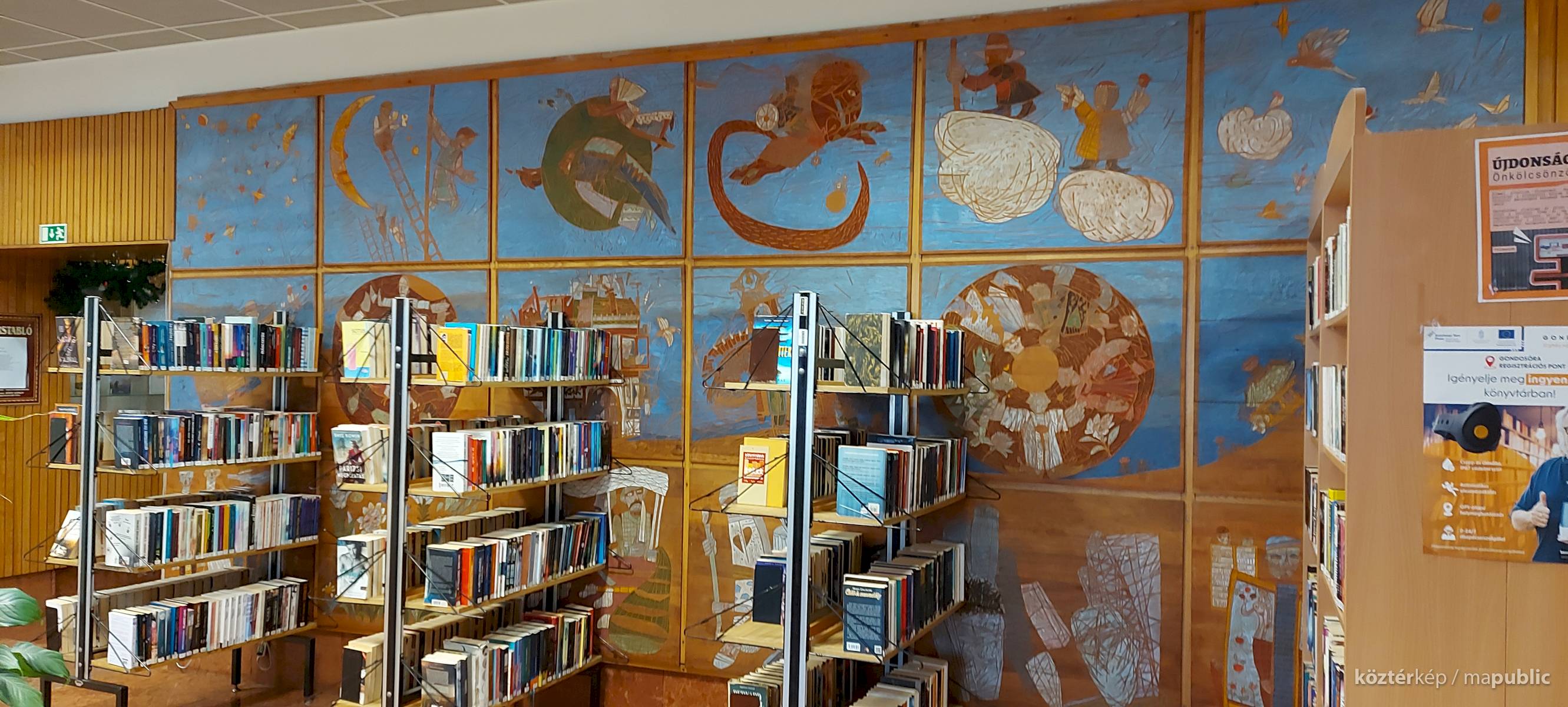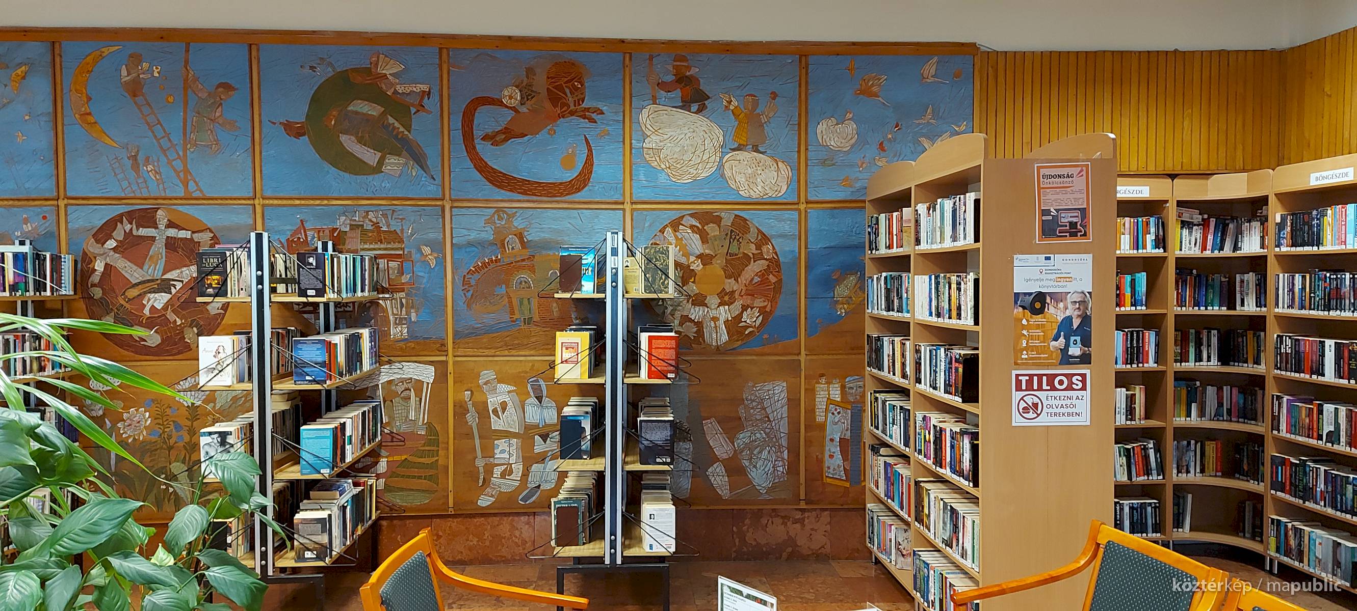 A Mesefal 1984-ben került a könyvtár földszintjén lévő Hírlapolvasó (ma Tájoló a neve) ablakokkal szemközti falára. Jelenleg az alkotás előtt könyvespolcok húzódnak, így teljes egészében csak régi fényképeken látható a 18 kazettából álló falikép. A fakazettákon különböző meseelemek jelennek meg. A művész „a lányának mondott történetekből merített, valamint népmesei és az irodalomból kölcsönzött elemeket használt fel, szabadon formálva őket az egyes táblákon. Van, ahol konkrétan felismerhető egy népmese, van, ahol egy-egy mesére utaló motívum figyelhető meg. Az is előfordul, hogy alig fedezhető fel konkrét kapcsolat a forrás és a megjelenő kép között, mégis a művész valamilyen irodalmi élményén alapul.” [1] A táblaképek önállóan is értelmezhetők, de a teljes mesebirodalom a18 elemből áll össze. Az alkotó szándéka az volt „hogy a műve technikáját tekintve is illeszkedjék a könyvtárhoz. Ezért olyan nyomóformákat készített, melyek a nyomtatott könyv elődjére, a táblanyomatokra emlékeztetnek.” [2]