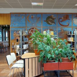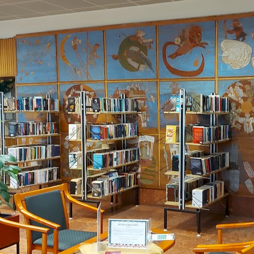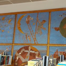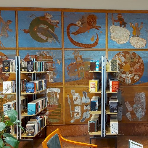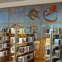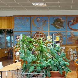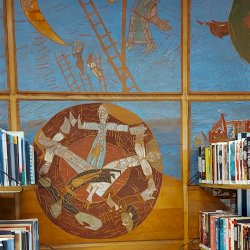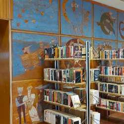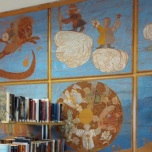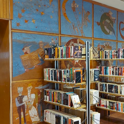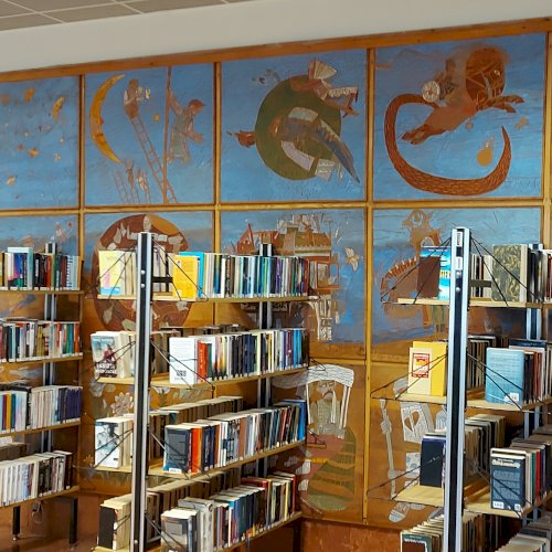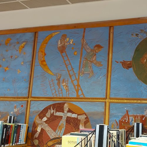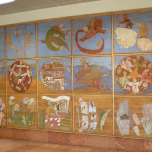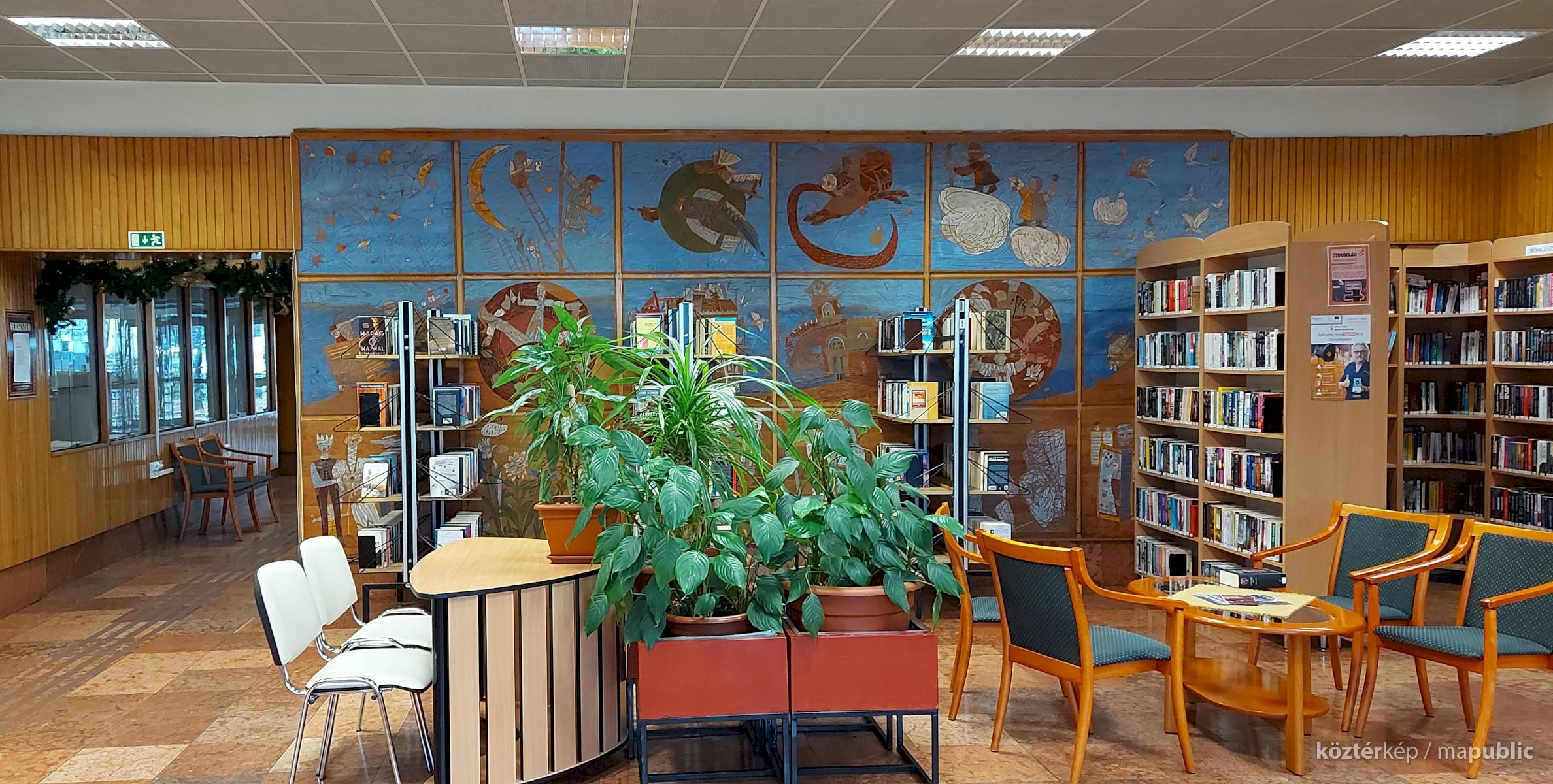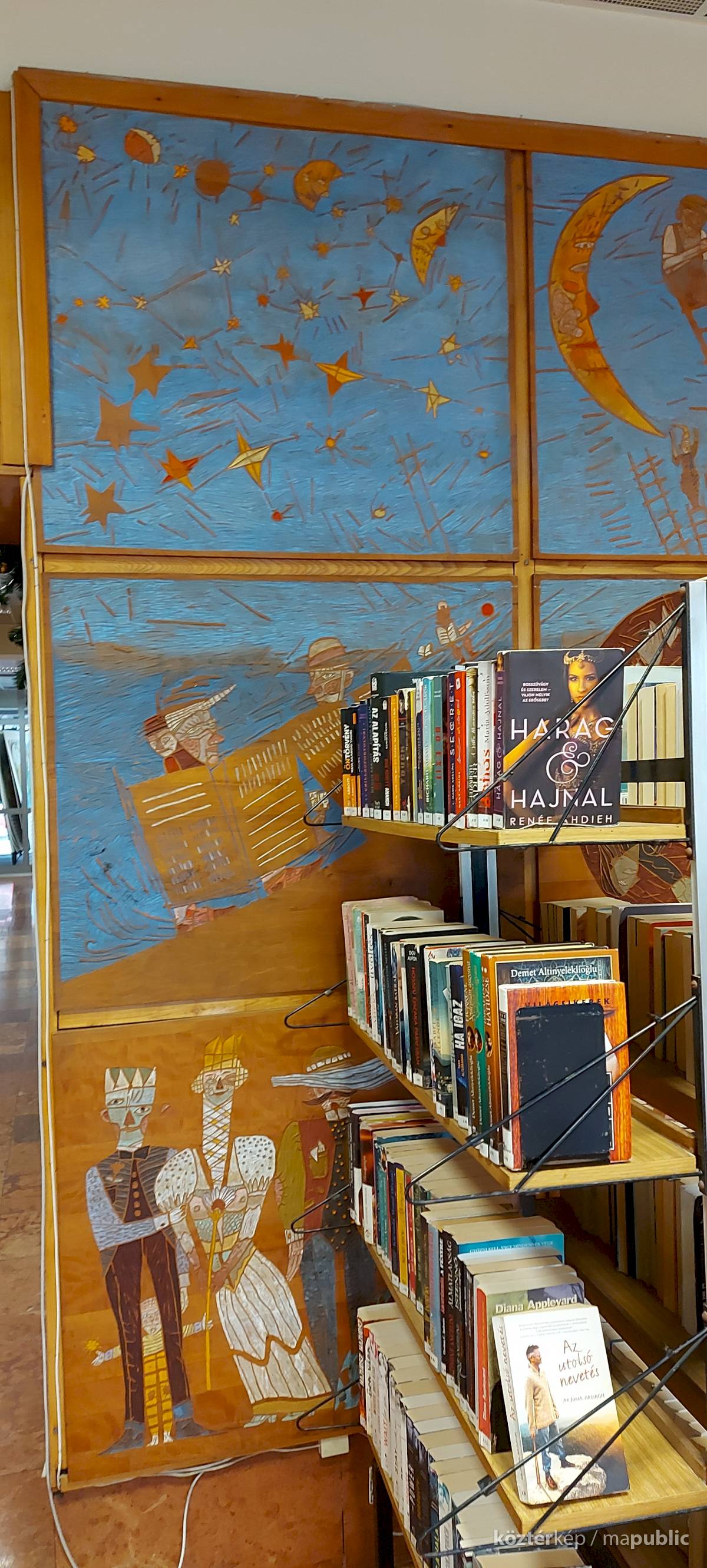 A Mesefal 1984-ben került a könyvtár földszintjén lévő Hírlapolvasó (ma Tájoló a neve) ablakokkal szemközti falára. Jelenleg az alkotás előtt könyvespolcok húzódnak, így teljes egészében csak régi fényképeken látható a 18 kazettából álló falikép. A fakazettákon különböző meseelemek jelennek meg. A művész „a lányának mondott történetekből merített, valamint népmesei és az irodalomból kölcsönzött elemeket használt fel, szabadon formálva őket az egyes táblákon. Van, ahol konkrétan felismerhető egy népmese, van, ahol egy-egy mesére utaló motívum figyelhető meg. Az is előfordul, hogy alig fedezhető fel konkrét kapcsolat a forrás és a megjelenő kép között, mégis a művész valamilyen irodalmi élményén alapul.” [1] A táblaképek önállóan is értelmezhetők, de a teljes mesebirodalom a18 elemből áll össze. Az alkotó szándéka az volt „hogy a műve technikáját tekintve is illeszkedjék a könyvtárhoz. Ezért olyan nyomóformákat készített, melyek a nyomtatott könyv elődjére, a táblanyomatokra emlékeztetnek.” [2]