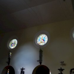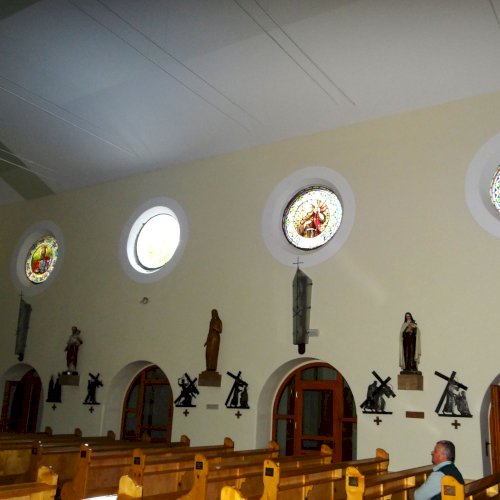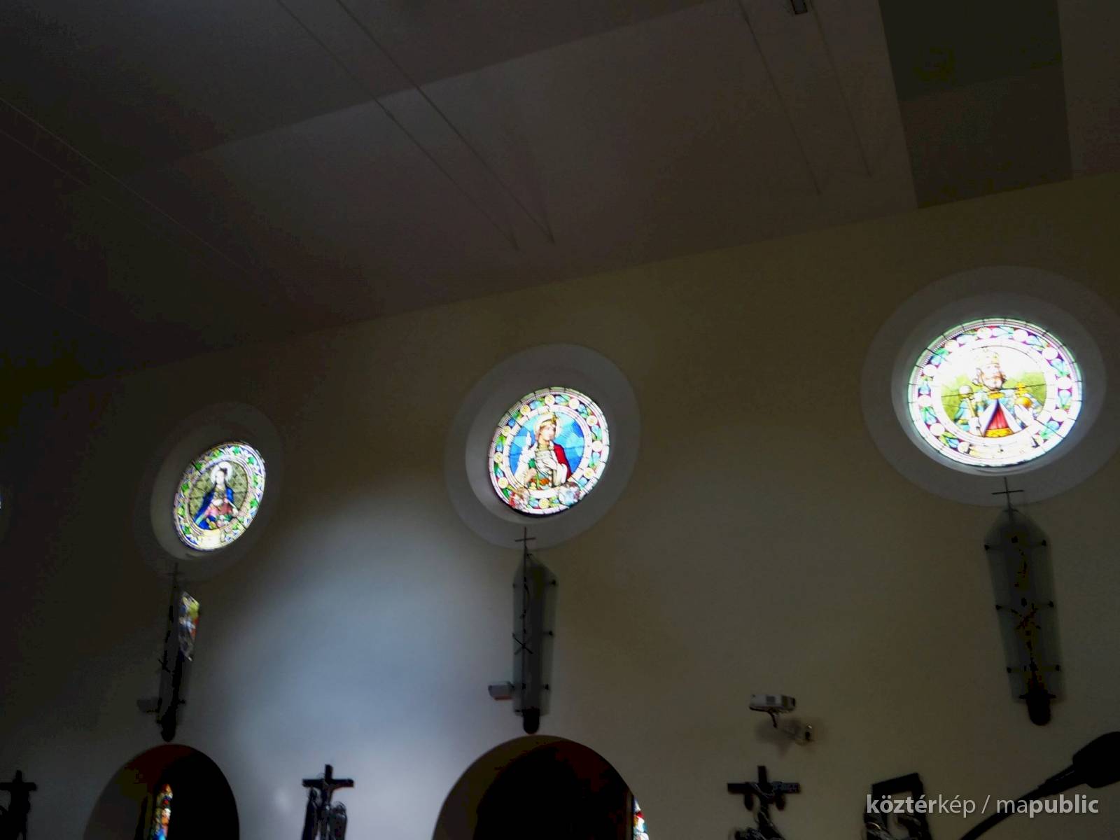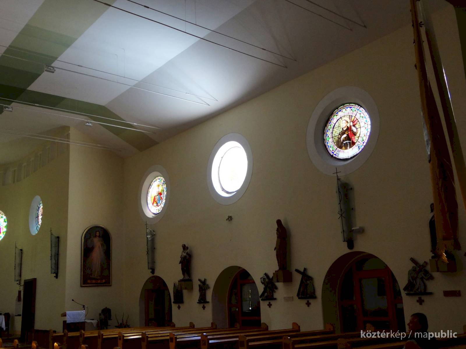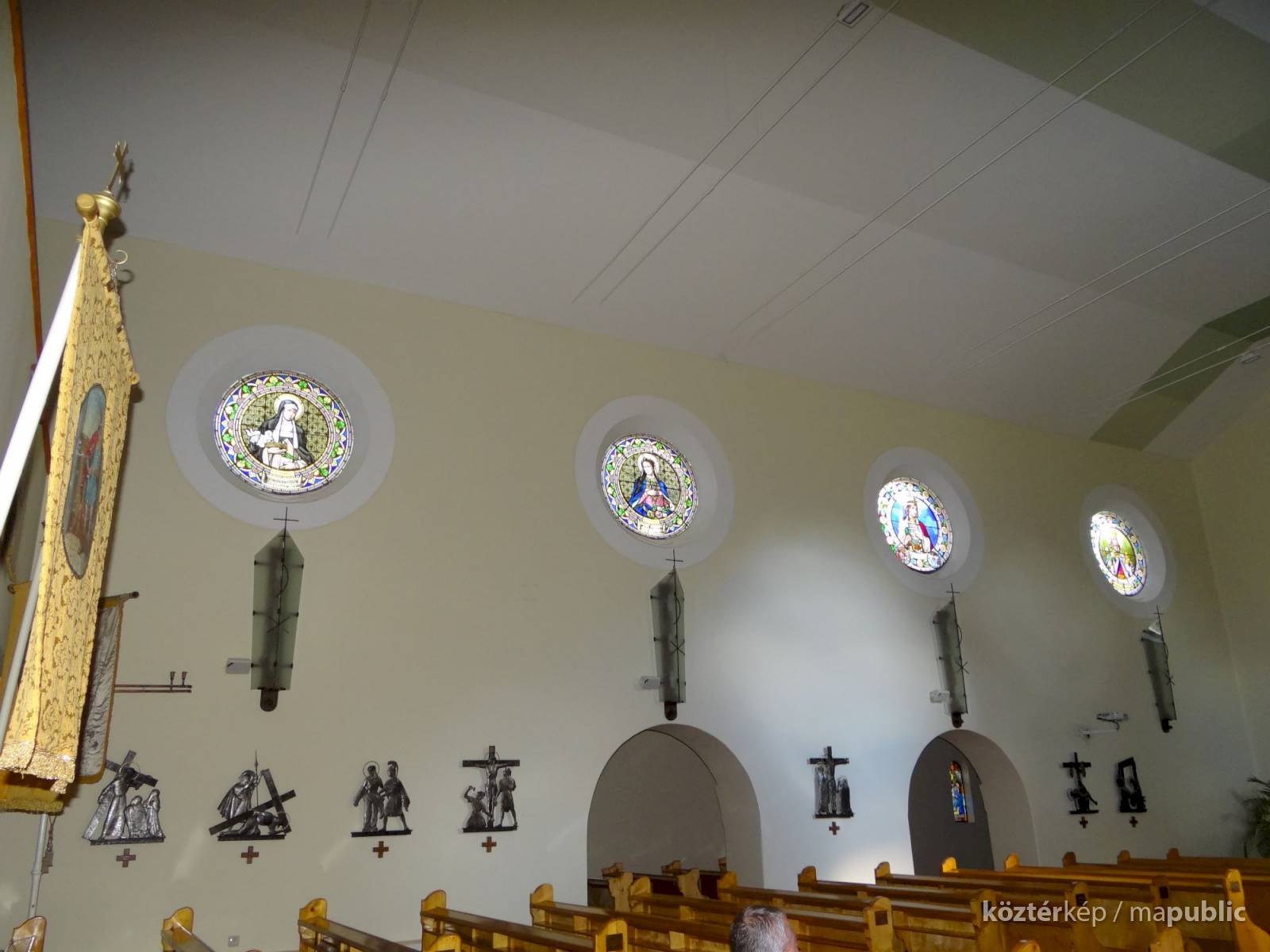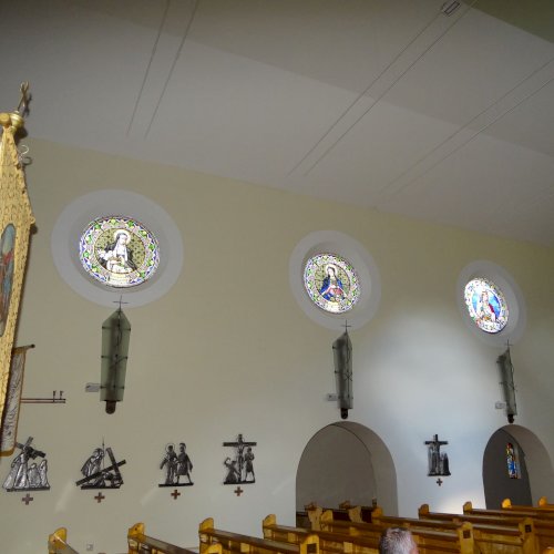 A templom hajójának két oldalfalán sorakoznak a további kerek üvegablakok (forrás szerint ún. "rózsaablakok", készítés: 1923-ban, Palka József alkotásai.