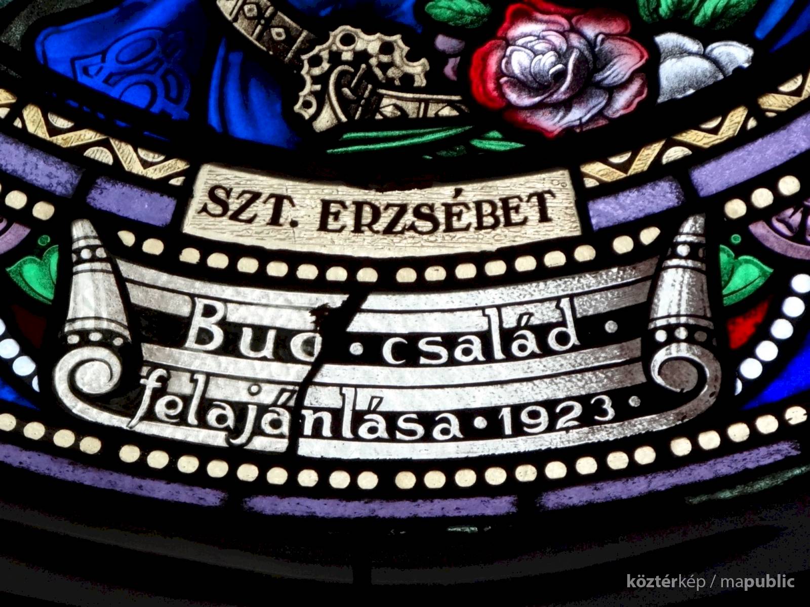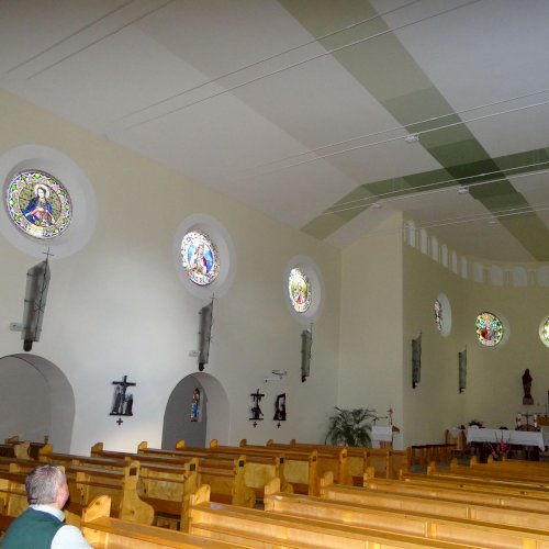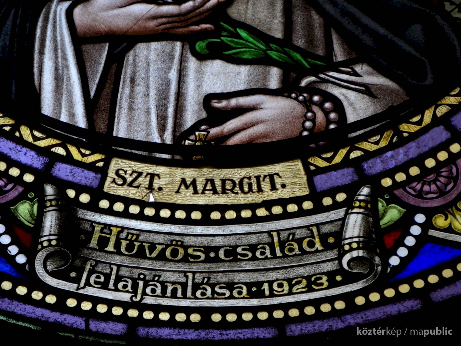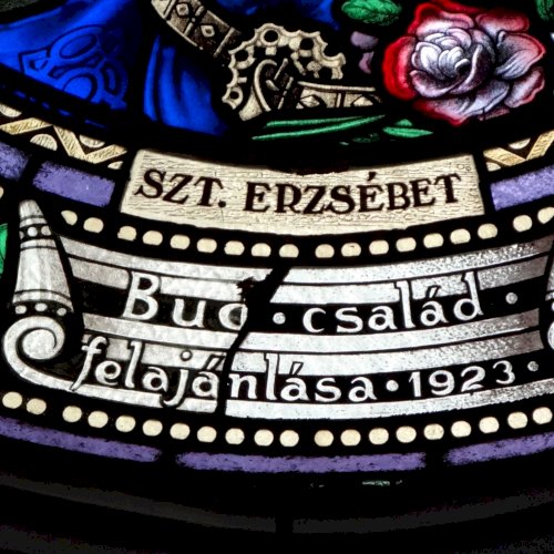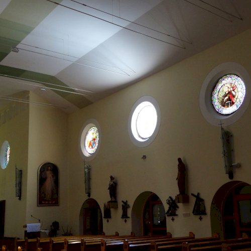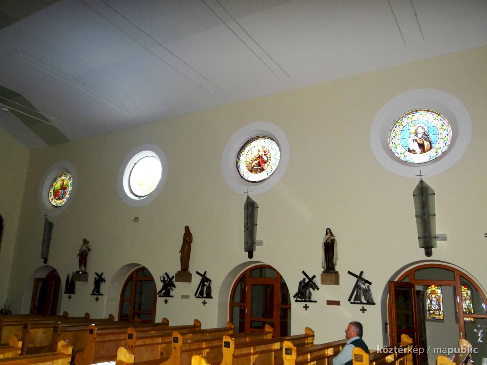A templom hajójának két oldalfalán sorakoznak a további kerek üvegablakok (forrás szerint ún. "rózsaablakok", készítés: 1923-ban, Palka József alkotásai.