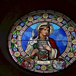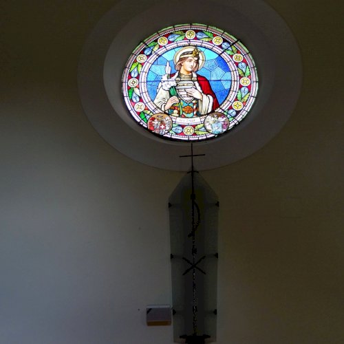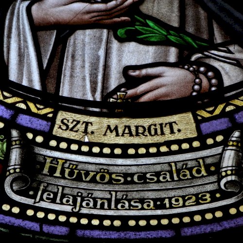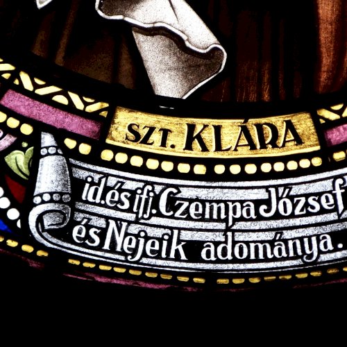 Templomtörténet a kapcsolt lapon (szentély üvegablakai).