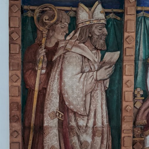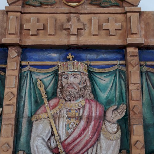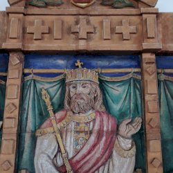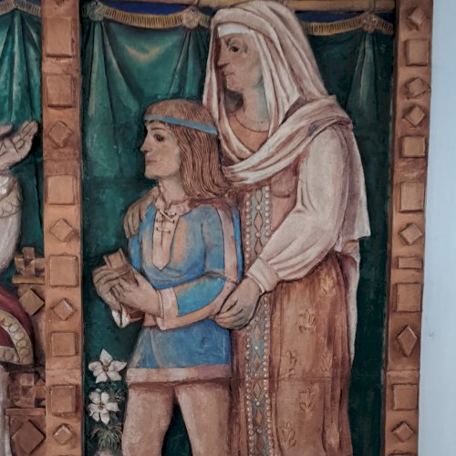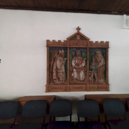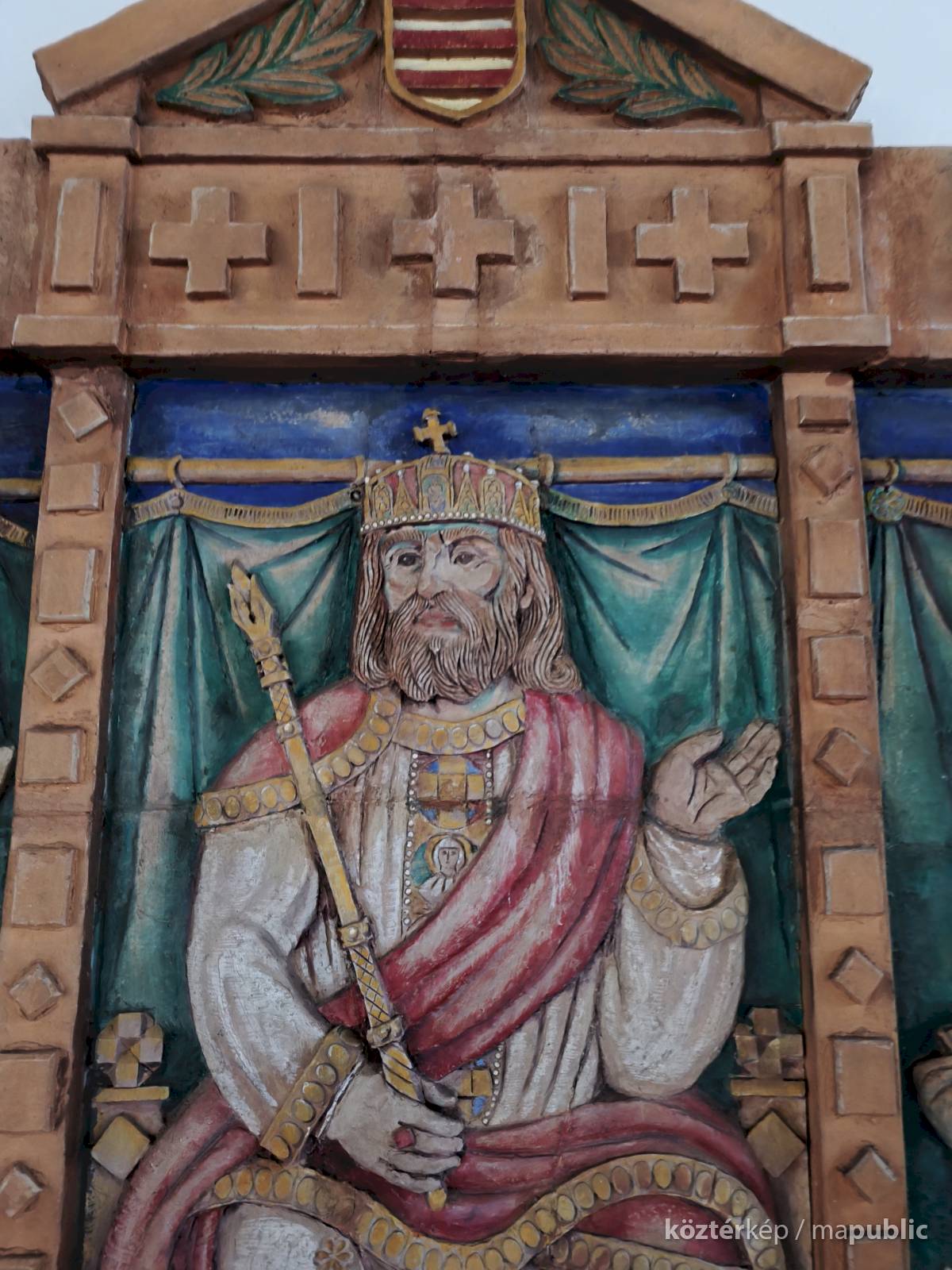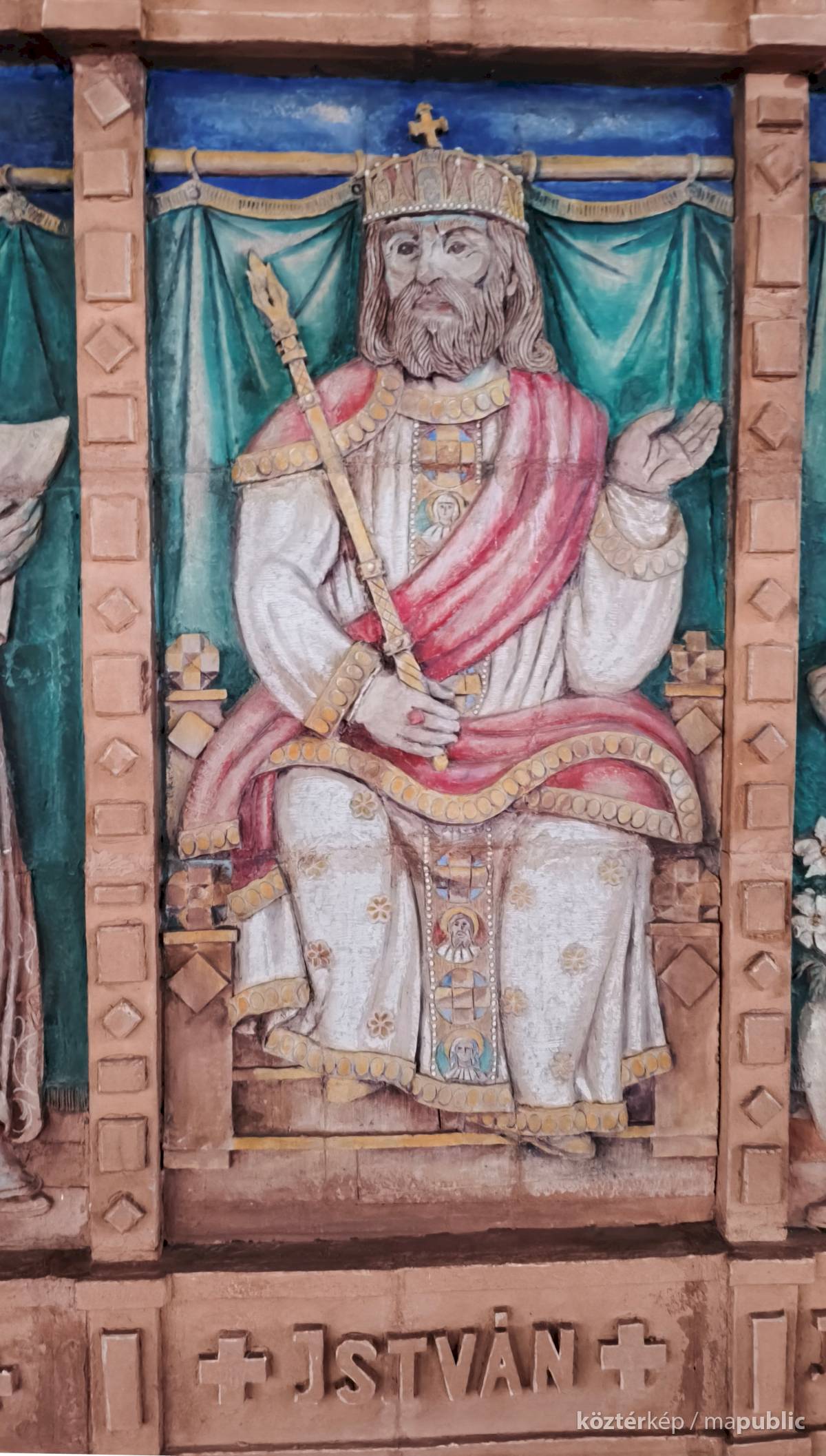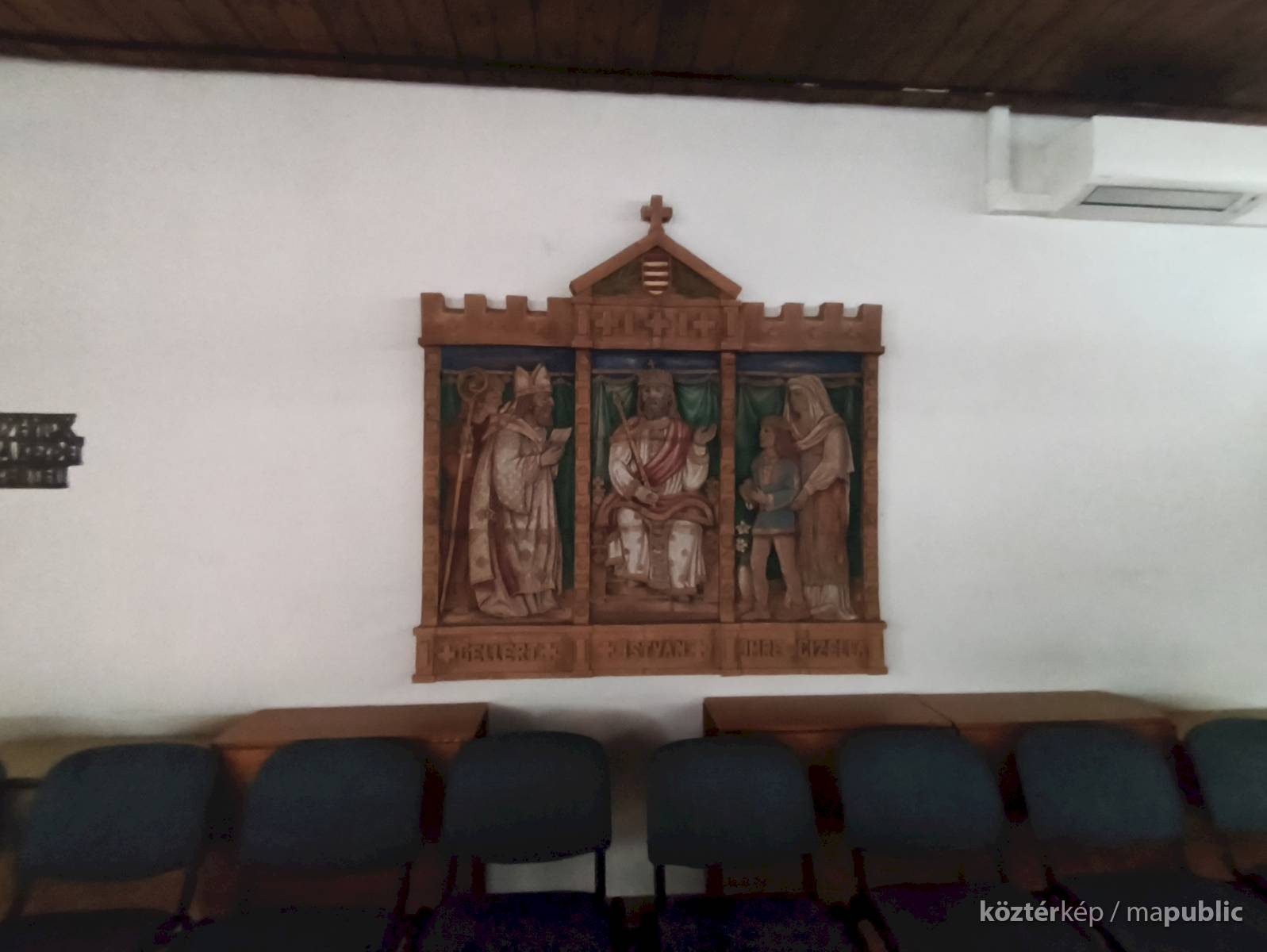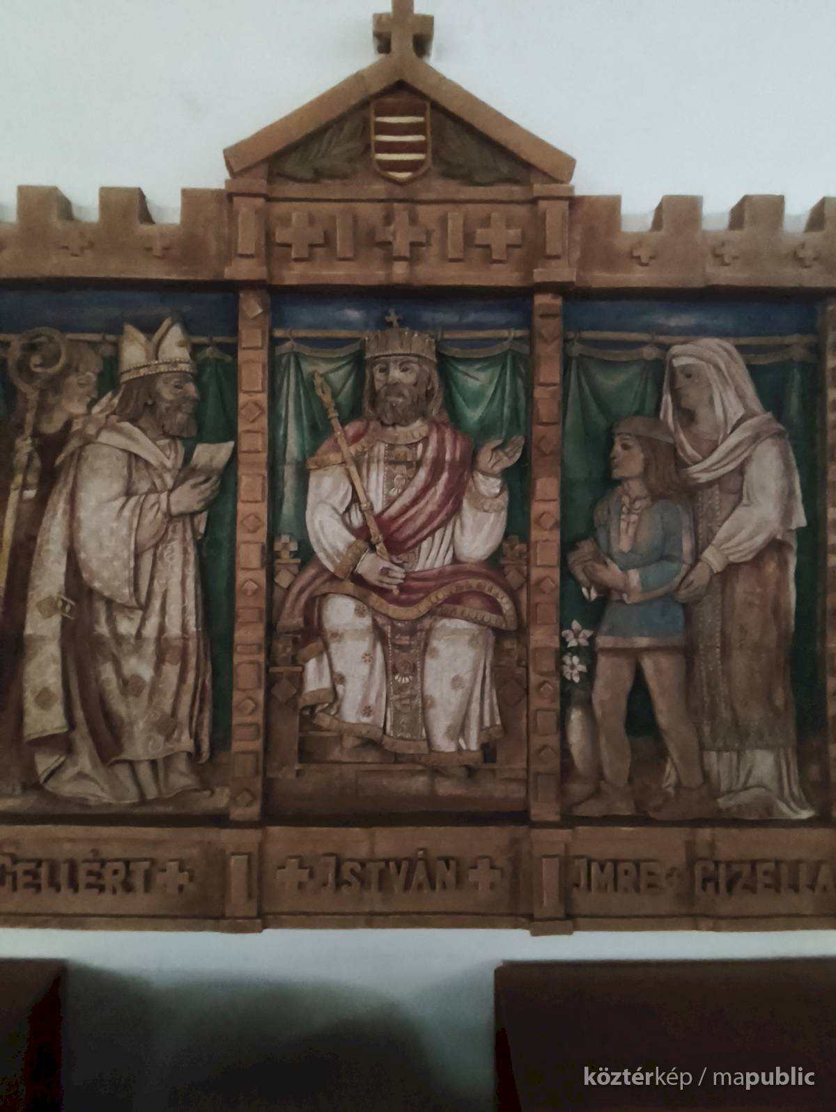 A színezett, vagy festett terrakotta dombormű nagy méterű, középen Szent István király, [3] kezében a jogarral, fején a Szent Korona, ül a trónon díszes ruhában palástban. Baljával fiára Szent Imrére [4] és nejére, a királynéra Boldog Gizellára [5] mutat. Jobbján Szent Gellért [6] püspök , (a plébánia névadója) mögötte szerzetesi ruhában Szent Asztrik [7] érsek áll. A szenteket egy templomot stilizáló keretbe foglalta az alkotó, középen Árpádsávos pajzs és pálmaágak láthatók, felettük kereszt. Az alakok kék háttérben (díszletben) állnak melyet egy zöld függöny takar. Az alkotáson feltűnnek a szentek attribútumai, a pásztorbot a liliom stb... Alul a nevek domborműve, valamint az alkotói szignó vésete és a készítés évszáma olvasható. Az alkotója Varga Mátyás híres szeged díszlet és jelmeztervező. https://www.kozterkep.hu/adattar/lexikon_szocikk/5019?kiemeles=varga%20m%C3%A1ty%C3%A1s Az alkotást 1985 novemberében avatták fel, a plébánia felszentelésének tizedik évfordulóján tartott, ünnepi szentmisén. A Kapuban álló Szent Gellért domborművel együtt. [8]