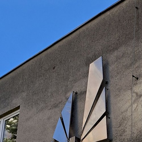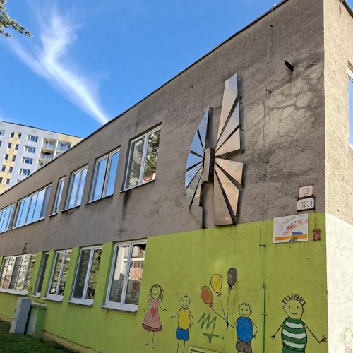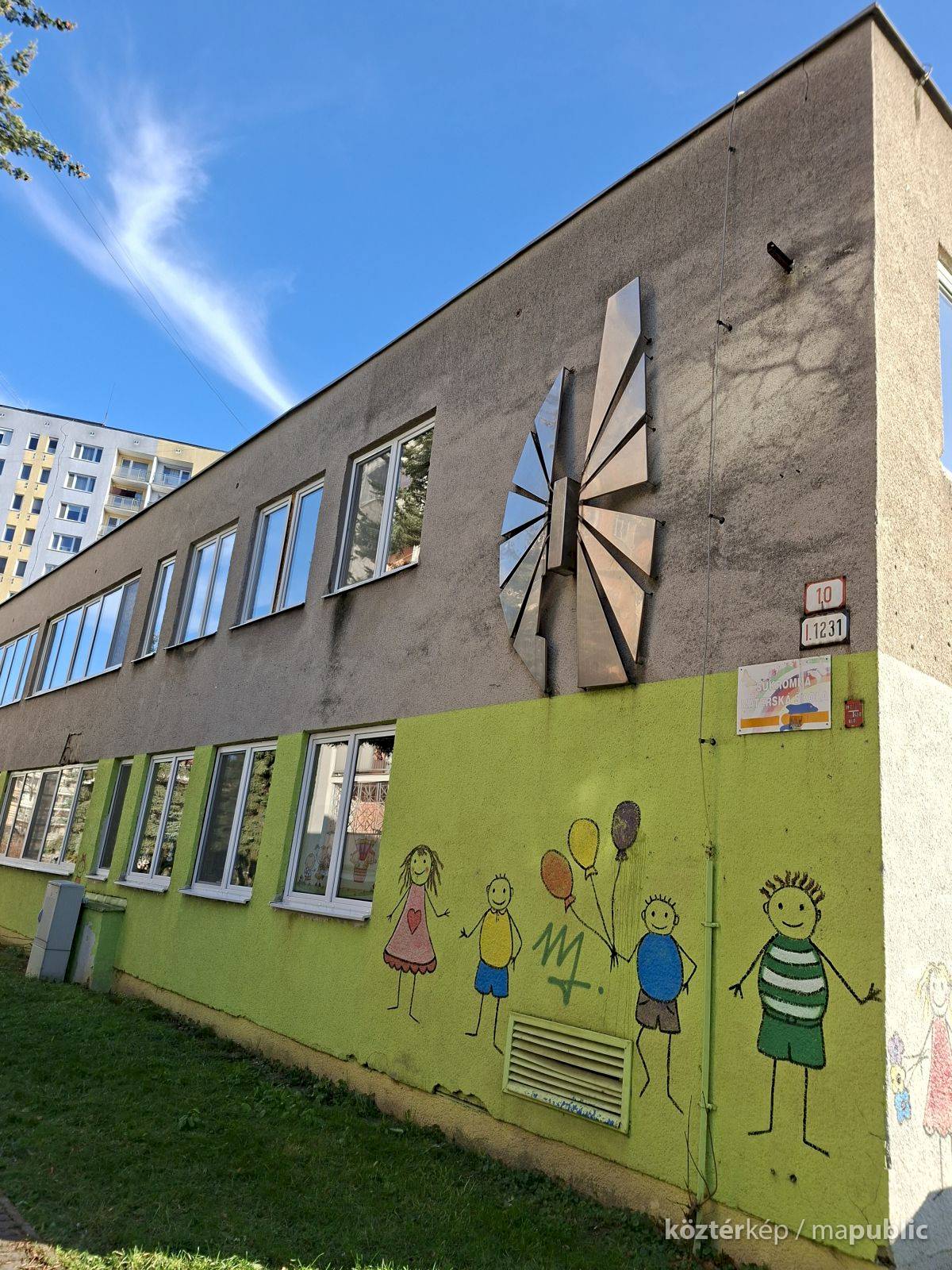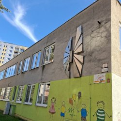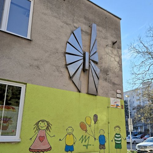 Egy sarki óvoda első emeleti homlokzatán fémből készült pillangóban gyönyörködhetünk modern ábrázolásban.