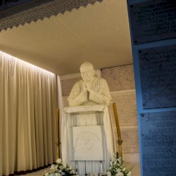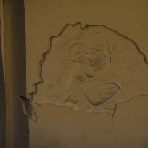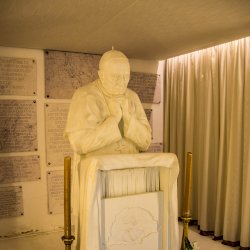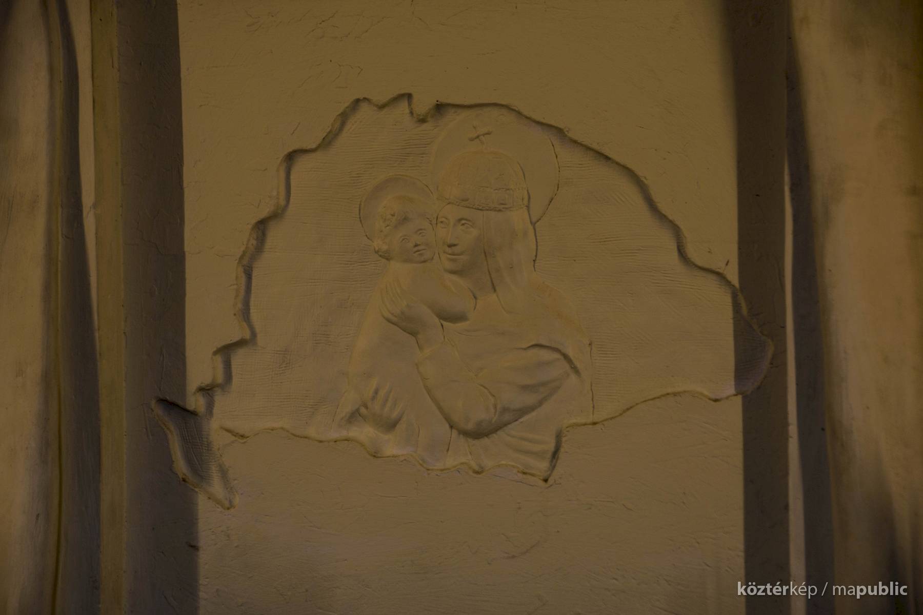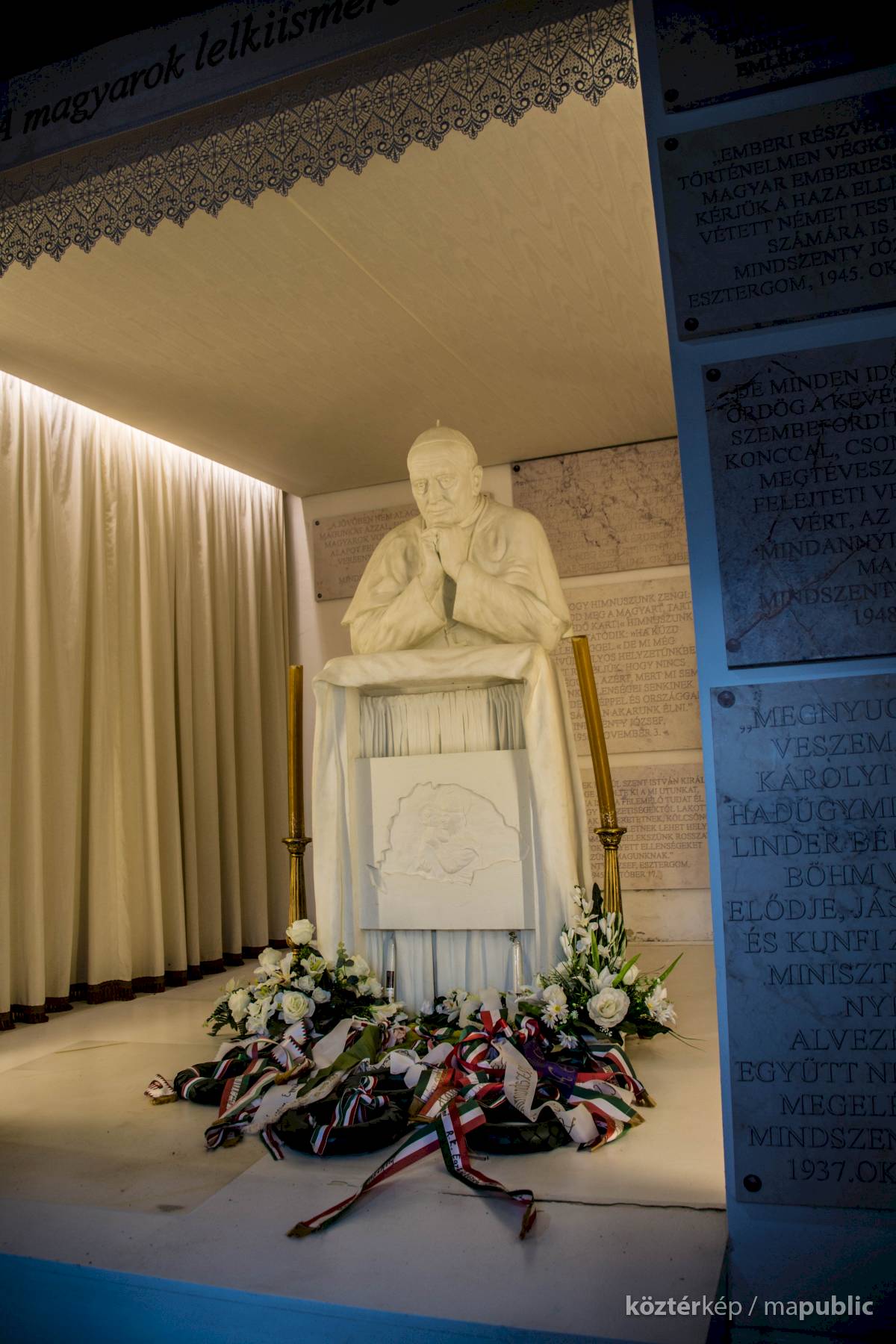 „Az üldöztetés idején a leghűségesebb Pásztor” térdeplőn imádkozik. A térdeplő támláján Magyarország térképen Nagyboldogasszony, a magyarok Patrónája domborműve áll.[1]
