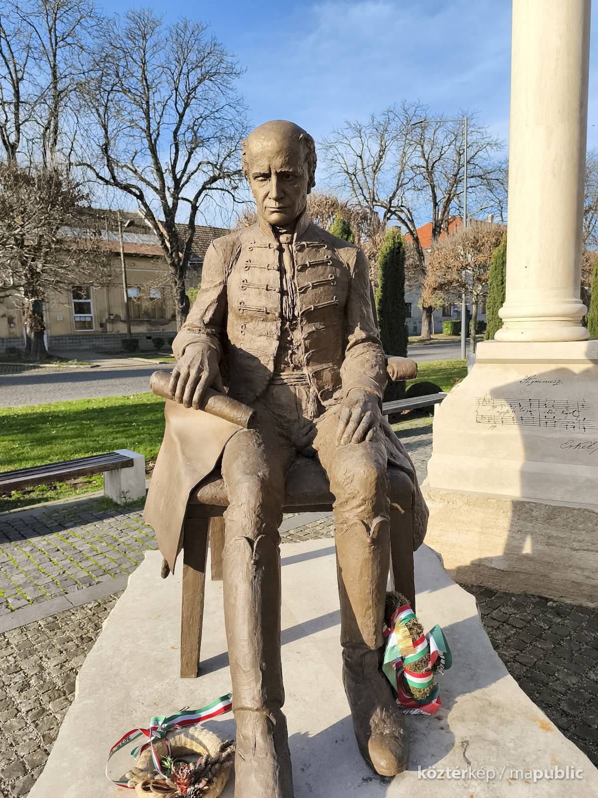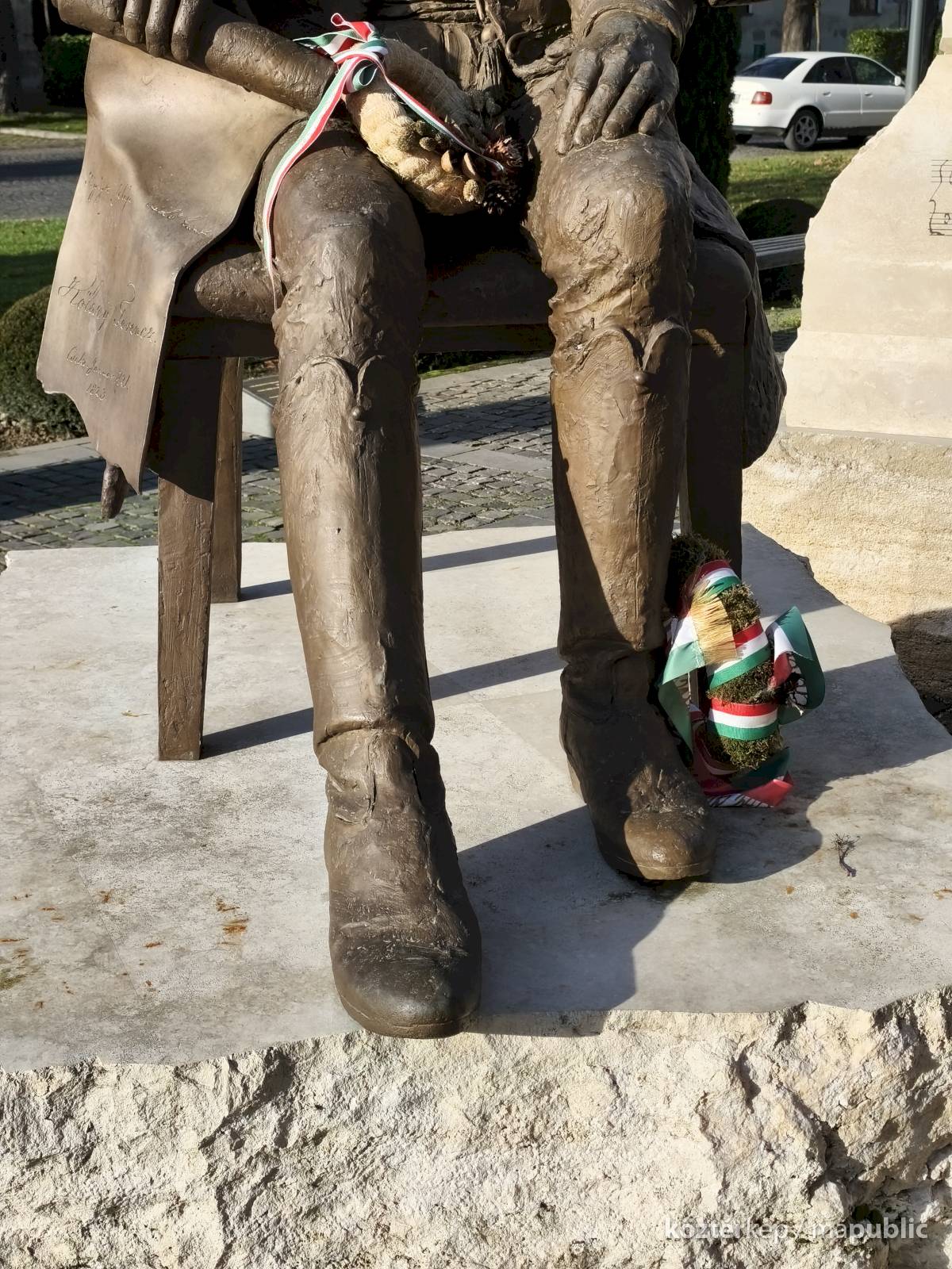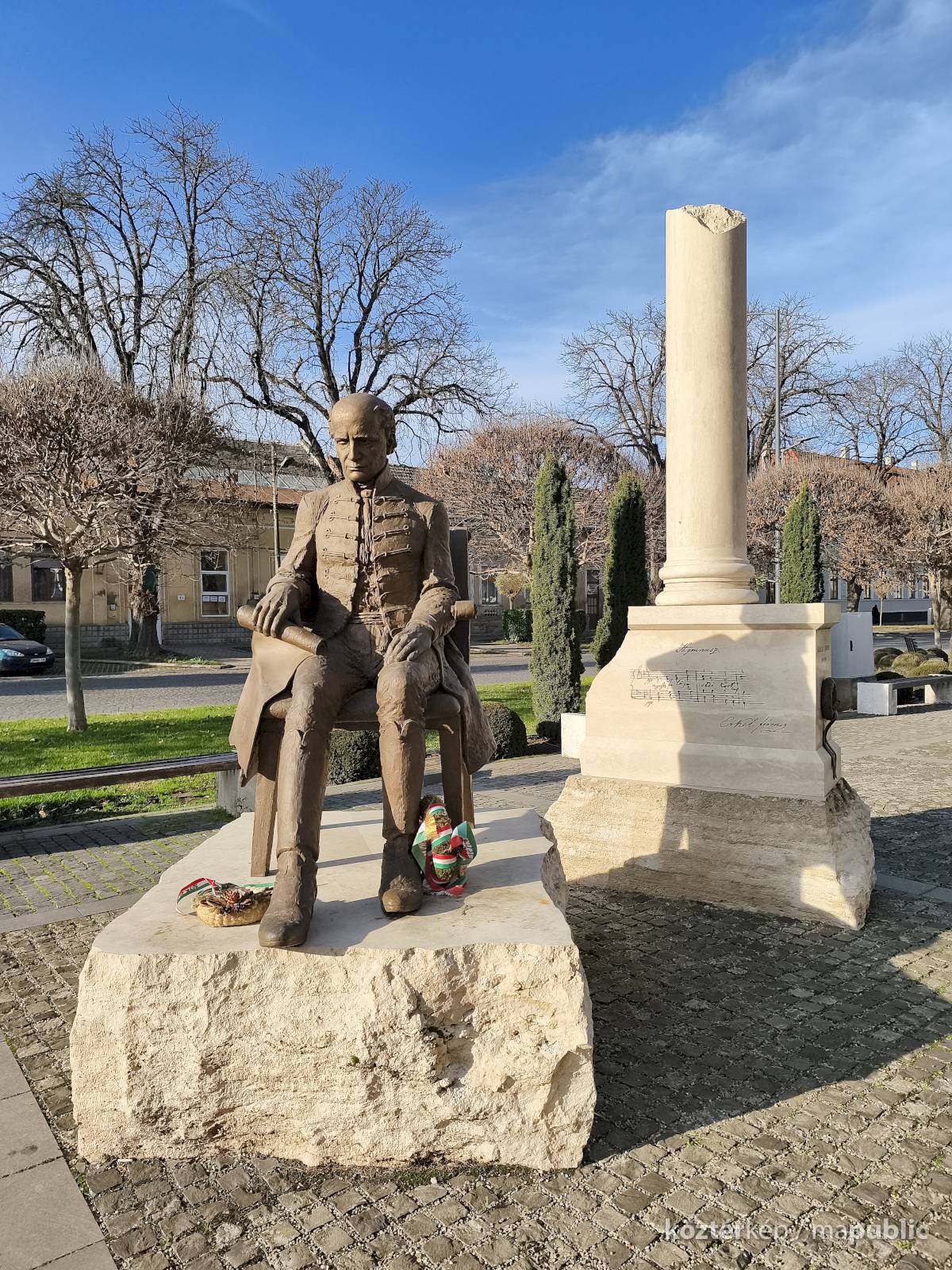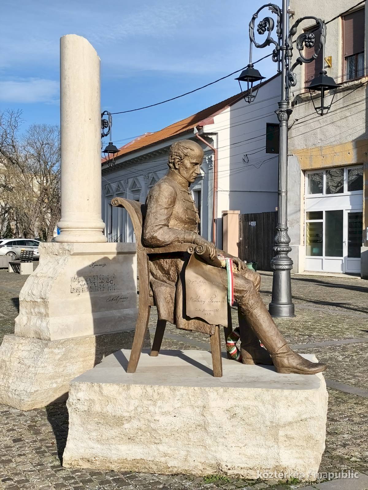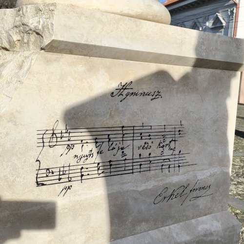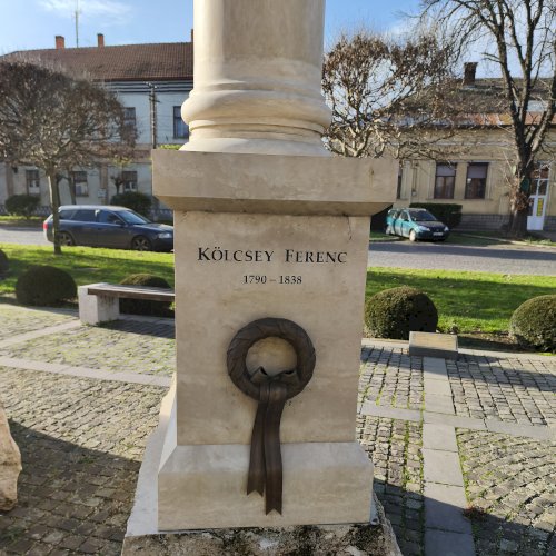 ... A helyszínen jelen volt a Kölcsey-szobor megalkotója, Győrfi Lajos szobrászművész is. A Maszolnak elmondta, a szoboralkotás során arra törekedett, hogy a formáknak belső kisugárzása legyen, hogy a testtartásból látszódjon, milyen ember is volt Kölcsey, akinek kezében egy pergamen van, amire a Himnusz második sorát vésték. „Nekem a Himnusz csak Kölcsey versével nem teljes, ezért a szobor mögött álló oszlopra felvéstem Erkelnek a kottáját” – tette hozzá." [3]