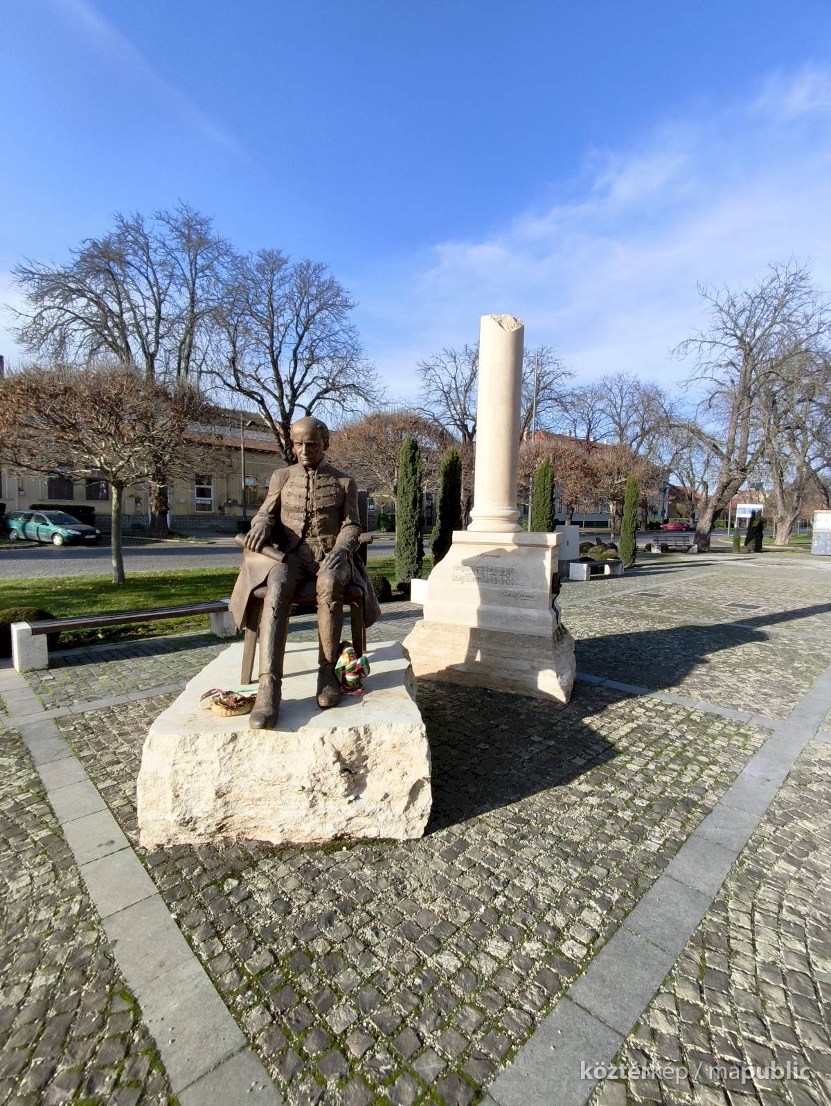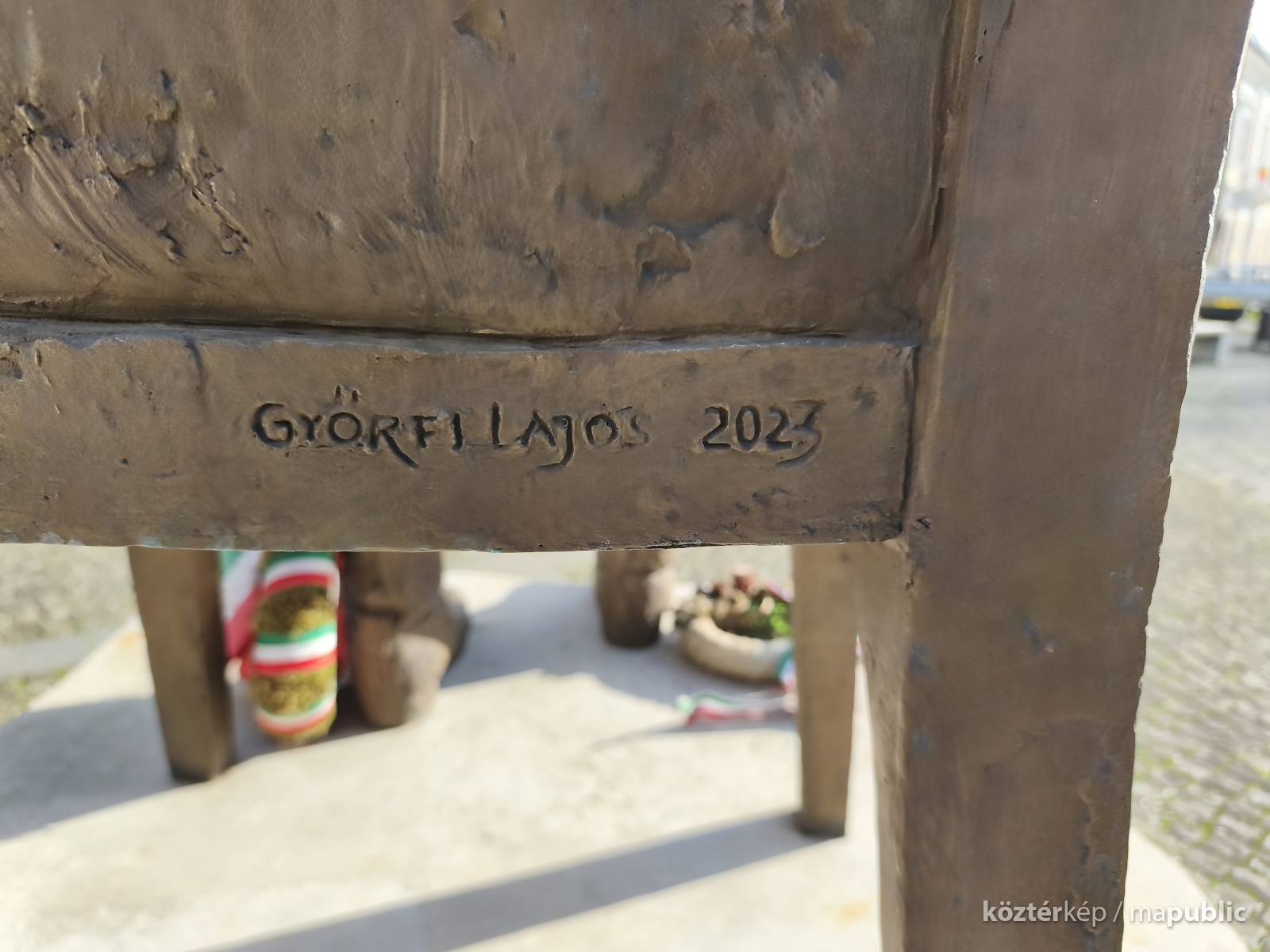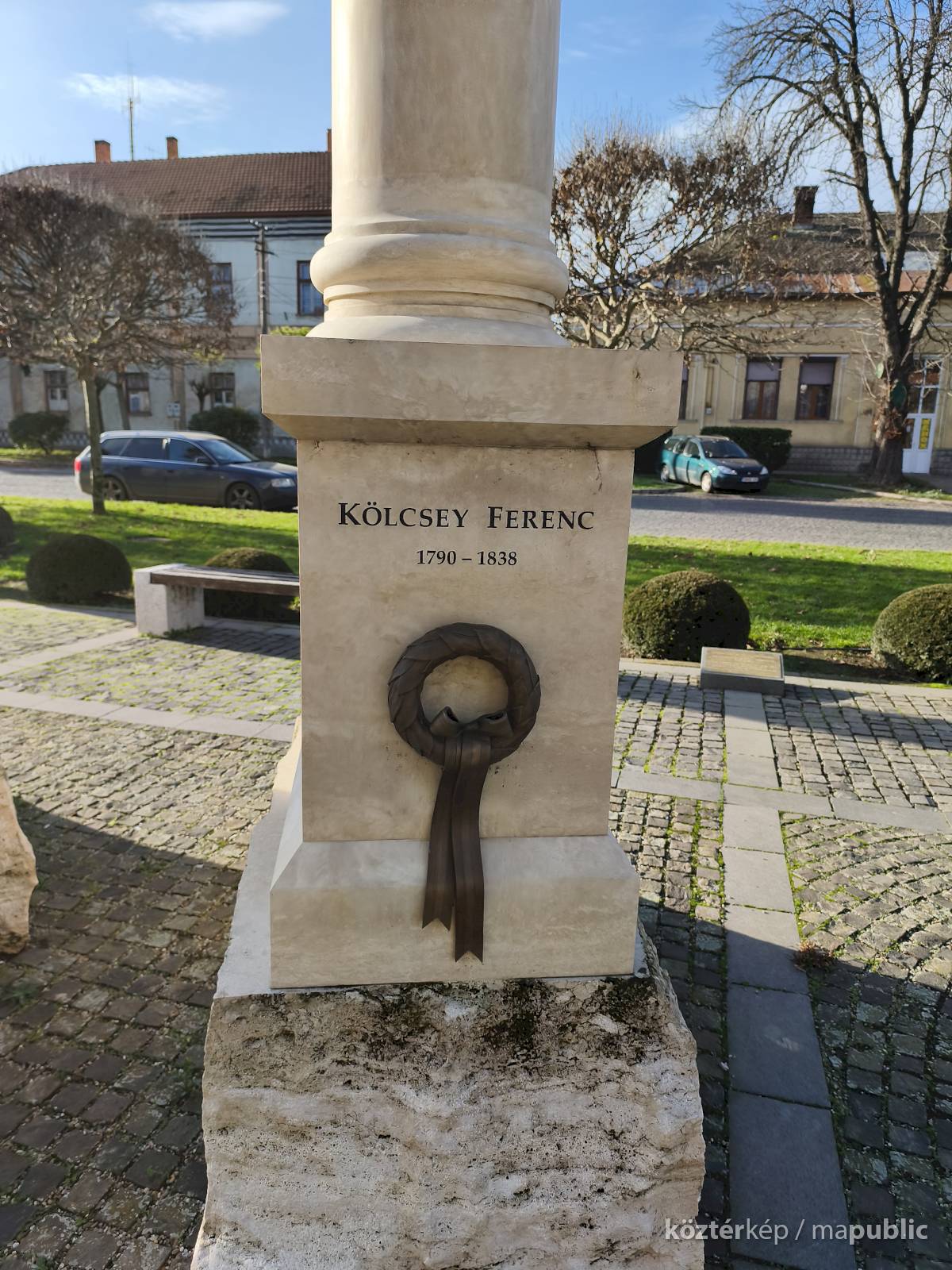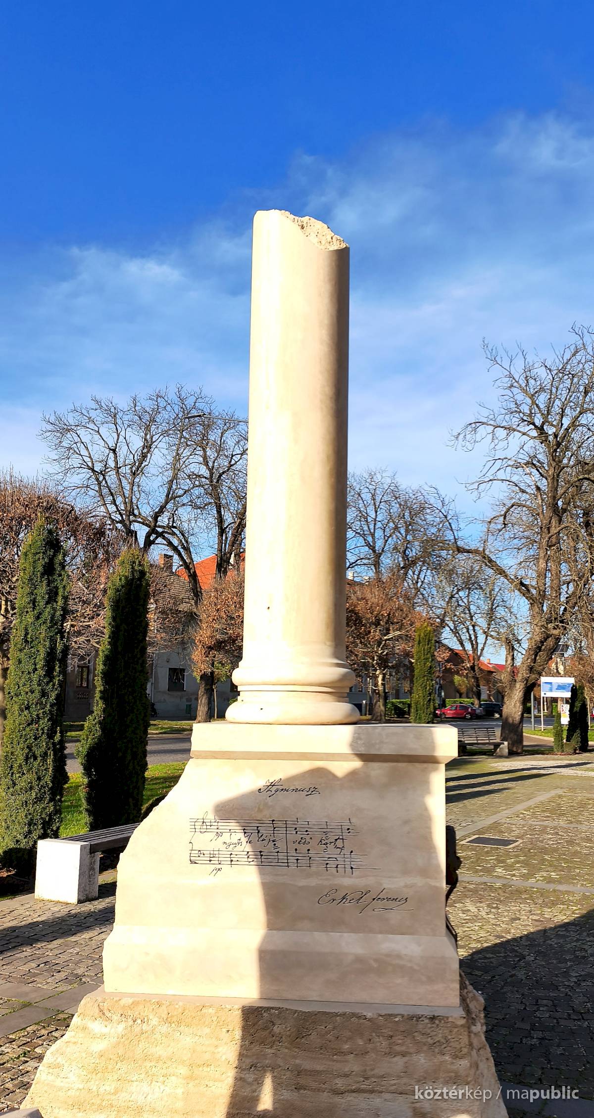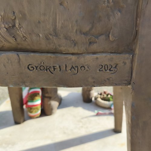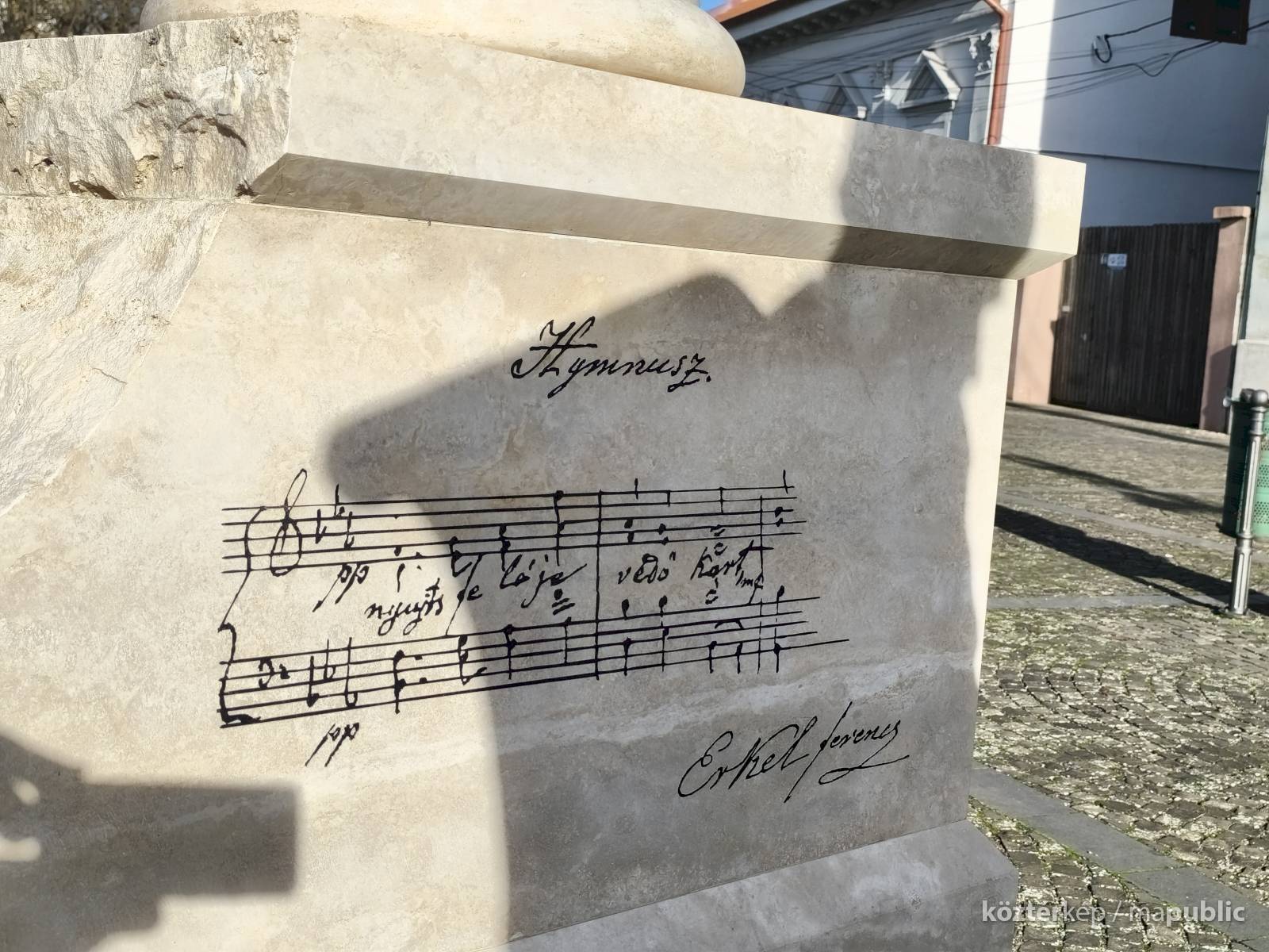 ... A helyszínen jelen volt a Kölcsey-szobor megalkotója, Győrfi Lajos szobrászművész is. A Maszolnak elmondta, a szoboralkotás során arra törekedett, hogy a formáknak belső kisugárzása legyen, hogy a testtartásból látszódjon, milyen ember is volt Kölcsey, akinek kezében egy pergamen van, amire a Himnusz második sorát vésték. „Nekem a Himnusz csak Kölcsey versével nem teljes, ezért a szobor mögött álló oszlopra felvéstem Erkelnek a kottáját” – tette hozzá." [3]
