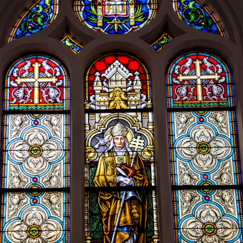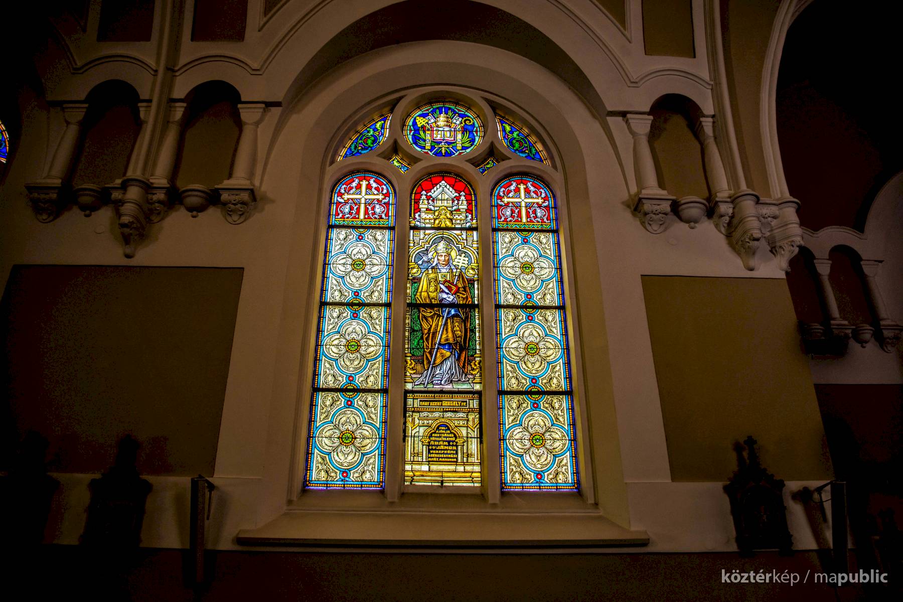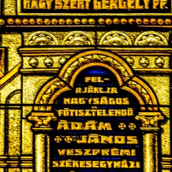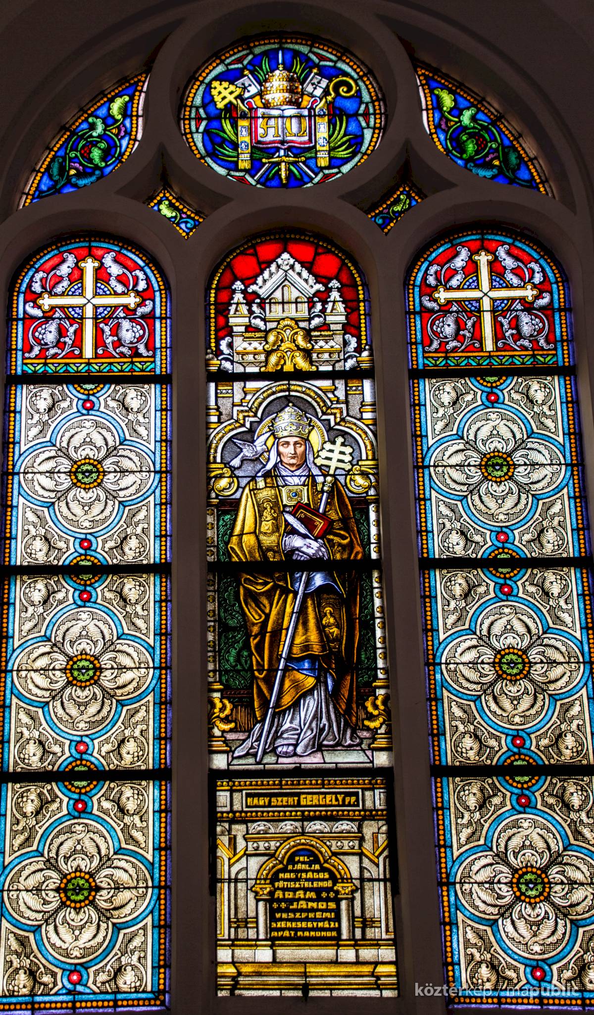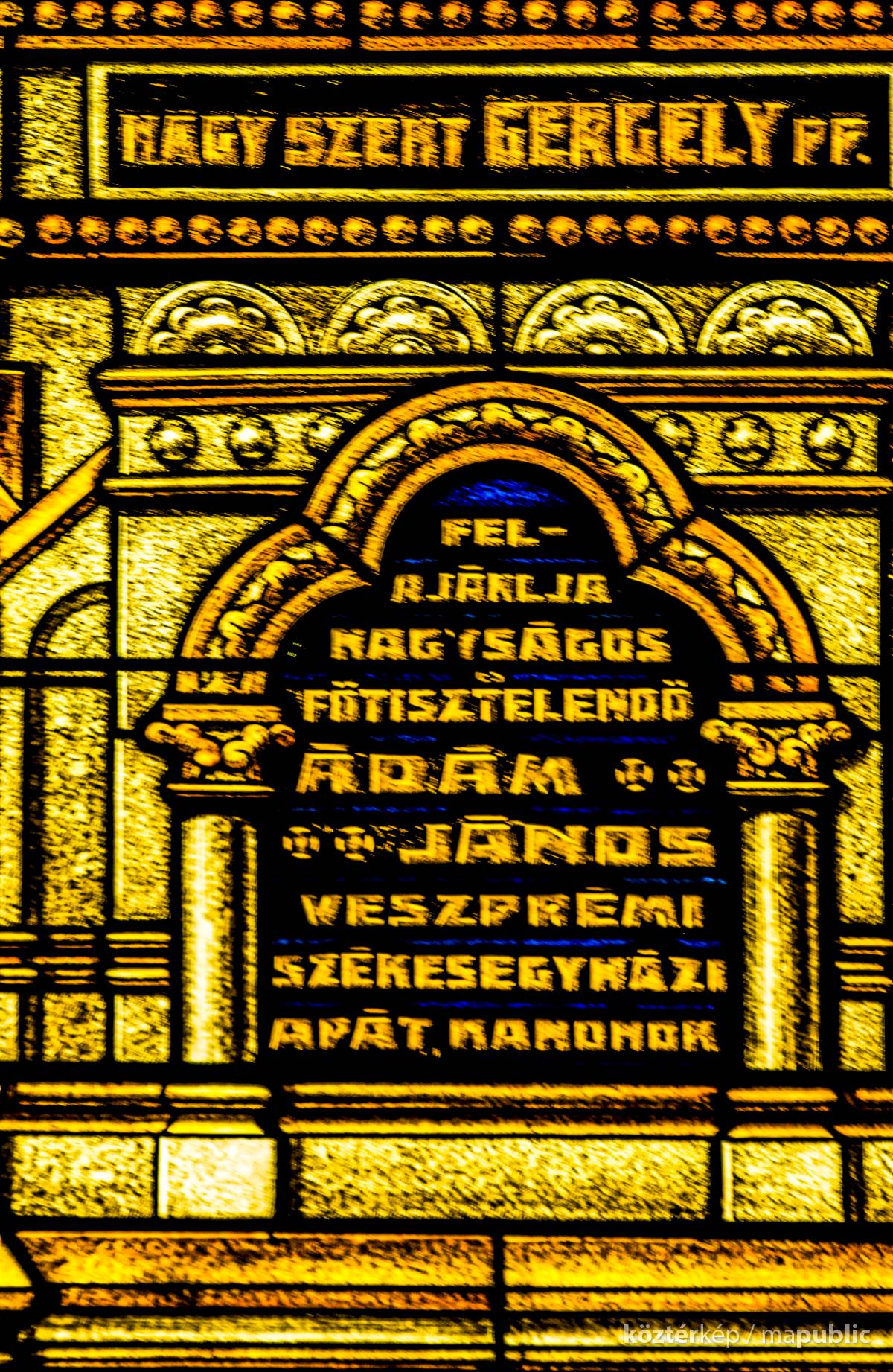 Nagy Szent Gergely pápát és egyháztanítót ábrázoló ablakon olvasható felirat szerint Ádám János veszprémi székesegyházi apát, kanonok ajánlotta fel.