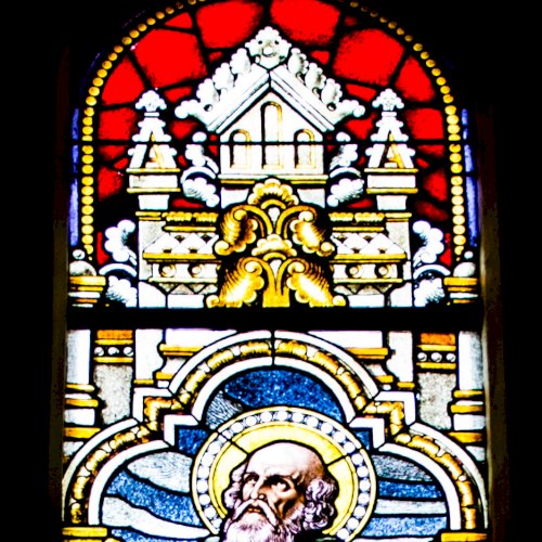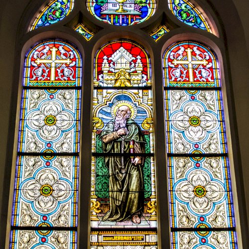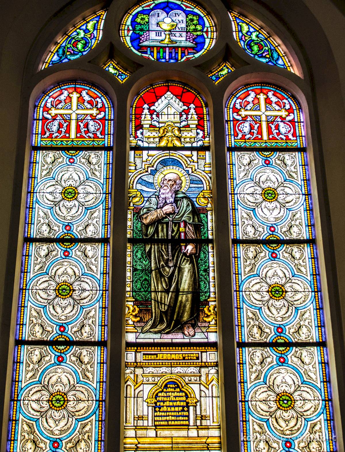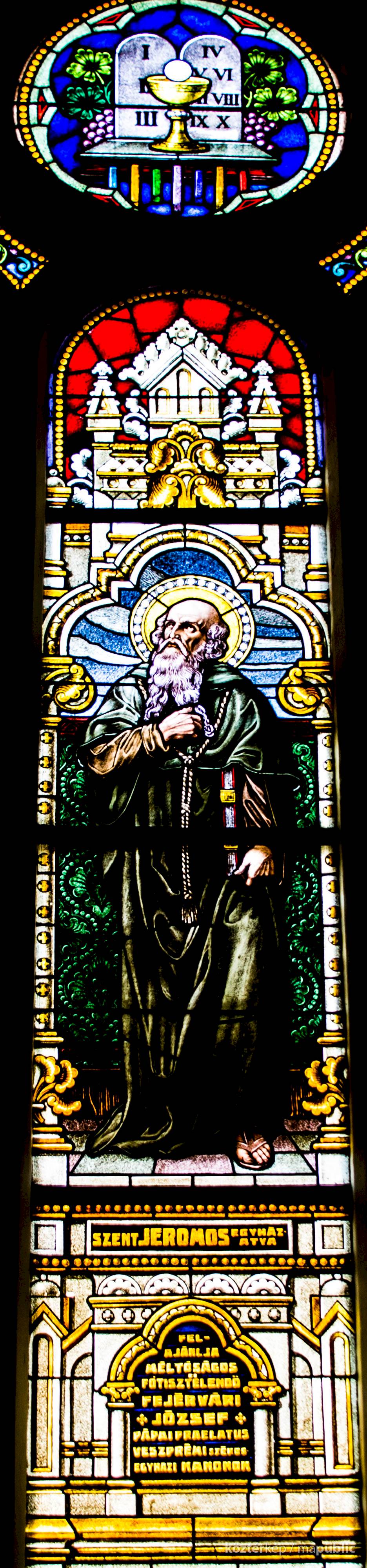 Szent Jeromost ábrázoló ablakon olvasható felirat szerint Fejérvári József pápai prelátus veszprémi székesegyházi kanonok ajánlotta fel.