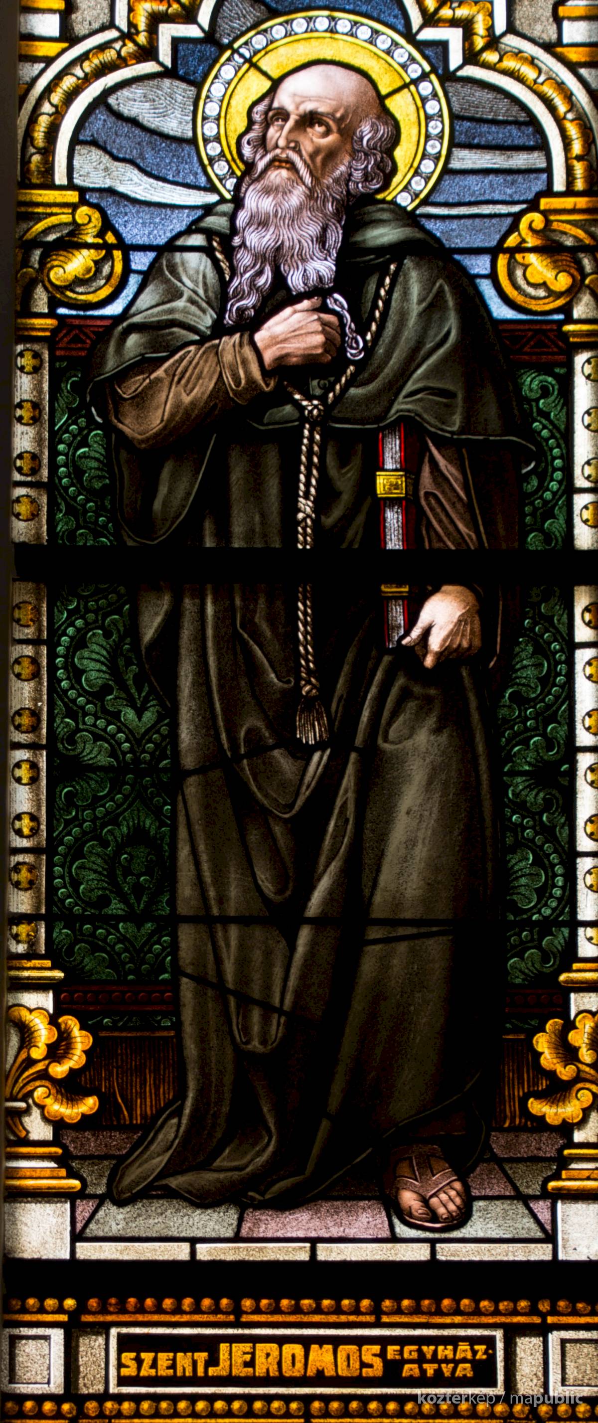 „Szent Jeromos egyháztanító, latin nevén Sophronius Eusebius Hieronymus, a fordítók, a könyvtárosok, a levéltárosok és a régészek védőszentje Kr. u. 347-ben született tehetős keresztény szülők gyermekeként, a gótok által később leigázott Stridon városában, Dalmácia és Pannónia határán. Az egzegézis tudományának atyjaként a művein keresztül utat mutatott a Szentírás olvasása, fordítása és értelmezése, valamint az egyházi latin nyelvhasználat felé.”[5]