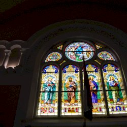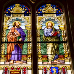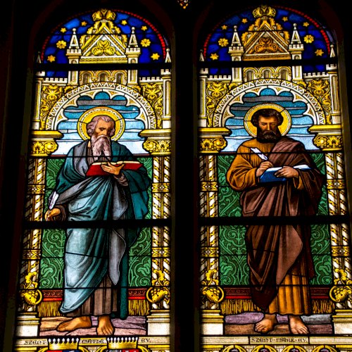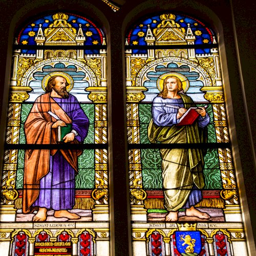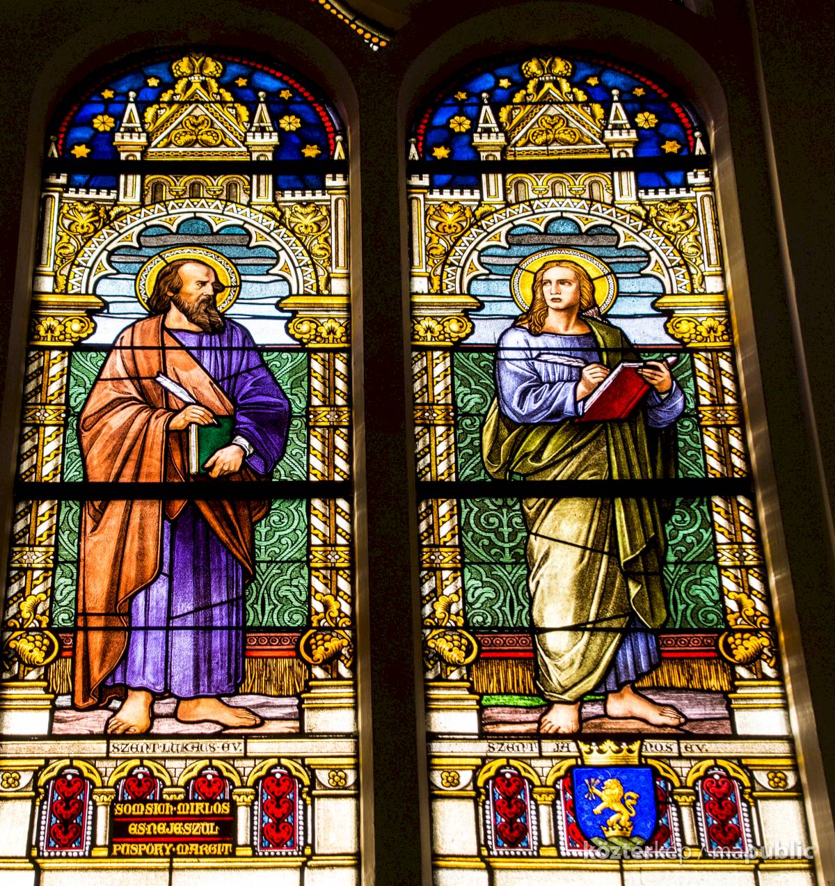 Szent Lukács és Szent János evangélista üvegablakát Somsich Miklós és felesége Püspöki Margit adományozta.