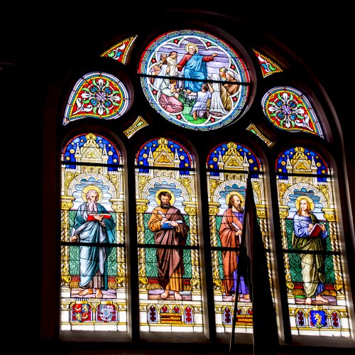Az Örvendetes olvasó ablakkal átellenben, megegyező méretben a négy evangélista, Máté, Márk, Lukács és János ábrázolását látjuk.