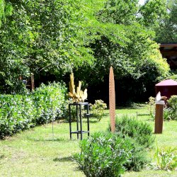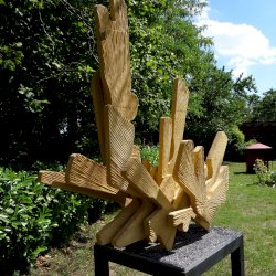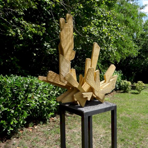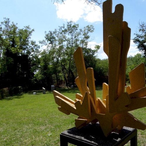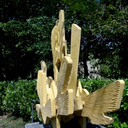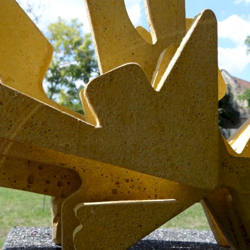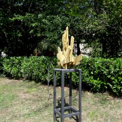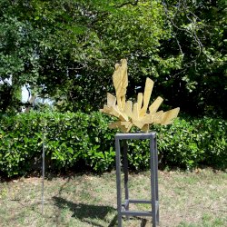 Mindák Gergely betonszobrász a szoborpark állandó tagja, szinte minden évben szerepelt sajátos szemléletű és speciális anyagból megmunkált alkotásaival. Kiindulópontja a természet, és formavilága, kutatja "azokat a részleteket, arányokat, struktúrákat, amelyek egyszerre jelentenek kihívást és inspirációt az általa használt anyag számára". 2025-ös alkotásának specialitása, hogy egy, a kertben (itt) lévő ginkgó fa adta az ihletet, mert az évek során levelei, rajzolata és érdekes szimmetriája foglalkoztatta.