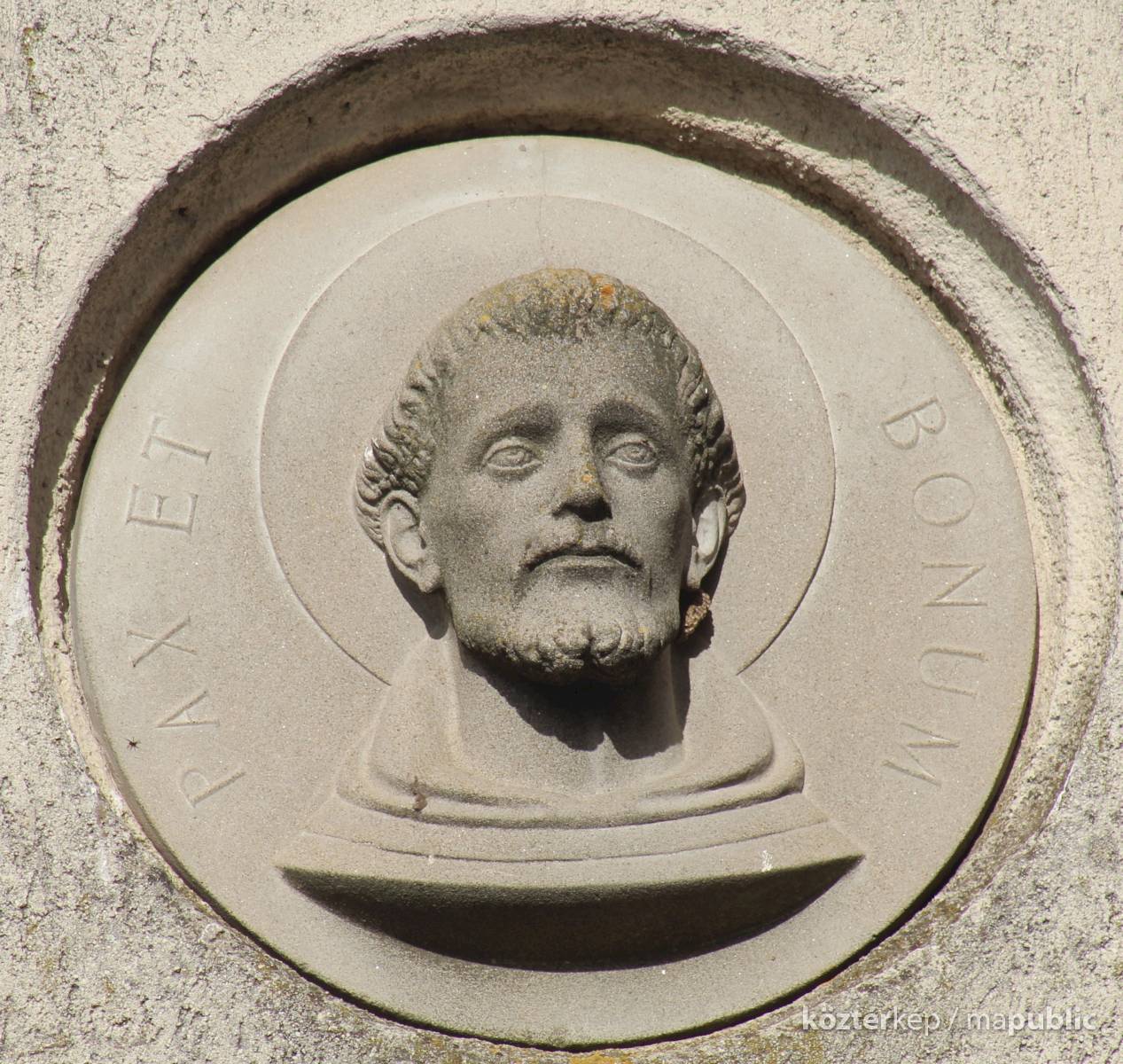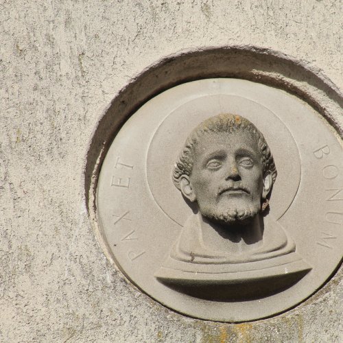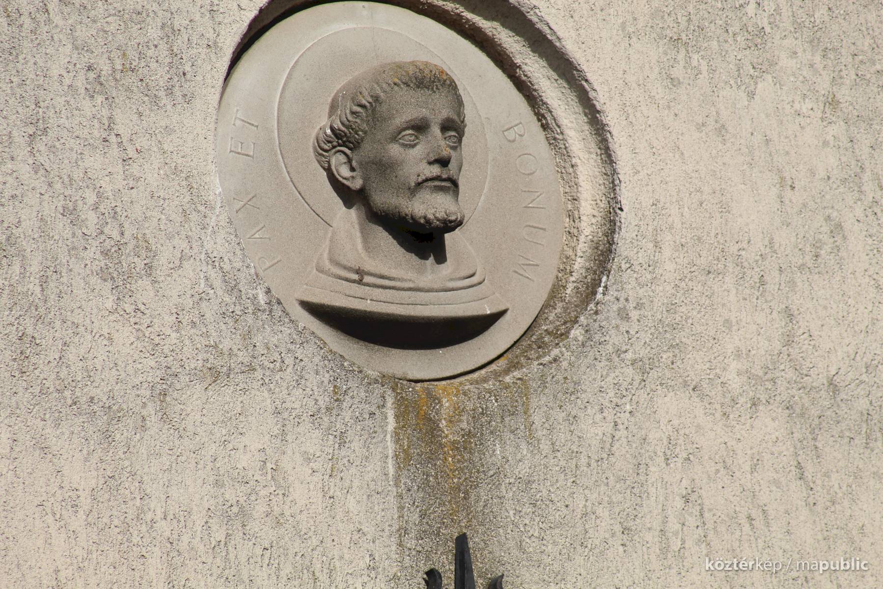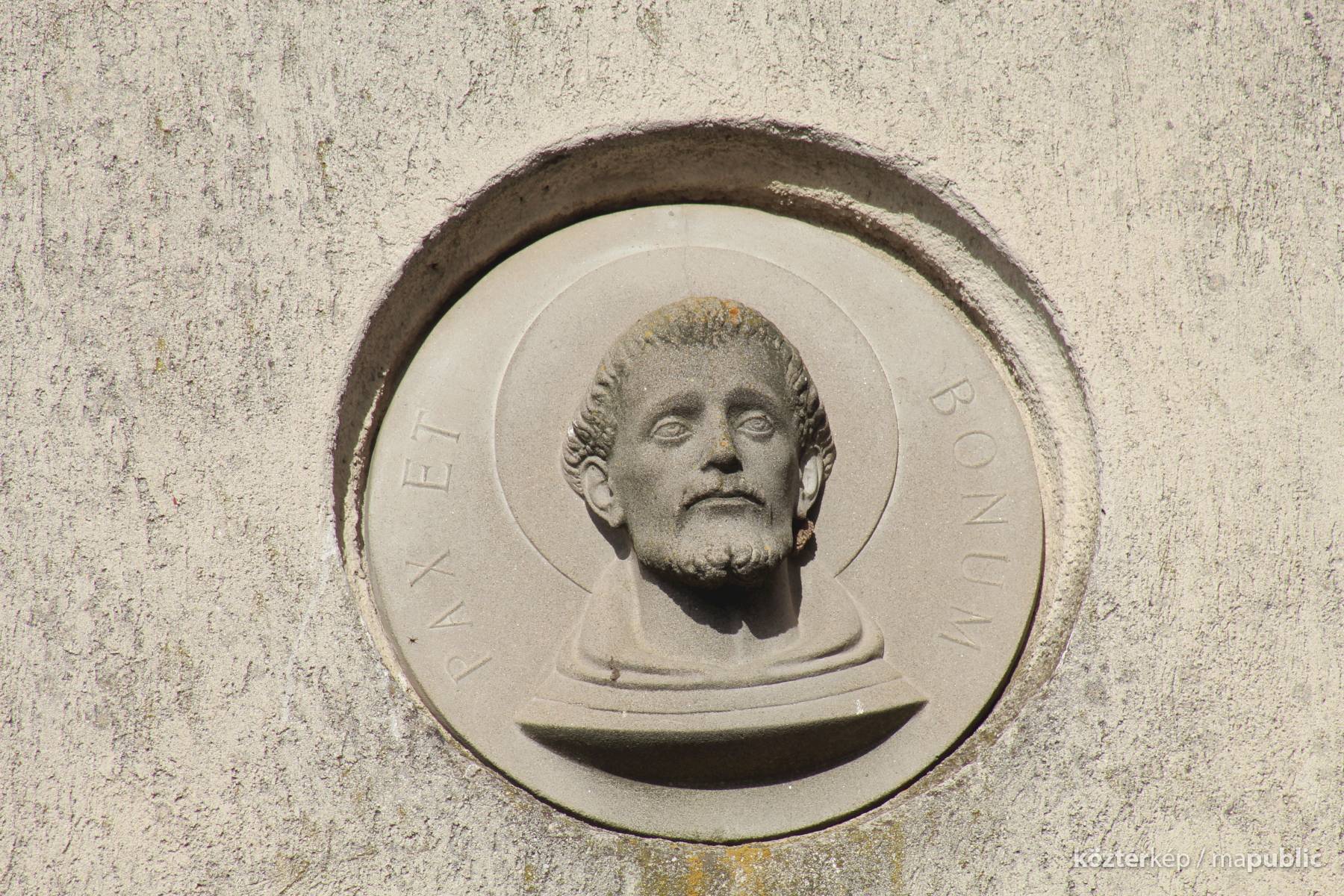 A kolostor külső falán felfigyeltem egy szép domborműre. A Ferences rend alapítójának, Assisi Szente Ferencnek domborművére, és jelmondatára. Kerek mélyedésben látható az életnagyságnál nagyobb dombormű, mely a szent fejét ábrázolja, fiatal kopasz szakállas férfit. Feje körül a Ferencesek jelmondatának vésete olvasható: Pax et Bonum, Béke és Jóság