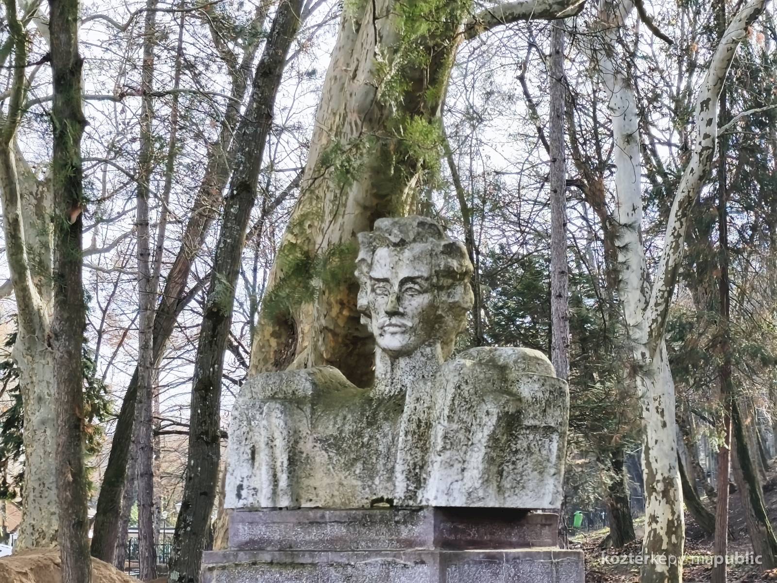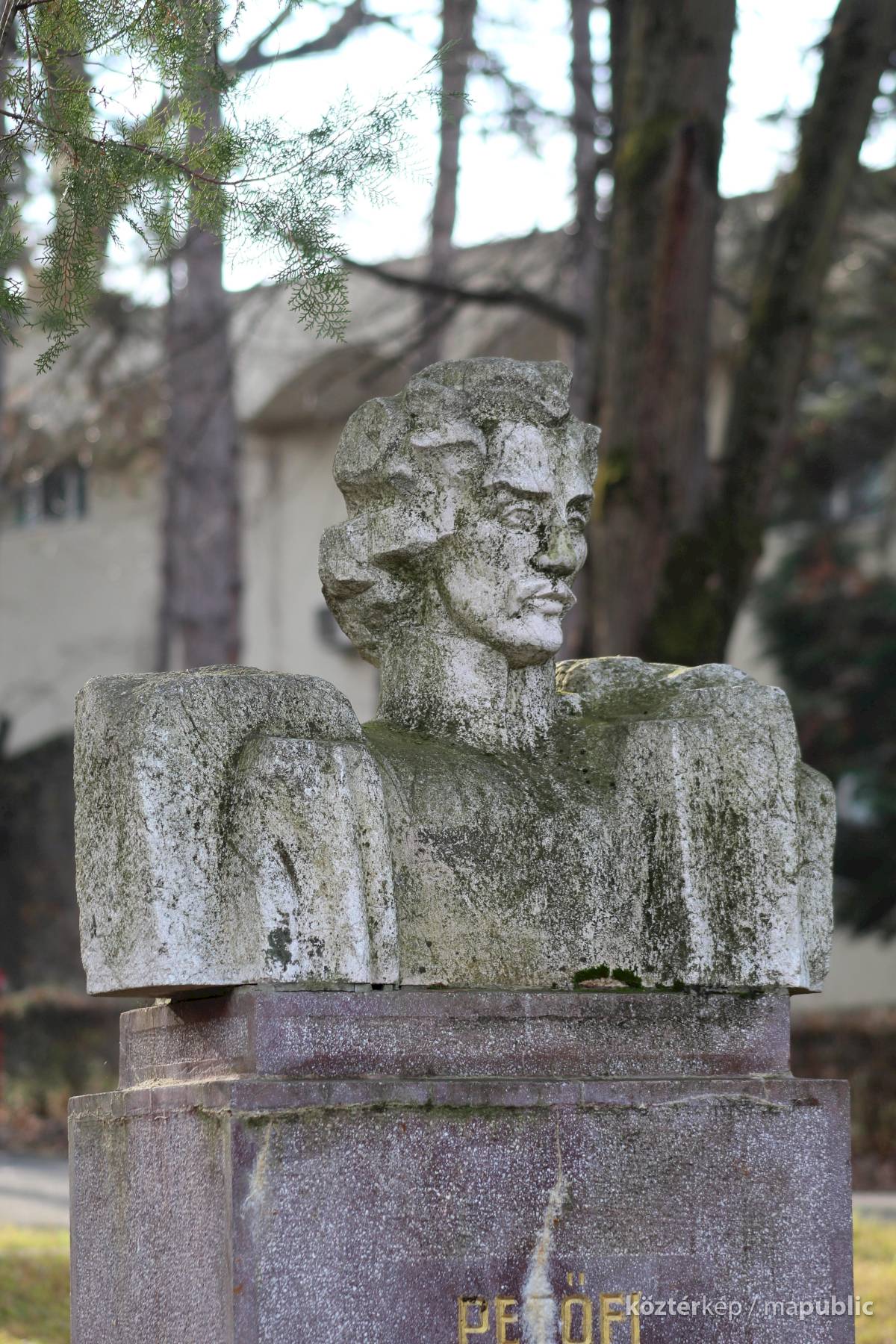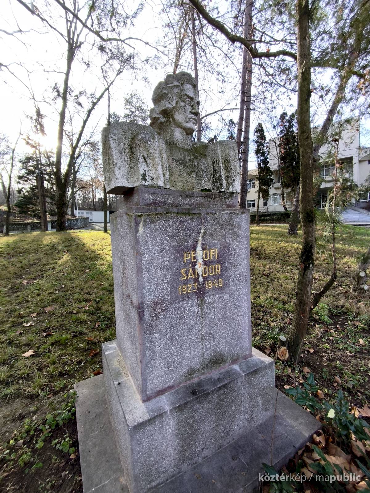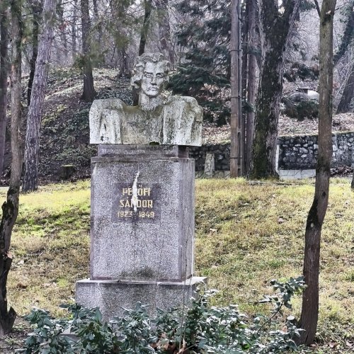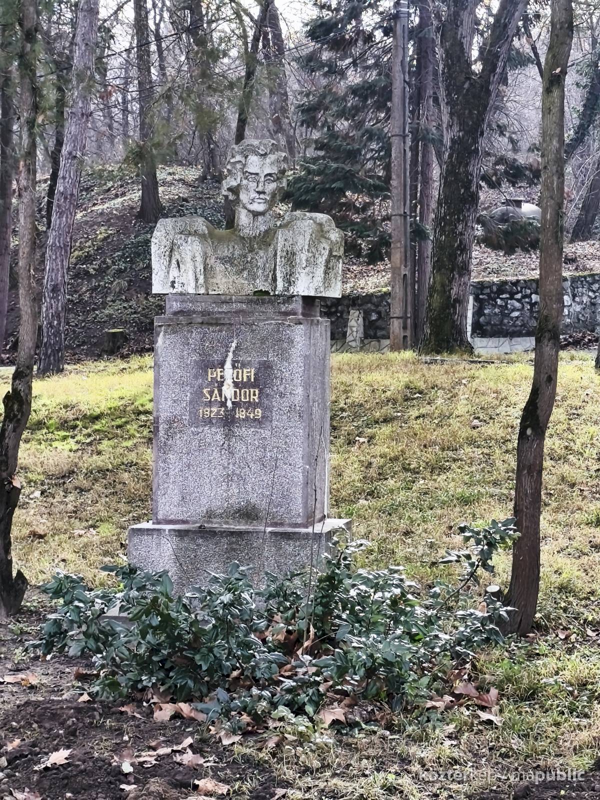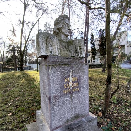 Tehát Petőfi Sándor költőnk állítólag ide járt gyógykezeltetni magát, élvezve a gyógyvíz jótékony hatását. Ennek emlékére avatták fel a faragott mészkőszobrot, mely egy sérült, vörösre színezett műkő talapzaton áll. Érdekes megmunkálás, durva vonások jellemzik az alkotást, de a fej profilból felismerhető. A költőt stilizált zubbonyban, magas gallérral, hosszú göndör fürtökkel ábrázolta a szobrász, Rodica Stanca Pamfil, [2] alkotói szignót nem találtam rajta. A művésznő oldalán olvashatjuk, hogy a mellszobrot 158cm széles, 110 cm magas, és 155 cm vastag kőből faragta. A talapzaton elöl egy nagy repedés, arany betűkkel festett név és évszámok olvashatók rajta.
